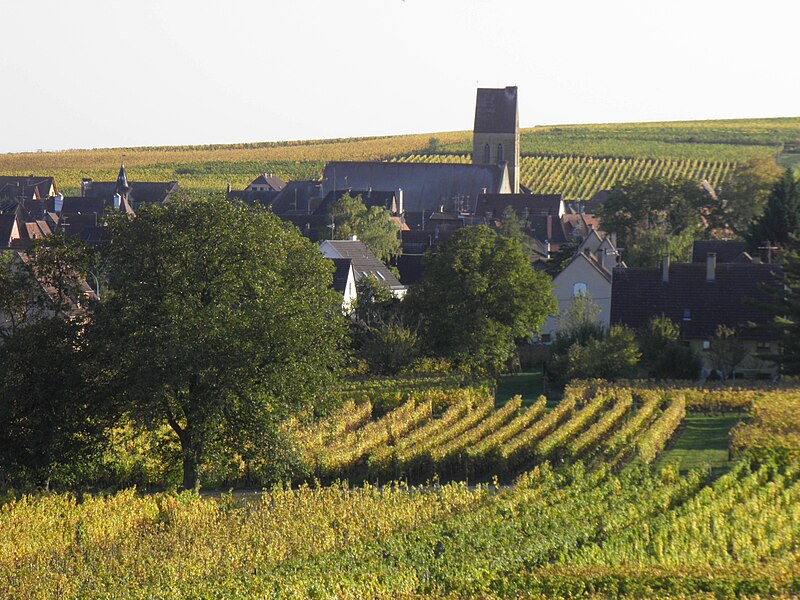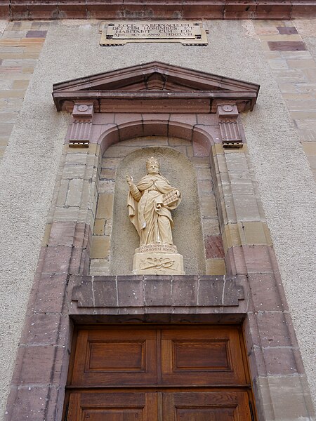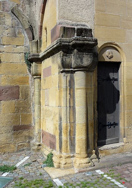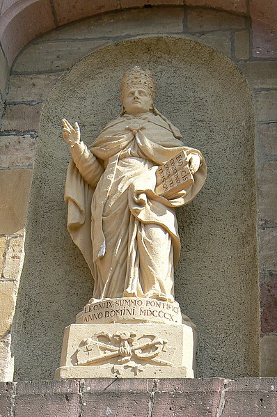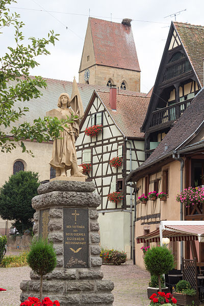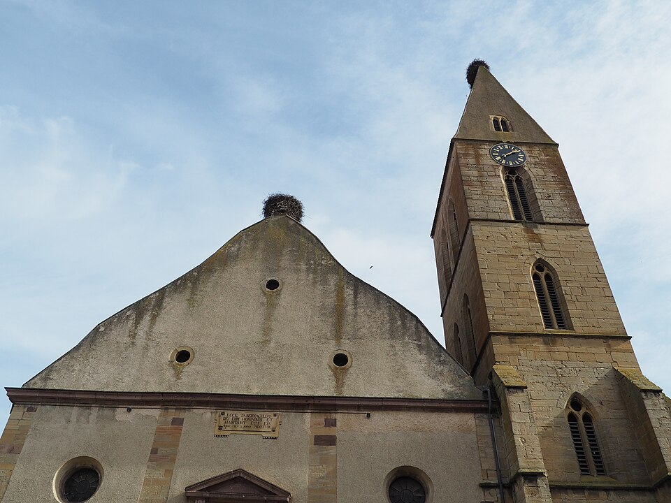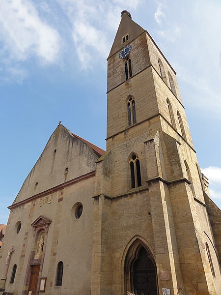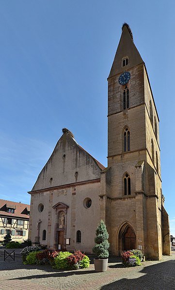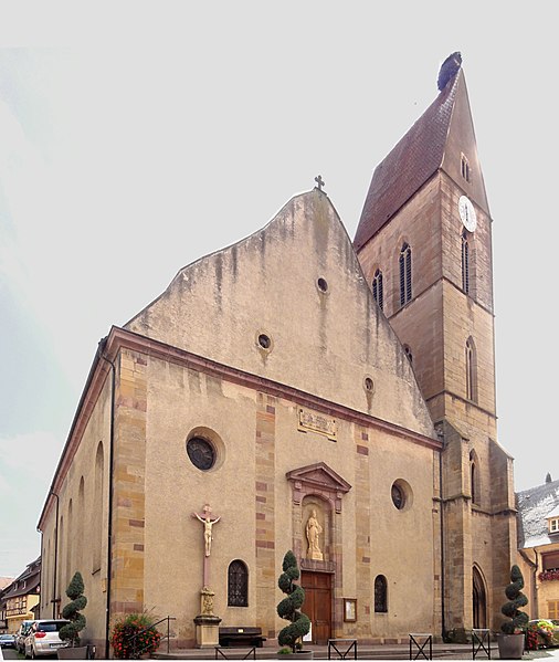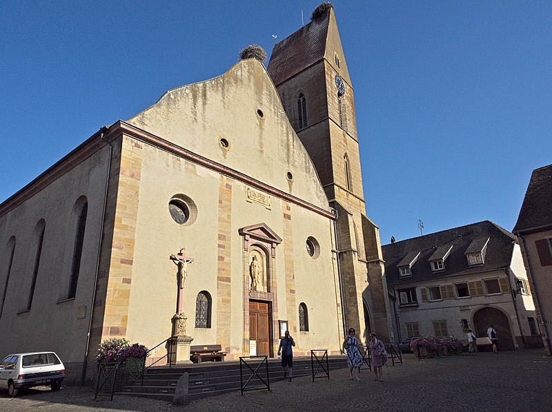 L'église catholique Saints‑Pierre‑et‑Paul se situe place de l'Église à Eguisheim, dans le Haut‑Rhin. La première église du site remonterait au XIe siècle ; aux XIIe et XIIIe siècles on y édifia une basilique romane à trois nefs et une tour. La paroissiale élevée vers 1230 fut en grande partie démolie en 1807 ; la nouvelle nef, qui porte la date 1808, fut achevée l'année suivante, en 1809. Cette reconstruction, rendue possible par une donation de Joseph et Anne Marie Boll, fut conduite par les ingénieurs Messier et Gouget ; la direction des travaux fut confiée à Gouget, ingénieur des ponts et chaussées, sans certitude sur son rôle d'auteur du projet, et les travaux furent adjugés au maître maçon Joseph Huniger de Hattstatt. Le clocher, conservé et accolé au mur sud de la nef, abrite un portail monumental sculpté daté du XIIIe siècle ; ce portail, qui ouvrait sur l'ancienne nef, est aujourd'hui obstrué par un mur. Deux escaliers en vis adossés au mur permettent d'accéder à l'étage du clocher, lequel communiquait autrefois avec la nef par trois fenêtres en plein cintre. De l'édifice médiéval subsistent principalement le clocher‑porche avec ses ouvertures méridionales et orientales, un pilier composite au sud‑est formé de colonnes à chapiteaux cubiques et les départs d'ogives. L'église détruite présentait autrefois un clocher‑porche flanqué de deux travées, une nef de quatre travées, un transept saillant avec deux absidioles dans le mur est et un chœur à abside demi‑circulaire. Au XIXe siècle, le mobilier de l'église fut complété progressivement, et en 1954 de nouveaux vitraux furent posés à l'occasion du 900e anniversaire de la mort de saint Léon IX, pape originaire d'Eguisheim. L'édifice bénéficie d'une protection au titre des monuments historiques, par inscription en 1933 et par classement en 1934. Architectoniquement, la tour se rattache aux XIIIe et XIVe siècles, le portail intérieur de la tour datant du deuxième quart du XIIIe siècle.