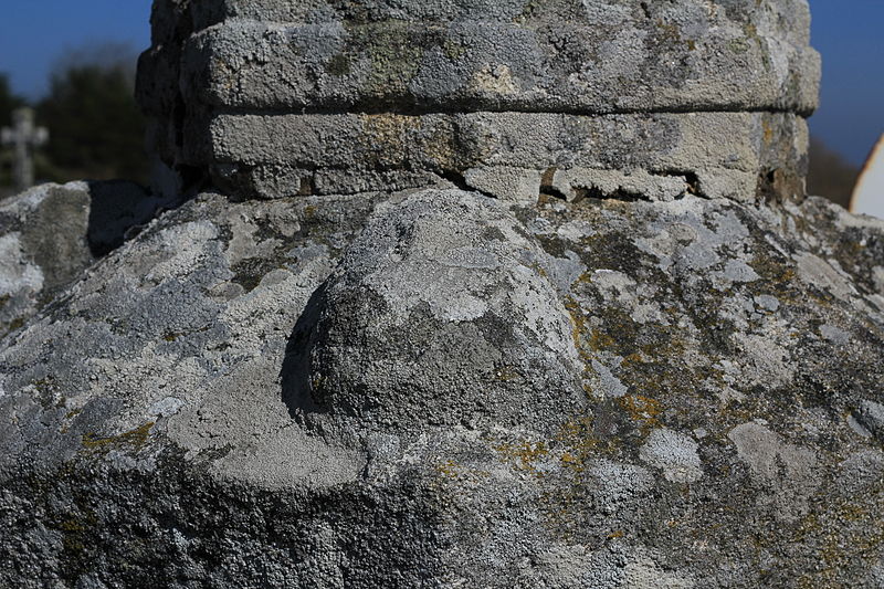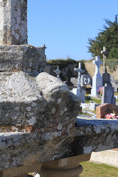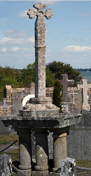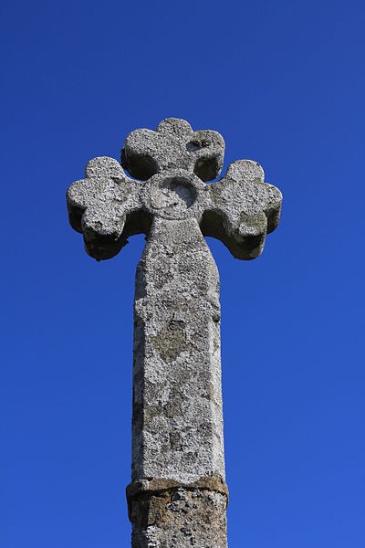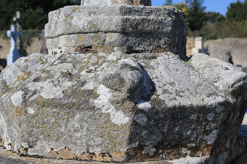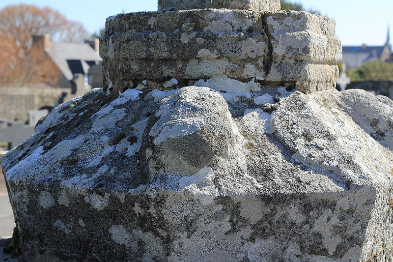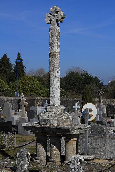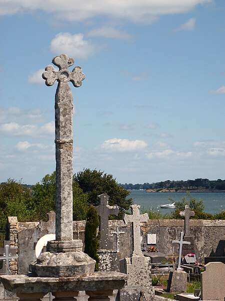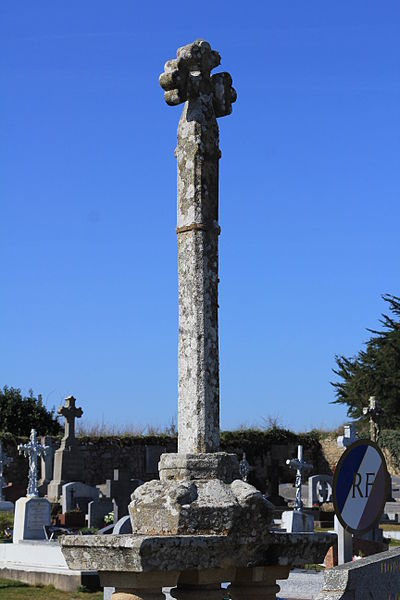 La croix de cimetière, située dans le Morbihan et transférée de l'ancien au nouveau cimetière, est mentionnée comme érigée au bourg de Locmariaquer. Elle se compose d'une table portée par trois colonnettes trapues alignées sur un même rang, reposant sur un socle octogonal à facettes en talus. Le fût en pierre est couronné d'une croix tréflée et le socle présente des figures sculptées. Le soubassement pourrait dater du XVIIe siècle, tandis que la partie supérieure semble plus ancienne. Cette croix fait l'objet d'une inscription au titre des monuments historiques depuis le 9 décembre 1939. La notice renvoie également à des ressources et portails consacrés aux petits calvaires de Locmariaquer et aux monuments historiques du Morbihan.