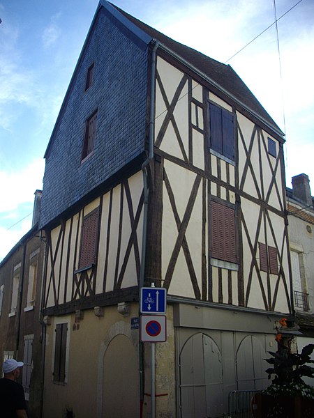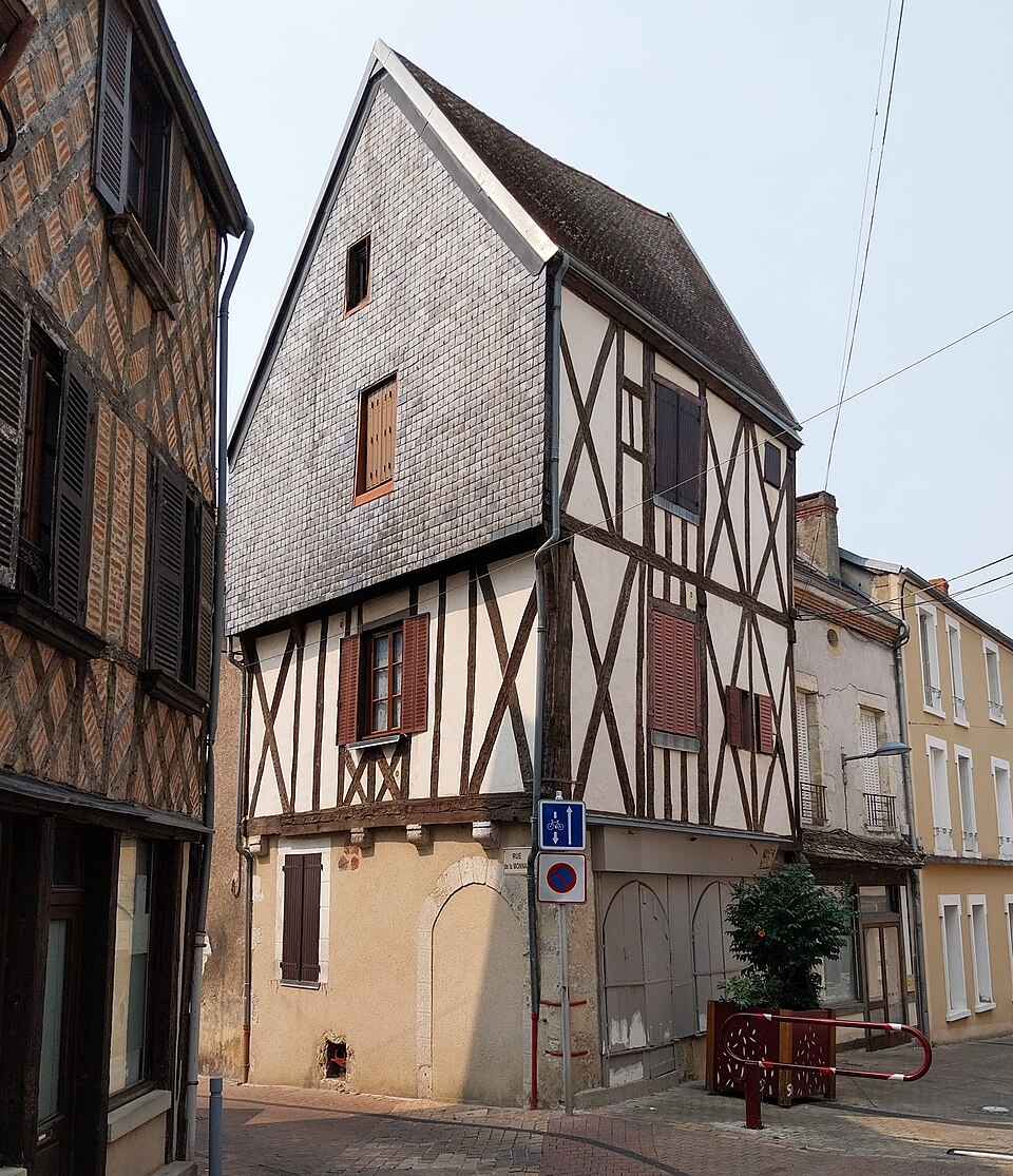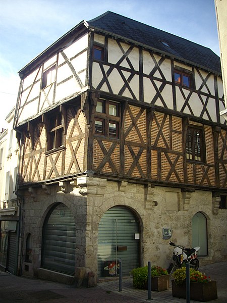 Maison d'angle à pans de bois à croisillons garnis de briquetage, présentant onze rangées de croisillons par étage. Chaque étage est en encorbellement, en saillie. L'encorbellement du premier étage est supporté par des consoles de pierre formées de trois corbeaux en quart de rond superposés. À l'étage supérieur, les consoles sont en bois et disposées comme des jambes de force. La charpente, ainsi que la pente et son bris, ont été modifiés ; elle repose sur pannes et non sur chevrons faisant ferme. Plusieurs fenêtres sont à croisées de bois et l'une d'elles a conservé son appui sculpté et mouluré.