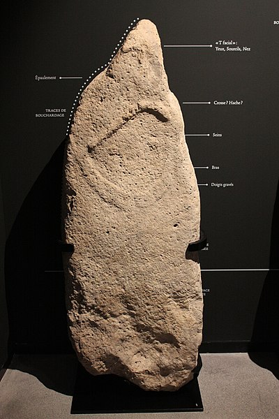 La première statue, reconnue comme telle par Lombard‑Dumas, gisait à plat et bouchait l'entrée d'un hypogée. Il s'agit d'une dalle en grès oligocène sculptée en faible relief sur une seule face, mesurant 1,75 m de hauteur, 0,70 m de largeur et 0,15 m d'épaisseur. Le visage, en forme de « T », indique sourcils, yeux et nez ; les bras partent des sourcils en position verticale puis se recourbent aux coudes. L'arc de cercle issu des extrémités de la barre horizontale du « T » est interprété comme un collier entourant deux mamelons figurant les seins. Jean Arnal a signalé une pendeloque en double spirale rattachée au collier, visible uniquement en lumière rasante. Sous les avant‑bras apparaît un objet en forme de crosse, presque horizontal, interprété comme une hache emmanchée.