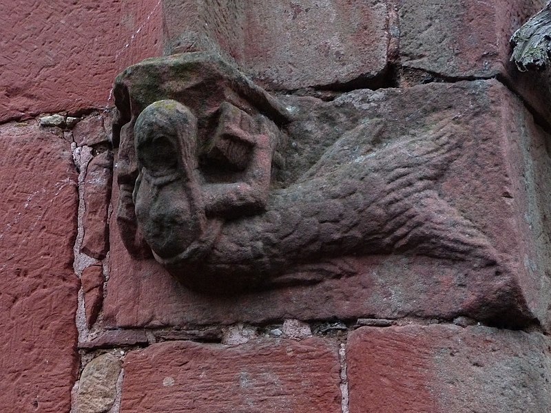 Maison à rez-de-chaussée dotée d'un porche et d'un passage couvert, le premier étage présente un encorbellement avec pan de bois apparent. La porte d'entrée, moulurée et datée du XVe siècle, est surmontée d'une petite croisée à accolade ; le bandeau mouluré qui l'accompagne se termine par deux culs-de-lampe, dont l'un représente une sirène. Au‑dessus du cintre surbaissé du passage couvert se trouve une ouverture à croisillons. Un escalier circulaire en pierres rouges dessert les niveaux.