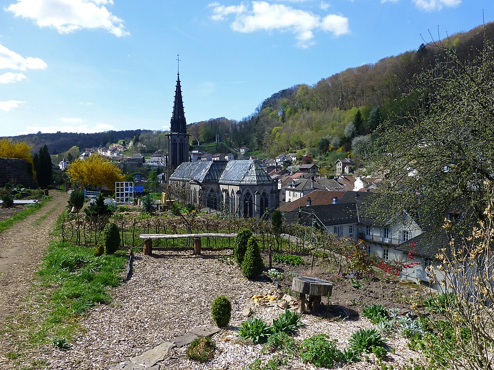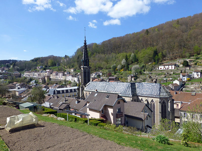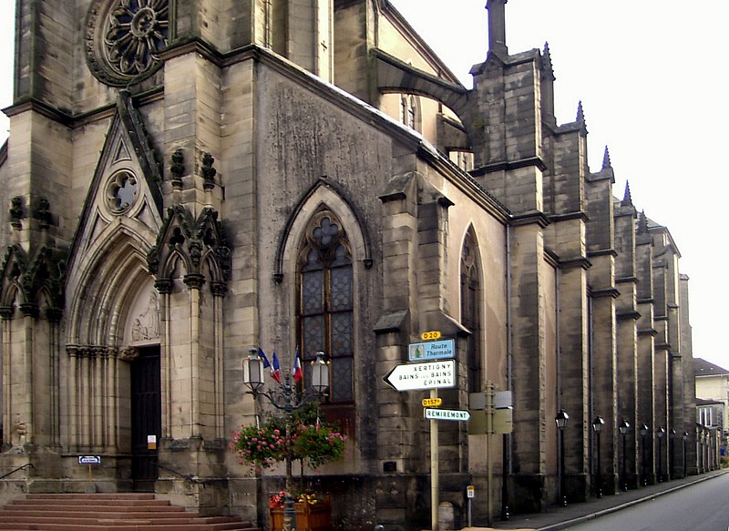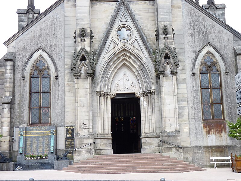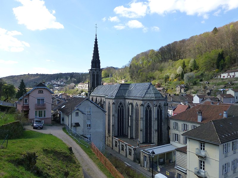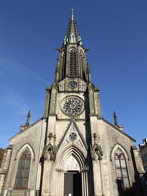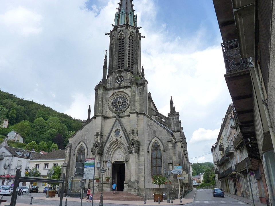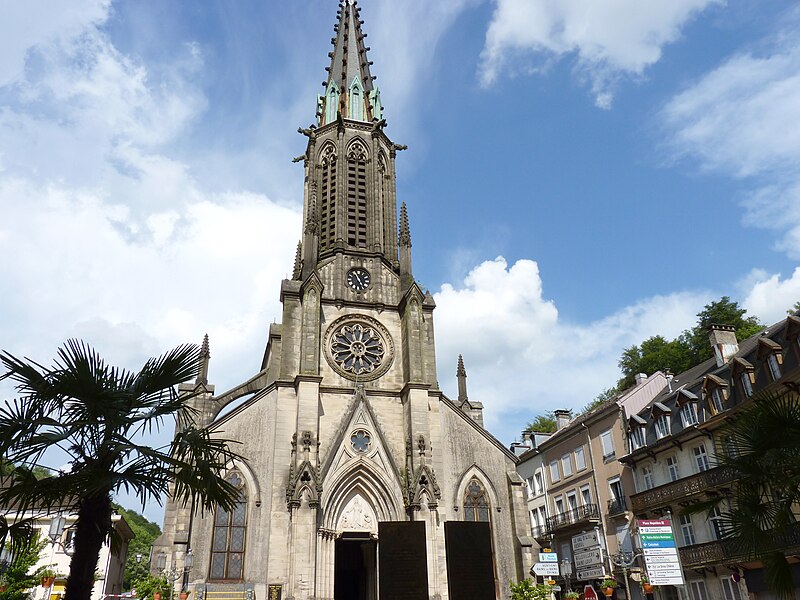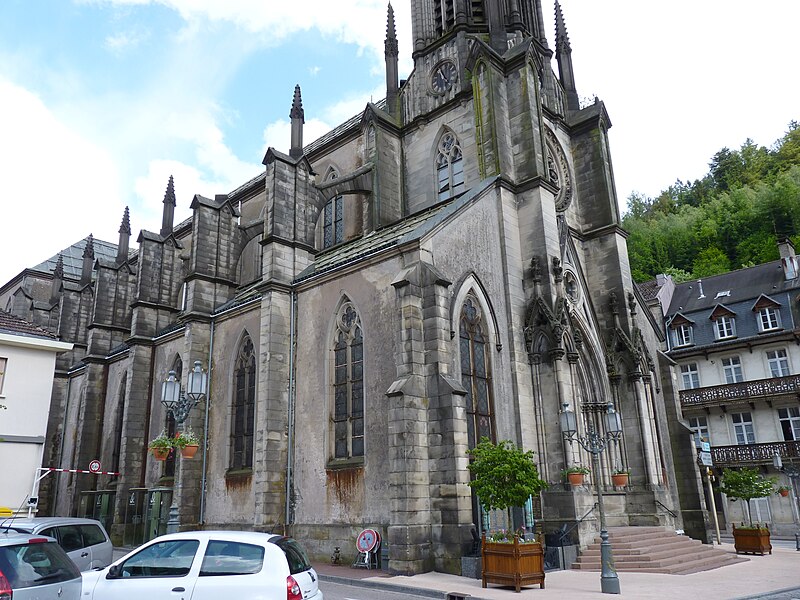 L'église Saint-Amé, ou Saint-Amé-et-Saint-Blaise, est l'église paroissiale de Plombières-les-Bains (Vosges). Elle dépend du diocèse de Saint-Dié et constitue l'une des trois églises de la paroisse Notre-Dame-des-Sources, avec Ruaux (Saint Jean-Baptiste) et Bellefontaine (Saint-Blaise), toutes gérées par un prêtre modérateur. Une chapelle fondée en 1390 desservit la paroisse pendant trois siècles et demi, puis une première église paroissiale, de taille modeste, fut édifiée en 1729 pour remplacer l'édifice primitif devenu ruiné au début du XVIIIe siècle. L'édifice actuel a été reconstruit entre 1857 et 1860 sur un projet de l'abbé Balland et de l'architecte Léon-Charles Grillot, avec l'aide financière de l'empereur Napoléon III et l'avis consultatif d'Eugène Viollet-le-Duc. Dès 1849 la première église fut jugée vétuste et trop exiguë, ce qui entraîna des démarches pour estimer et financer les travaux, notamment une demande de devis et l'autorisation en 1852 d'organiser une loterie finalement tenue en 1856 accompagnée d'une souscription. Malgré des oppositions locales à la dépense, la municipalité sollicita l'empereur, qui approuva la construction sur la rive gauche de l'Augronne, offrit 5 000 francs et participa à l'acquisition de maisons et terrains pour 112 640 francs. La tour-clocher ne fut achevée qu'en 1860, grâce à une aide personnelle de l'empereur ; le maître-autel fut consacré le 18 août 1863 par Mgr Caverot ; la sculpture du portail fut réalisée en 1864 par le sculpteur Maguin et la tribune d'orgue agrandie en 1882 selon des plans de l'architecte Curvat ; l'ameublement complet ne fut achevé qu'en 1905. Le style retenu est un néogothique inspiré du XIVe siècle, en remplacement d'un avant-projet roman. L'édifice adopte un plan basilical ogival, construit principalement en pierre de taille de grès vosgien, avec une élévation intérieure à trois vaisseaux : un vaisseau central qui débouche sur les grandes verrières du chœur et deux nefs latérales plus basses couvertes de voûtes d'ogives. Le transept, de la même hauteur que la voûte principale et formant une croix, libère à l'avant-chœur un volume remarquable. Selon le devis de Grillot, l'édifice mesure 58 mètres de longueur, 16,50 mètres de largeur et 18,50 mètres de hauteur sous voûte, et la flèche culmine à 61 mètres où figure une couronne impériale. La façade occidentale, les contreforts, arcs-boutants et piles sont en pierre de grès ; les voûtains sont en brique ; les bas-côtés sont couverts de toits en appentis, et le chœur ainsi que les bras du transept présentent des croupes, dont une polygonale sur le chœur. La flèche, polygonale, est munie d'arêtiers en fonte ; les pinacles et chapiteaux portent des décors végétaux et des gargouilles ornent la tour-clocher. Le bâtiment reste fragile en raison de la pierre friable, sensible au climat et à la pollution, ce qui impose un entretien constant et exigeant. L'église bénéficie d'une protection au titre des monuments historiques depuis 1995, son inscription à l'inventaire supplémentaire datant du 20 juillet 1995 et faisant suite au classement de l'ensemble du mobilier en mai 1982. Une restauration complète de la toiture a été réalisée entre septembre 2017 et octobre 2019 grâce aux dons recueillis par l'Association de soutien à la restauration de l'église.