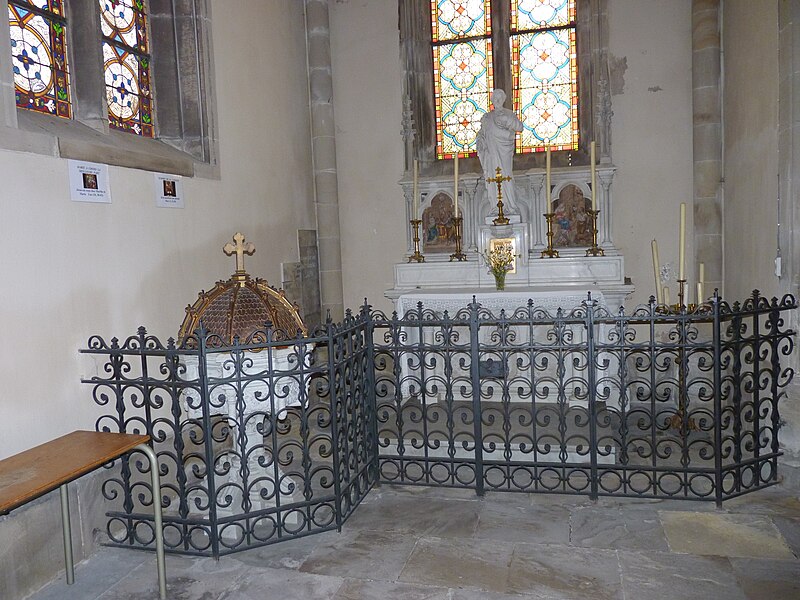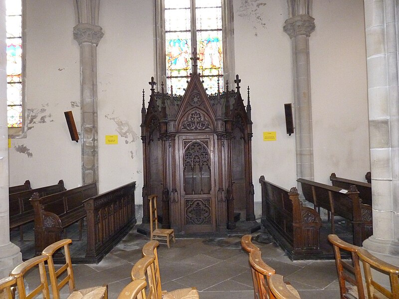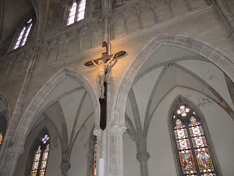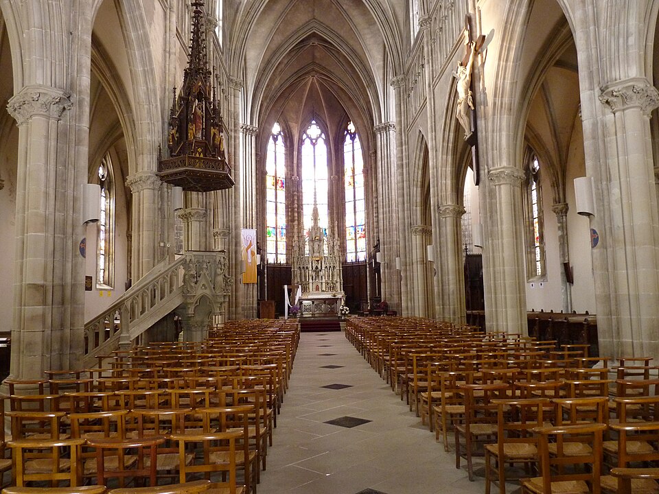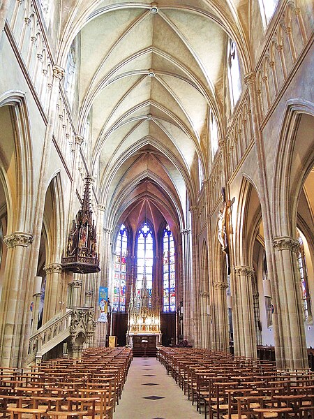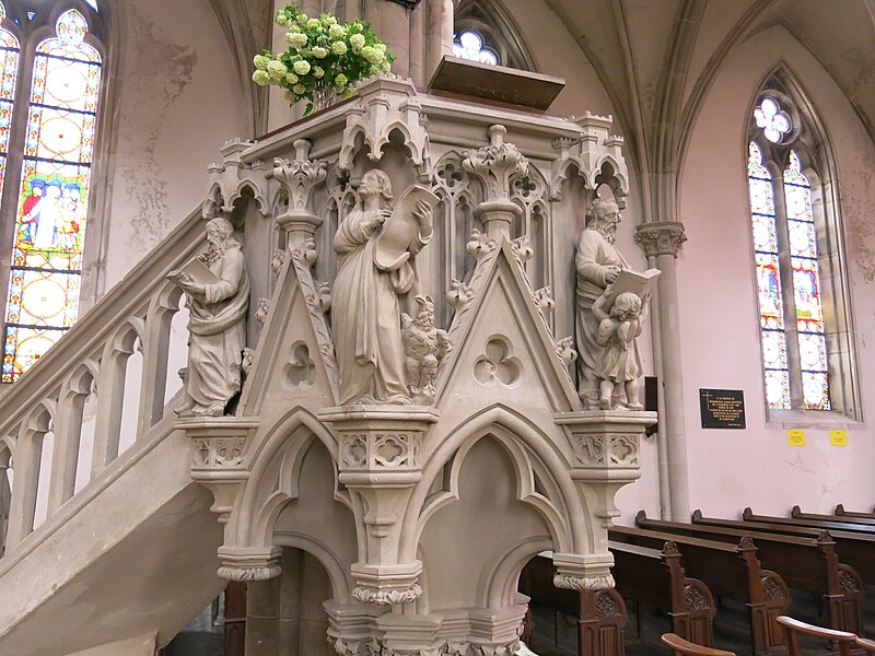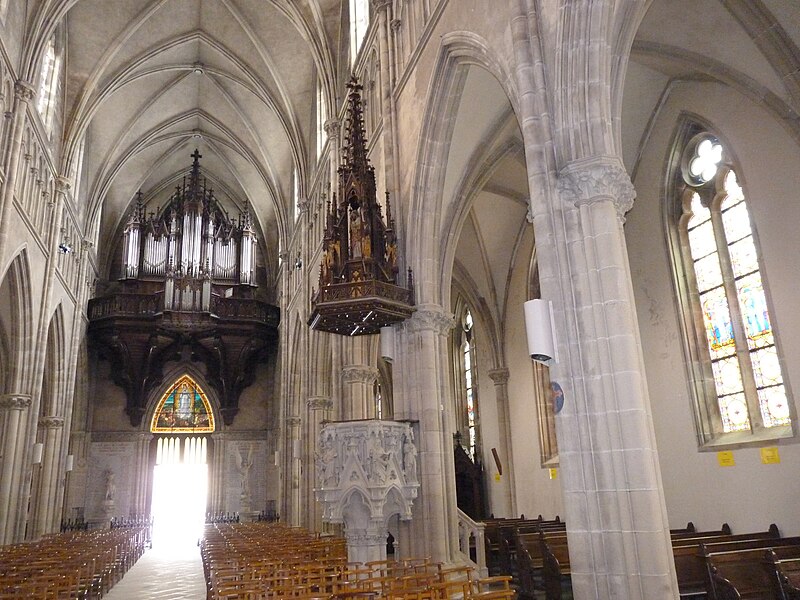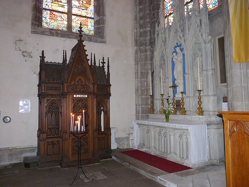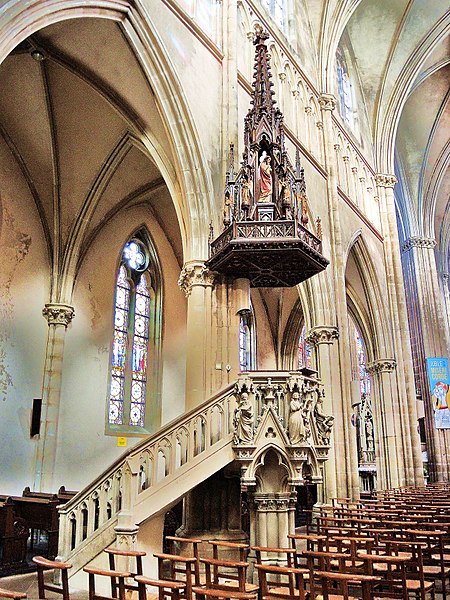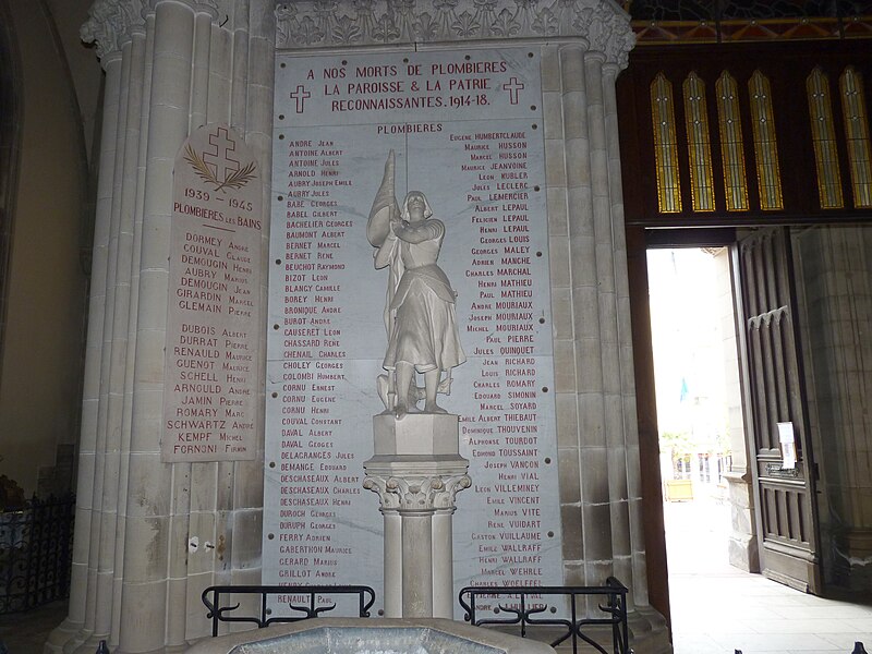 L'église Saint-Amé, ou Saint-Amé-et-Saint-Blaise, est l'église paroissiale de Plombières-les-Bains (Vosges). Elle dépend du diocèse de Saint-Dié et constitue l'une des trois églises de la paroisse Notre-Dame-des-Sources, avec Ruaux (Saint Jean-Baptiste) et Bellefontaine (Saint-Blaise), toutes gérées par un prêtre modérateur. Une chapelle fondée en 1390 desservit la paroisse pendant trois siècles et demi, puis une première église paroissiale, de taille modeste, fut édifiée en 1729 pour remplacer l'édifice primitif devenu ruiné au début du XVIIIe siècle. L'édifice actuel a été reconstruit entre 1857 et 1860 sur un projet de l'abbé Balland et de l'architecte Léon-Charles Grillot, avec l'aide financière de l'empereur Napoléon III et l'avis consultatif d'Eugène Viollet-le-Duc. Dès 1849 la première église fut jugée vétuste et trop exiguë, ce qui entraîna des démarches pour estimer et financer les travaux, notamment une demande de devis et l'autorisation en 1852 d'organiser une loterie finalement tenue en 1856 accompagnée d'une souscription. Malgré des oppositions locales à la dépense, la municipalité sollicita l'empereur, qui approuva la construction sur la rive gauche de l'Augronne, offrit 5 000 francs et participa à l'acquisition de maisons et terrains pour 112 640 francs. La tour-clocher ne fut achevée qu'en 1860, grâce à une aide personnelle de l'empereur ; le maître-autel fut consacré le 18 août 1863 par Mgr Caverot ; la sculpture du portail fut réalisée en 1864 par le sculpteur Maguin et la tribune d'orgue agrandie en 1882 selon des plans de l'architecte Curvat ; l'ameublement complet ne fut achevé qu'en 1905. Le style retenu est un néogothique inspiré du XIVe siècle, en remplacement d'un avant-projet roman. L'édifice adopte un plan basilical ogival, construit principalement en pierre de taille de grès vosgien, avec une élévation intérieure à trois vaisseaux : un vaisseau central qui débouche sur les grandes verrières du chœur et deux nefs latérales plus basses couvertes de voûtes d'ogives. Le transept, de la même hauteur que la voûte principale et formant une croix, libère à l'avant-chœur un volume remarquable. Selon le devis de Grillot, l'édifice mesure 58 mètres de longueur, 16,50 mètres de largeur et 18,50 mètres de hauteur sous voûte, et la flèche culmine à 61 mètres où figure une couronne impériale. La façade occidentale, les contreforts, arcs-boutants et piles sont en pierre de grès ; les voûtains sont en brique ; les bas-côtés sont couverts de toits en appentis, et le chœur ainsi que les bras du transept présentent des croupes, dont une polygonale sur le chœur. La flèche, polygonale, est munie d'arêtiers en fonte ; les pinacles et chapiteaux portent des décors végétaux et des gargouilles ornent la tour-clocher. Le bâtiment reste fragile en raison de la pierre friable, sensible au climat et à la pollution, ce qui impose un entretien constant et exigeant. L'église bénéficie d'une protection au titre des monuments historiques depuis 1995, son inscription à l'inventaire supplémentaire datant du 20 juillet 1995 et faisant suite au classement de l'ensemble du mobilier en mai 1982. Une restauration complète de la toiture a été réalisée entre septembre 2017 et octobre 2019 grâce aux dons recueillis par l'Association de soutien à la restauration de l'église.