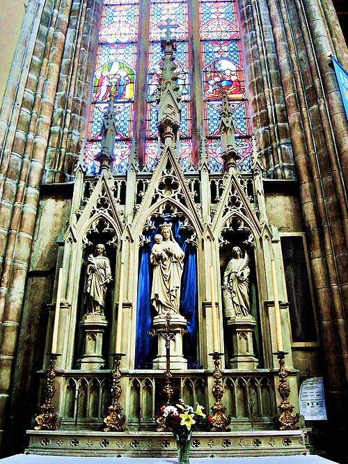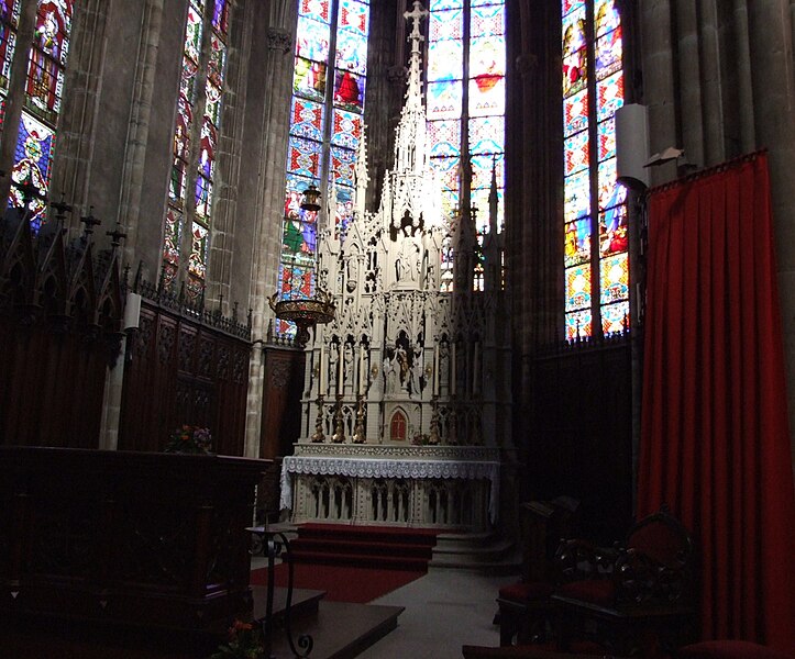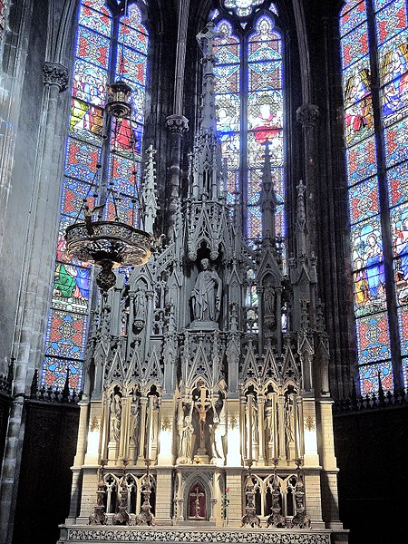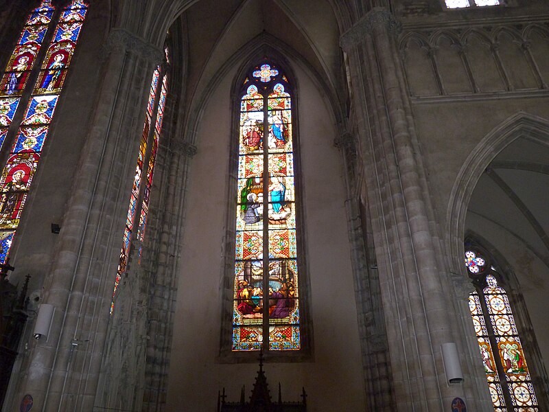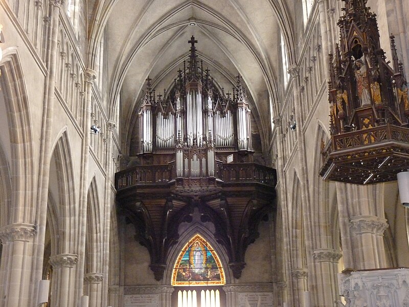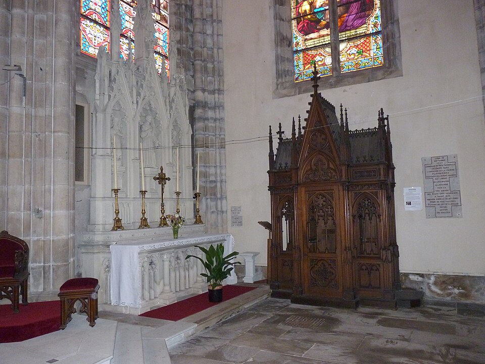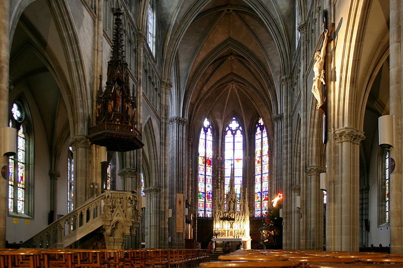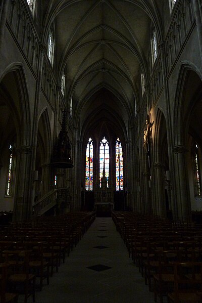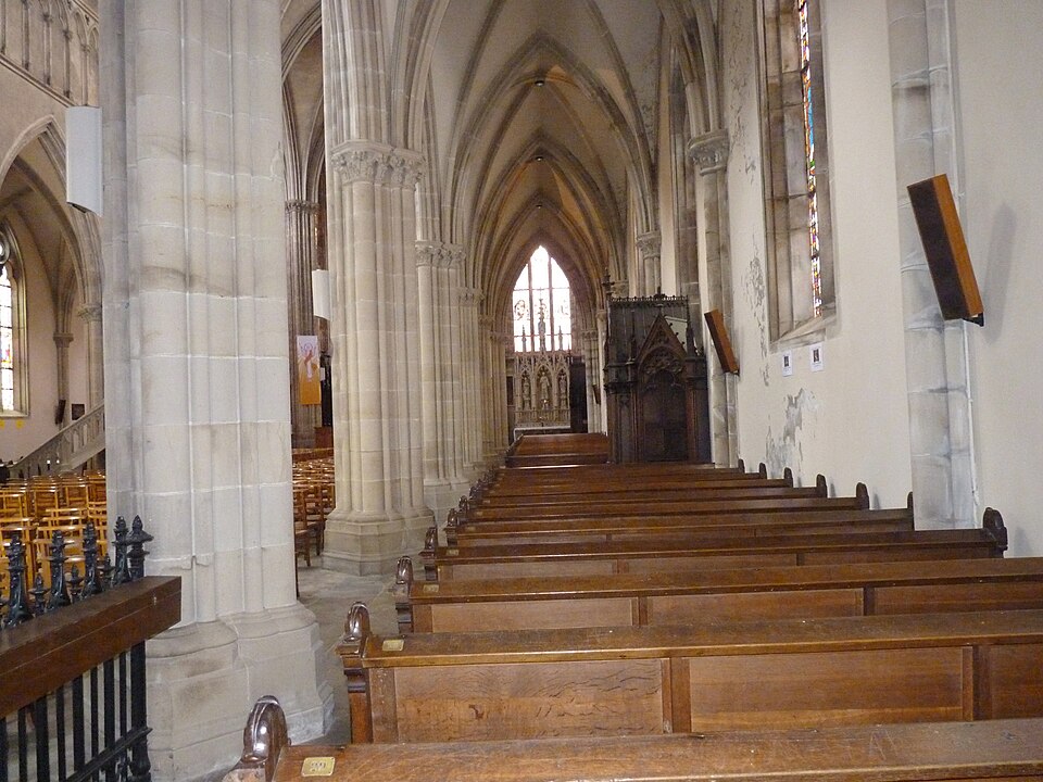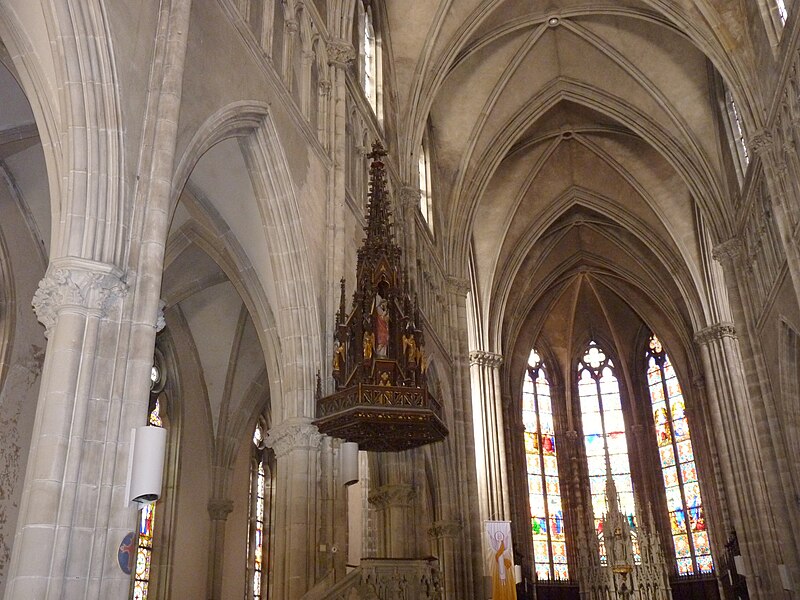 L'église Saint-Amé, ou Saint-Amé-et-Saint-Blaise, est l'église paroissiale de Plombières-les-Bains (Vosges). Elle dépend du diocèse de Saint-Dié et constitue l'une des trois églises de la paroisse Notre-Dame-des-Sources, avec Ruaux (Saint Jean-Baptiste) et Bellefontaine (Saint-Blaise), toutes gérées par un prêtre modérateur. Une chapelle fondée en 1390 desservit la paroisse pendant trois siècles et demi, puis une première église paroissiale, de taille modeste, fut édifiée en 1729 pour remplacer l'édifice primitif devenu ruiné au début du XVIIIe siècle. L'édifice actuel a été reconstruit entre 1857 et 1860 sur un projet de l'abbé Balland et de l'architecte Léon-Charles Grillot, avec l'aide financière de l'empereur Napoléon III et l'avis consultatif d'Eugène Viollet-le-Duc. Dès 1849 la première église fut jugée vétuste et trop exiguë, ce qui entraîna des démarches pour estimer et financer les travaux, notamment une demande de devis et l'autorisation en 1852 d'organiser une loterie finalement tenue en 1856 accompagnée d'une souscription. Malgré des oppositions locales à la dépense, la municipalité sollicita l'empereur, qui approuva la construction sur la rive gauche de l'Augronne, offrit 5 000 francs et participa à l'acquisition de maisons et terrains pour 112 640 francs. La tour-clocher ne fut achevée qu'en 1860, grâce à une aide personnelle de l'empereur ; le maître-autel fut consacré le 18 août 1863 par Mgr Caverot ; la sculpture du portail fut réalisée en 1864 par le sculpteur Maguin et la tribune d'orgue agrandie en 1882 selon des plans de l'architecte Curvat ; l'ameublement complet ne fut achevé qu'en 1905. Le style retenu est un néogothique inspiré du XIVe siècle, en remplacement d'un avant-projet roman. L'édifice adopte un plan basilical ogival, construit principalement en pierre de taille de grès vosgien, avec une élévation intérieure à trois vaisseaux : un vaisseau central qui débouche sur les grandes verrières du chœur et deux nefs latérales plus basses couvertes de voûtes d'ogives. Le transept, de la même hauteur que la voûte principale et formant une croix, libère à l'avant-chœur un volume remarquable. Selon le devis de Grillot, l'édifice mesure 58 mètres de longueur, 16,50 mètres de largeur et 18,50 mètres de hauteur sous voûte, et la flèche culmine à 61 mètres où figure une couronne impériale. La façade occidentale, les contreforts, arcs-boutants et piles sont en pierre de grès ; les voûtains sont en brique ; les bas-côtés sont couverts de toits en appentis, et le chœur ainsi que les bras du transept présentent des croupes, dont une polygonale sur le chœur. La flèche, polygonale, est munie d'arêtiers en fonte ; les pinacles et chapiteaux portent des décors végétaux et des gargouilles ornent la tour-clocher. Le bâtiment reste fragile en raison de la pierre friable, sensible au climat et à la pollution, ce qui impose un entretien constant et exigeant. L'église bénéficie d'une protection au titre des monuments historiques depuis 1995, son inscription à l'inventaire supplémentaire datant du 20 juillet 1995 et faisant suite au classement de l'ensemble du mobilier en mai 1982. Une restauration complète de la toiture a été réalisée entre septembre 2017 et octobre 2019 grâce aux dons recueillis par l'Association de soutien à la restauration de l'église.