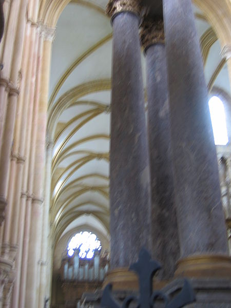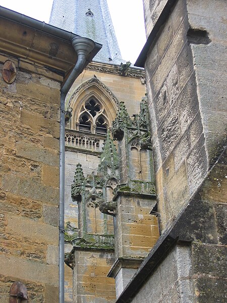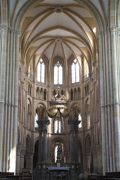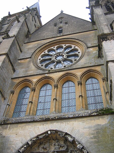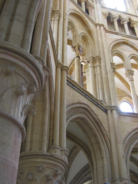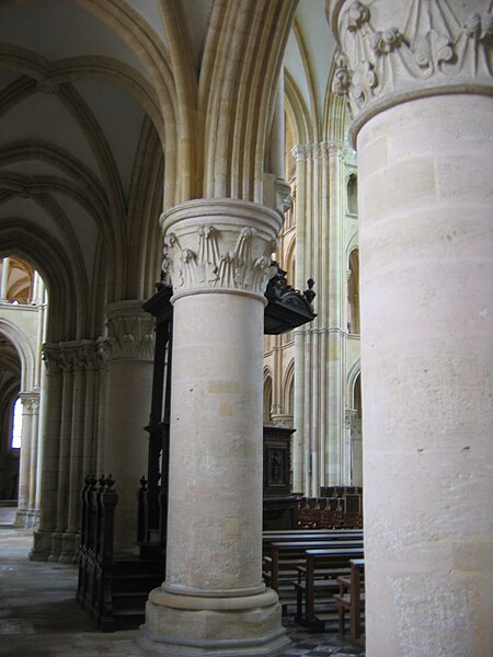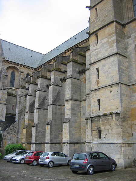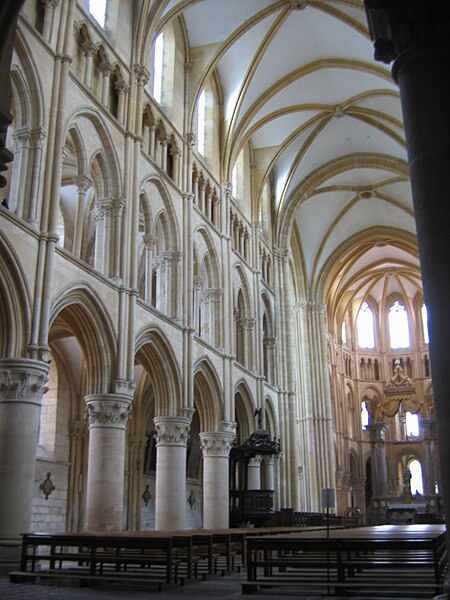 La nef, flanquée de deux collatéraux, présente une élévation en trois étages typique du gothique primitif : grandes arcades en arcs brisés au niveau inférieur, tribunes au premier étage et triforium suivi d'un étage de grandes fenêtres. L'ensemble est voûté sur croisées d'ogives, avec des voûtes sexpartites dans la nef et quadripartites dans le chœur. À l'extérieur, des arcs-boutants prévus dès l'origine contrebutent les voûtes autour du chœur et le long de la nef, témoignant d'éléments annonciateurs de la deuxième génération gothique ; ces arcs-boutants, relativement lourds et adossés à des contreforts épais, coexistent avec des murs-boutants et ont été réaménagés côté sud au XVe siècle par l'adjonction de pinacles. Le chœur est entouré d'un déambulatoire à cinq pans et de cinq chapelles rayonnantes.