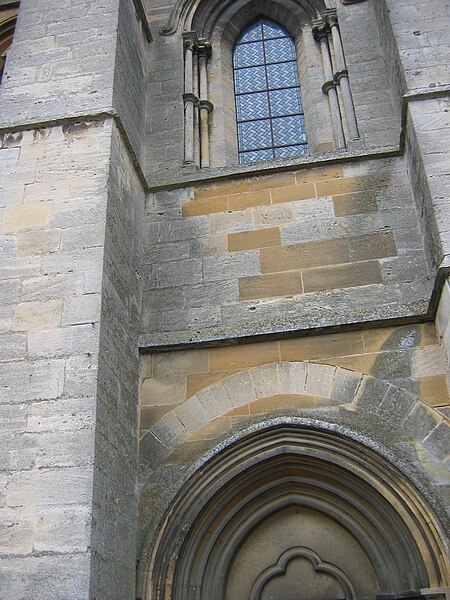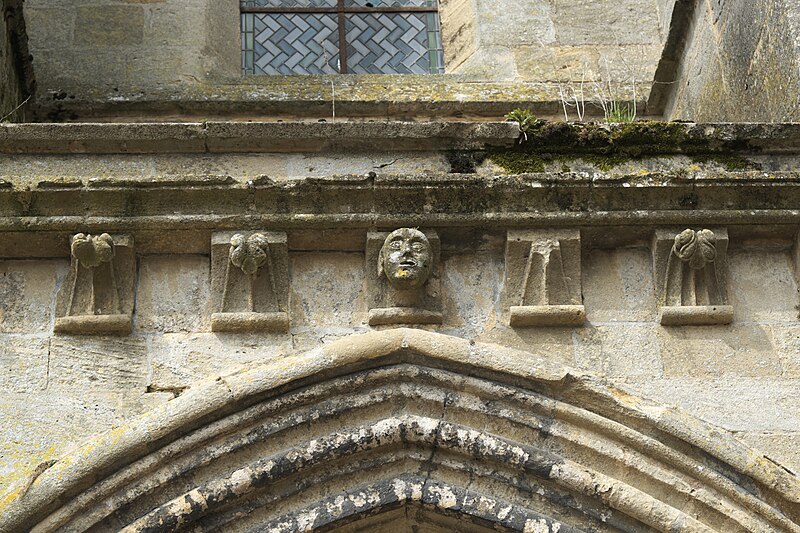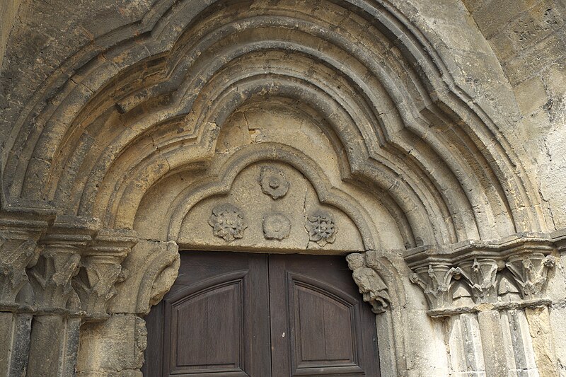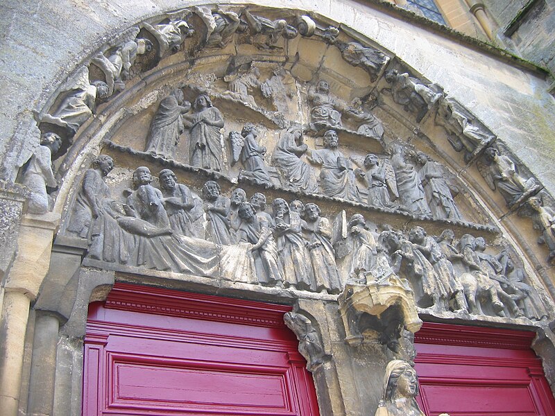 Le portail occidental, encadré de deux tours carrées, comporte un tympan du XIIIe siècle en trois registres sculptés séparés par des bandes ondulées ; le registre inférieur montre la dormition de la Vierge à gauche et les martyrs Victor et Arnoul à droite, le registre médian présente trois scènes mariales traditionnelles (Visitation, couronnement, Annonciation) et le registre supérieur, fortement abîmé, représente des anges agenouillés et une scène d'élévation pouvant évoquer la glorification d'un martyr. Le tympan, initialement protégé par plusieurs voussures, ne conserve qu'un rang réinstallé avec douze figurines d'anges ; une Vierge à l'Enfant occupe le trumeau et les statues des pieds-droits ont disparu.