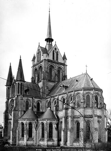 L’abside et la tour‑lanterne, cette dernière élevée à 33 m et articulant transept et nef à triple élévation, témoignent d’un plan rare et soigné ; le tympan du portail central a été sauvé et reconstitué au revers de la façade, tandis qu’une partie des sculptures est déposée au musée de Soissons. Avant la Révolution, l’église appartenait aux chanoines réguliers de l’ordre des Prémontrés, après que l’abbaye eut été donnée à cet ordre par l’évêque de Soissons en 1130. L’abbatiale fut la nécropole des comtes capétiens de Dreux et abrita jusqu’à la Révolution les reliques de saint Yved et de saint Victrice ; ces reliques feront l’objet d’une translation au XIXe siècle.