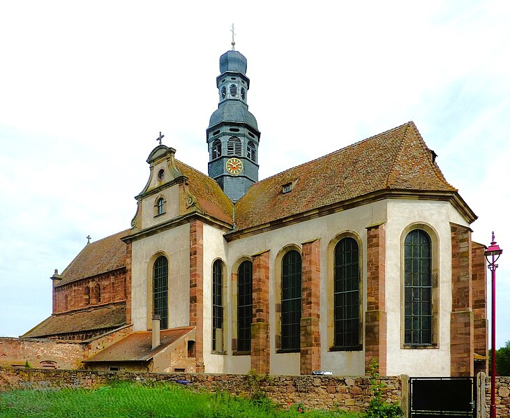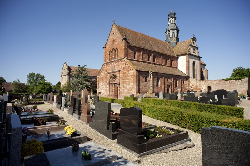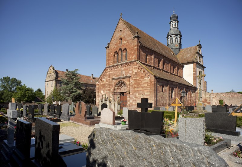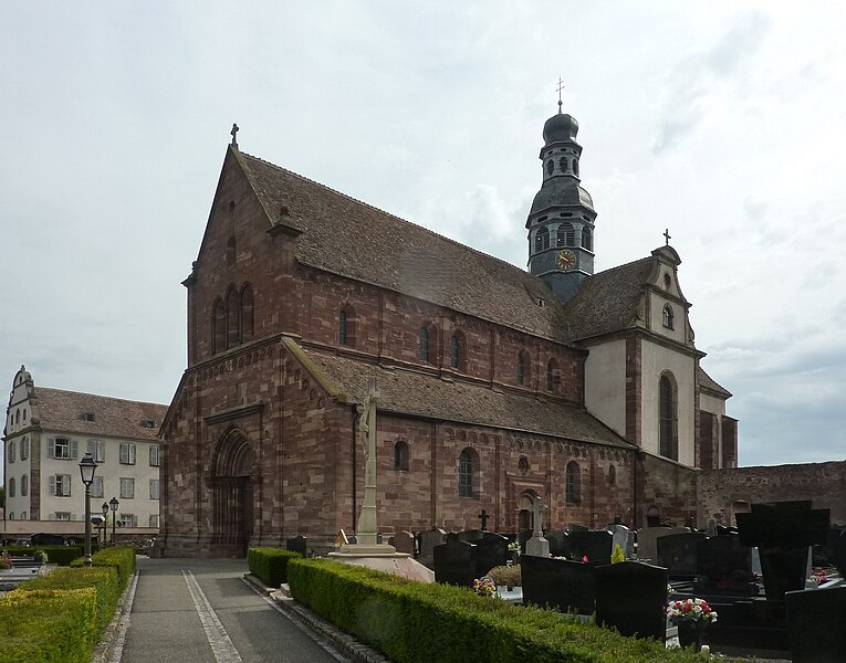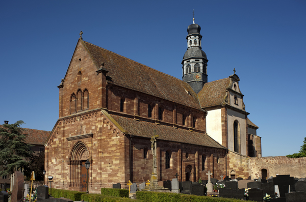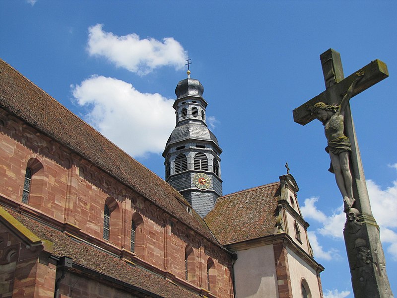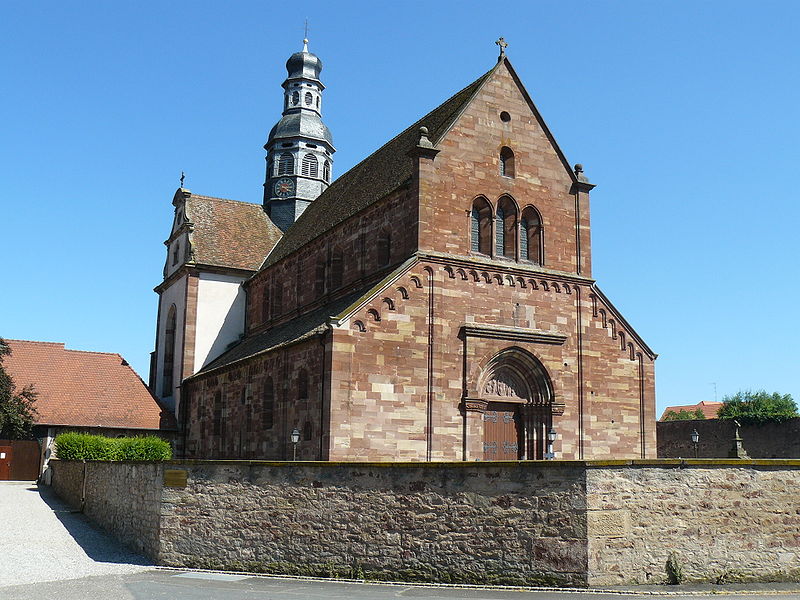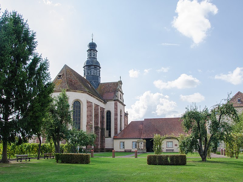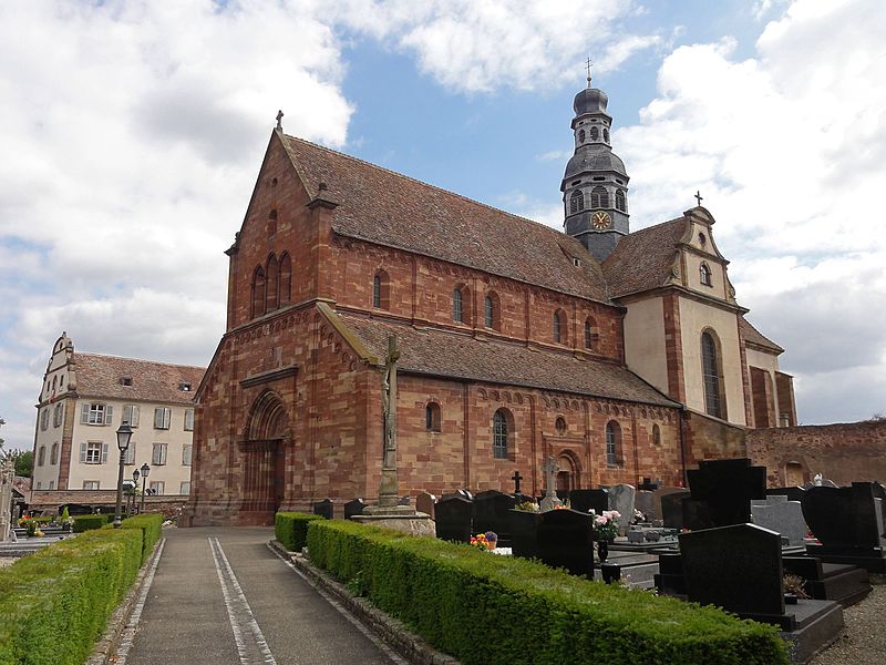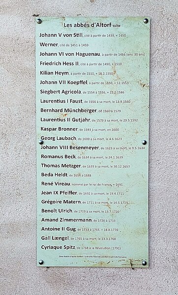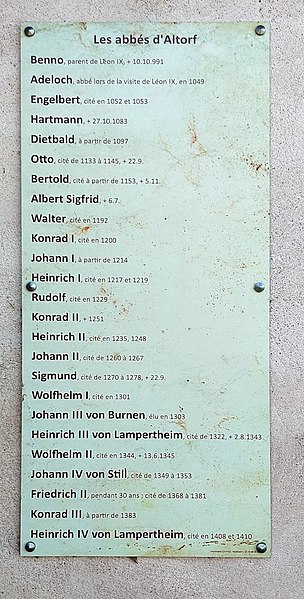 L'abbaye bénédictine d'Altorf, située dans le village d'Altorf (Bas-Rhin, canton de Molsheim), se trouve sur la RD 393 entre Strasbourg et Molsheim et est accessible depuis l'A35 par la sortie Dorlisheim. Elle a été fondée par le comte d'Eguisheim dans la seconde moitié du Xe siècle; la chapelle initiale fut consacrée en 974 par l'évêque de Strasbourg en présence de l'abbé Maïeul de Cluny. Au milieu du XIe siècle, le pape Léon IX consacra un autel et offrit des reliques, dont un bras de saint Cyriaque, qui devint le patron principal de l'abbaye, reléguant saint Barthélemy et saint Grégoire. L'abbaye fut occupée par des moines bénédictins de 974 à 1790 et connut plusieurs affiliations monastiques, dont la ratification à la Congrégation de Bursfelde et, en 1624, l'incorporation à la congrégation bénédictine de Strasbourg. Elle subit de nombreuses destructions et pillages, notamment pendant la guerre des Paysans et la guerre de Trente Ans, et fit l'objet de reconstructions régulières. La nef romane de l'église Saint-Cyriaque date des campagnes de construction des XIIe et XIIIe siècles, tandis que le chœur et le transept furent reconstruits au début du XVIIIe siècle par l'architecte Peter Thumb. L'ancienne maison abbatiale, aujourd'hui presbytère, remonte à la fin du XVIe siècle; le maître-autel et d'autres aménagements intérieurs sont du XVIIIe siècle. Les bâtiments conventuels ont été reconstruits à plusieurs reprises; le cloître fut refait au XVIe siècle, comme en témoigne une console datée 1581, et les travaux majeurs du début du XVIIIe siècle comprirent la reconstruction de l'aile nord par Albert Regutz et l'édification de la partie orientale en plan en H sous la direction de Peter Thumb, dont la première pierre fut posée en 1715. Ces constructions comprenaient un grand réfectoire, des galeries voûtées servant de cloître autour du jardin intérieur et des accès directs aux sacristies et à l'église; seule la galerie ouest et les deux premières travées de la galerie nord subsistent, intégrées à des bâtiments remaniés. Les anciennes cuisines, détruites en 1702, furent rebâties par Albert Regutz; la grande grange fut élevée en 1713 par Mathias Dietterle. Le plan d'ensemble du XVIIIe siècle comprenait un soubassement voûté, un rez-de-chaussée et deux étages, des toits à croupes et des avant-corps à frontons selon les descriptions et vues de l'époque, mais la construction de Thumb fut partiellement démolie après la vente des bâtiments au début du XIXe siècle. À l'intérieur, la nef conserve l'esprit roman et le mobilier baroque du XVIIIe siècle inclut un maître-autel, des stalles, une chaire à prêcher, un orgue signé André Silbermann (1729) et plusieurs autels latéraux consacrés à des saints; les fonts baptismaux gothiques datent du XVe siècle. Le buste reliquaire de saint Cyriaque, constitué d'un tronc en chêne du XIIe siècle partiellement revêtu de plaques métalliques et enrichi de médaillons aux XIIIe siècle, est la pièce la plus importante de l'église; il fut complété et restauré à plusieurs reprises, notamment vers 1730 pour son exposition et par Martin Vogeno en 1883-1884. L'exposition à baldaquin du buste et les reliquaires qui l'entourent, représentant saint Benoît et saint Joseph, participent à la réputation de l'abbaye comme lieu de pèlerinage pour les épileptiques, les fiévreux et les malades nerveux. L'abbaye possédait aussi un atelier monétaire établi dès la fin du Xe siècle, dont l'activité cessa à la fin du XIIIe siècle avant un bref redémarrage et le transfert ultérieur des droits à l'atelier épiscopal de Strasbourg. Le domaine abbatial comprenait un jardin et un étang aménagé en 1734 avec canaux et viviers pour l'élevage de poissons, destiné à l'approvisionnement des moines; le jardin du cloître abritait des espaces de culture et de recueillement identifiés comme pomarium, herbularius et hortus. La communauté déclina à la fin de l'Ancien Régime et les moines durent quitter l'abbaye en 1791; les bâtiments furent d'abord affectés à l'hôpital militaire puis vendus au début du XIXe siècle. Le site conserve des vestiges lapidaires réemployés et des éléments architecturaux issus des nombreuses phases de reconstruction, et la croix funéraire de Laurent Klein est encastrée à l'emplacement d'une ancienne porte du chœur. L'abbaye a fait l'objet de protections au titre des monuments historiques, avec le classement du maître-autel en 1932, l'inscription de la façade à pignon du presbytère en 1937 et le classement de l'église paroissiale Saint-Cyriaque en 1983. Les abbés se sont succédé pendant huit cents ans, depuis des figures anciennes comme Benno, mort vers 991, jusqu'à Cyriakus Spitz, dernier abbé à l'époque de la suppression.