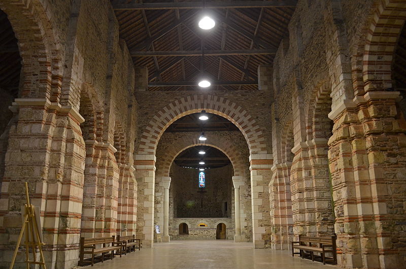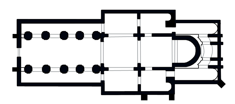 L'édifice conserve une architecture essentiellement carolingienne enrichie d'éléments romans et d'aménagements postérieurs. La nef actuelle, reconstruite après 847, comporte quatre travées alors que la première église en comptait six ; on perçoit encore l'amorce d'un arc appartenant à l'un des quatorze piliers primitifs. Les dix piliers actuels, cruciformes, alternent pierre et brique et furent renforcés au fil du temps ; les arcs conservent le motif alternant tuffeau et brique propre à l'époque carolingienne et furent complétés par des arcs romans entre le IXe et le XIIe siècle. Le chevet a subi d'importantes transformations : le déambulatoire primitif, composé de trois absidioles et conçu pour faciliter le passage des pèlerins et la visite des reliques via une fenestella, a été remplacé par un mur droit. La crypte, ou « confession », située sous le chœur, abrite le sarcophage de saint Philibert ; ses murs furent élevés par l'abbé Hilbod en 836 puis totalement murés en 847 pour protéger le tombeau.
