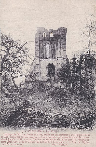La tour de l'abbaye Notre-Dame du Mont de Watten appartient à la commune depuis son transfert par l'État le 7 novembre 2007. L'abbaye, fondée par le prêtre Olfride en 1072, fut le premier monastère de chanoines réguliers de saint Augustin dans le comté de Flandre et un avant‑poste de la réforme grégorienne. À l'origine, une chapelle dédiée à saint Riquier existait au sommet du mont depuis 874, mais elle fut détruite par les Normands en 881. Au milieu du XIe siècle, le moine anachorète Alphume installa une chaumière pour accueillir quelques religieux autour de cette chapelle. Le monastère fut officiellement créé le 8 juin 1072 sous la protection de Robert Ier de Flandre ; Olfride en devint le premier prévôt et l'établissement reçut la protection de saint Nicolas et de saint Riquier. Des seigneurs locaux et des membres de la famille comtale apportèrent matériaux, donations et soutien, tandis que la comtesse douairière Adèle posa la première pierre et accompagna Olfride à Rome pour obtenir la protection pontificale. Pour son opposition à certains prélats, Olfride fut excommunié en 1079 et mourut à Gand en 1085. Du XIe au XIIe siècle l'abbaye étendit ses possessions par la mise en valeur des terres marécageuses et reçut des églises et chapelles en donation. Après un incendie en 1081 et plusieurs reprises de la charge de prévôt, l'établissement poursuivit son développement, recevant notamment des terres et des reliques en provenance de Terre sainte. Les comtes de Flandre, en particulier Robert II, Thierry d'Alsace et Philippe d'Alsace, protégèrent et dotaient l'abbaye, lui accordant parfois des exemptions fiscales et des droits de justice. Les relations foncières donnèrent lieu à de nombreux litiges avec d'autres monastères et seigneuries, dont un long dossier relatif à la dîme de Rubrouck entre 1224 et 1226. En 1297 l'abbaye prit parti pour le comte Gui de Dampierre contre le roi de France, ce qui entraîna des censures ecclésiastiques et une occupation française, puis des mesures de protection de la part des autorités comtales et ecclésiastiques. Au début du XIVe siècle elle fut fortifiée par les Flamands et continua de bénéficier de la sauvegarde des comtes, notamment en 1349. À l'époque moderne, l'abbaye subit en 1566 les destructions liées aux iconoclastes et aux passages militaires, puis ses revenus furent annexés à l'évêché de Saint‑Omer. Reprise et reconstruite par l'évêque à la fin du XVIe siècle, c'est de cette campagne que datent la tour actuelle et une grande partie des murs d'enceinte. Au XVIIe siècle, des jésuites anglais y établirent un noviciat : autorisés en 1608, les premiers novices y arrivèrent en 1623 et la communauté atteignit jusqu'à cent novices; l'abbaye‑noviciat fut renforcée par des fortifications entre 1644 et 1646. Les Jésuites restèrent jusqu'à la suppression de la Compagnie en 1763, puis des prêtres séculiers prirent leur place. En 1769 l'évêque fit démolir l'essentiel du monastère, à l'exception de la tour et des murs de clôture; sur les ruines furent ensuite aménagées une résidence d'été et une ferme qui subsistent encore. Vendue comme bien national en 1789, la tour échappa à la destruction grâce à son rôle de repère pour la navigation; elle devint propriété du ministère de la Marine en 1822, puis de l'État et fut placée sous la protection des monuments historiques. La tour et les murs d'enceinte ont fait l'objet d'un classement par arrêté du 10 février 1909, tandis que le reste de l'abbaye a été classé par arrêté du 21 novembre 1980. Lors de la seconde Guerre mondiale, les Allemands occupèrent l'abbaye et utilisèrent la tour comme poste d'observation. Le patrimoine matériel et foncier de l'abbaye était très étendu, reflété par de nombreuses donations et archives ; parmi les sources anciennes, une chronique du monastère fut rédigée par le chanoine Ebrard dans les années 1080-1085. Aujourd'hui, les vestiges les plus visibles sont la tour en ruines et les murs d'enceinte, quelques éléments de mobilier de l'abbaye se trouvent dans l'église Saint‑Gilles et des matériaux de l'ancien établissement ont été réemployés pour la réparation du moulin daté de 1731. L'abbaye fut dirigée non par un abbé mais par une succession de prévôts, depuis Olfride au XIe siècle jusqu'à Jean Fachin au milieu du XVIe siècle.