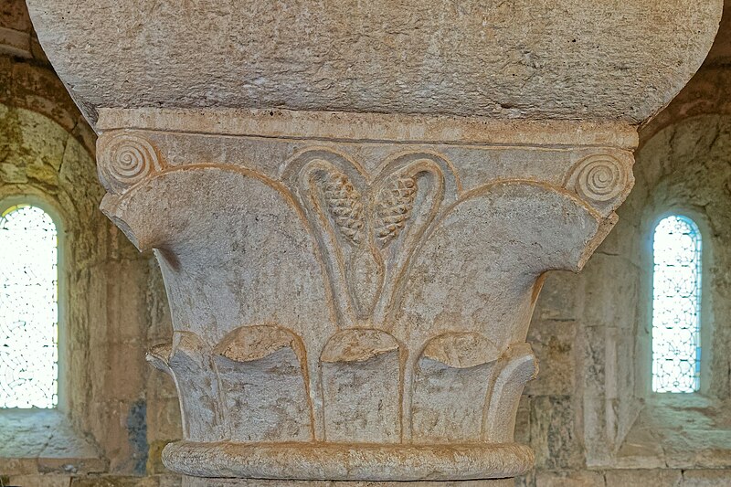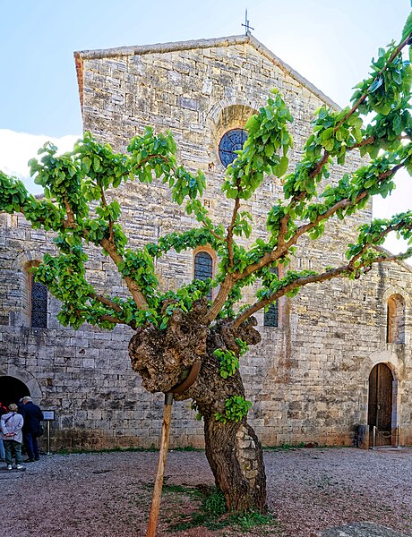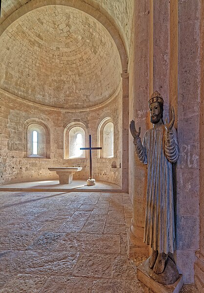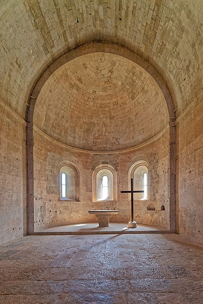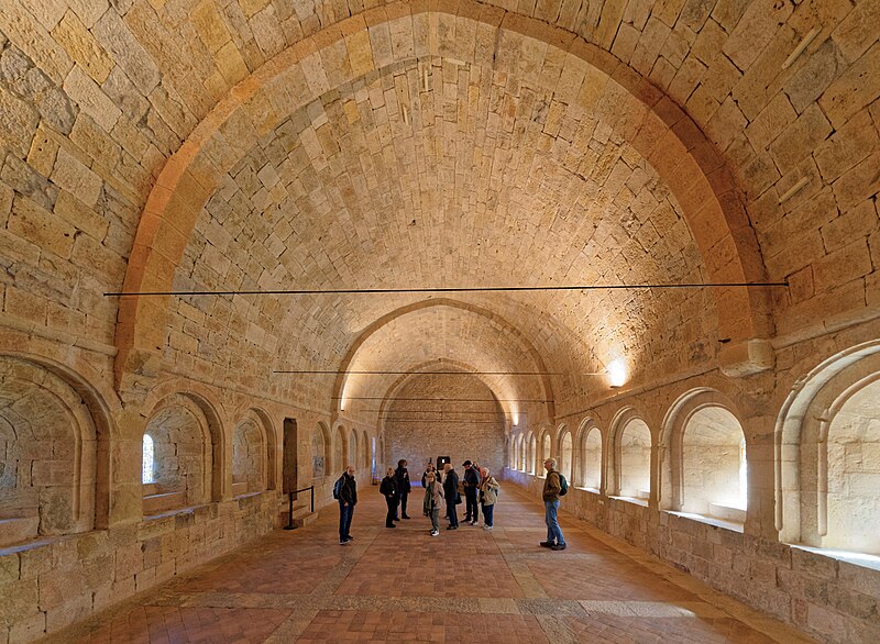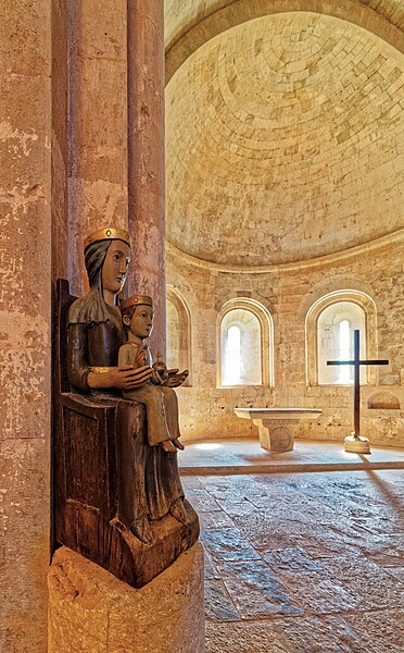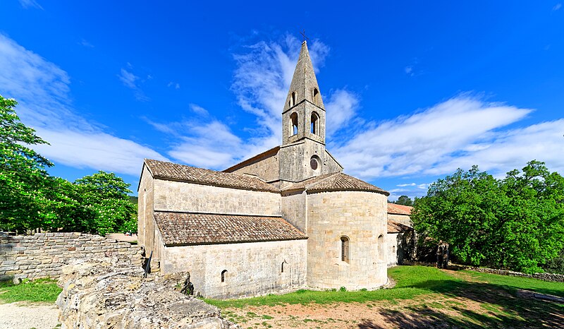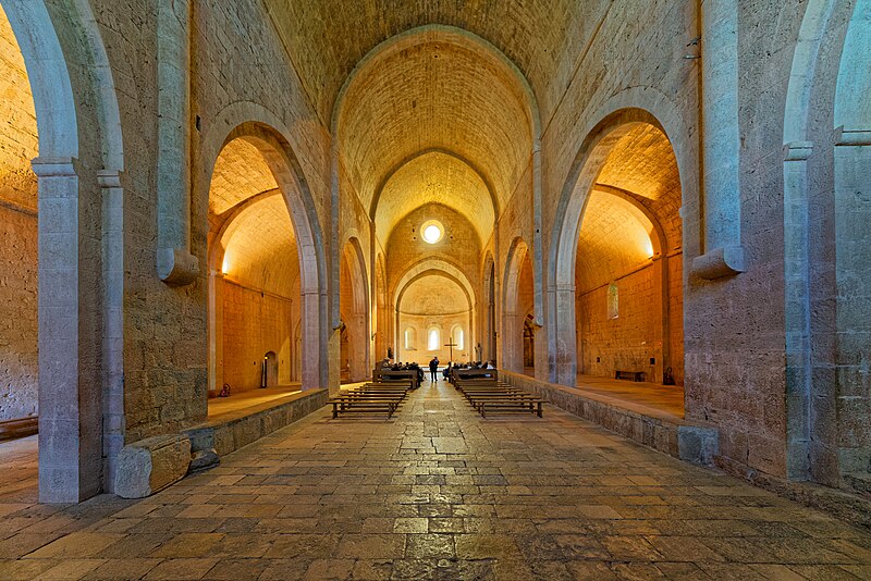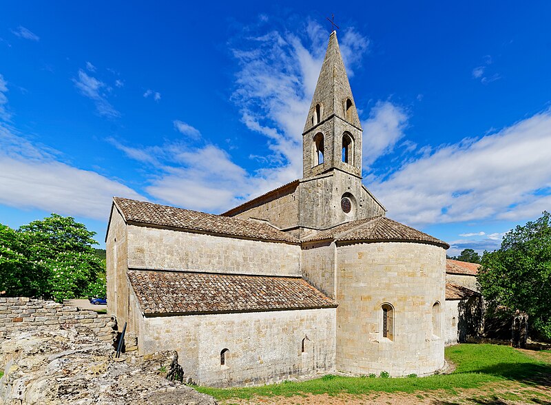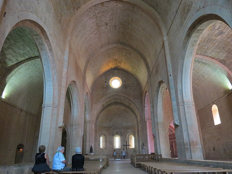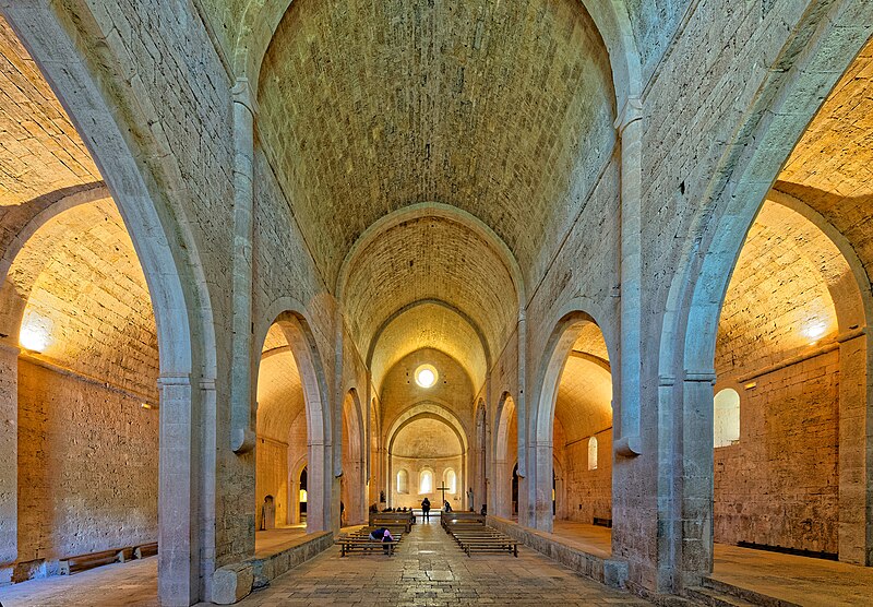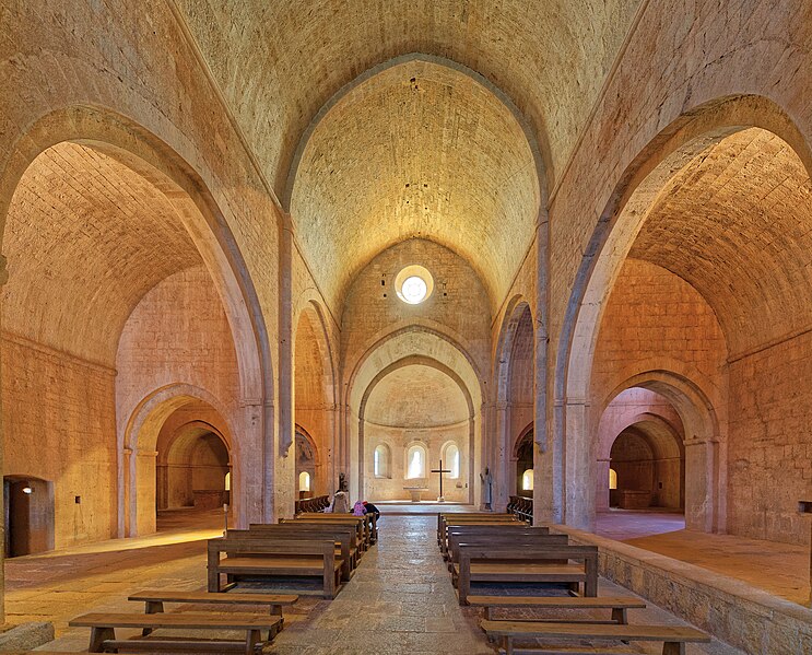 L'abbatiale, le plus vaste édifice du site, présente un plan en croix latine modeste d'environ 40 mètres sur 20, une nef voûtée en berceau brisé, un transept saillant et un chevet en cul-de-four sobre et dépourvu d'ornement. La façade occidentale reste sobre, sans portail monumental, et le clocher primitif, daté entre 1160 et 1180, est surmonté d'une flèche de pierre culminant à plus de trente mètres. Les ouvertures sont rares et étroites : quatorze fenêtres munies de vitraux en grisaille percent des murs épais, et la lumière diffuse joue un rôle essentiel dans l'organisation spatiale et spirituelle de l'ensemble.