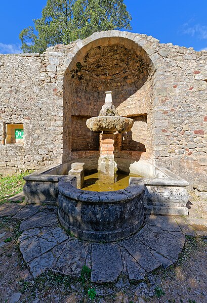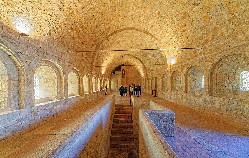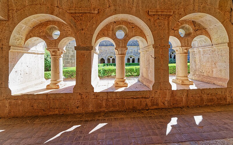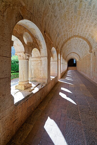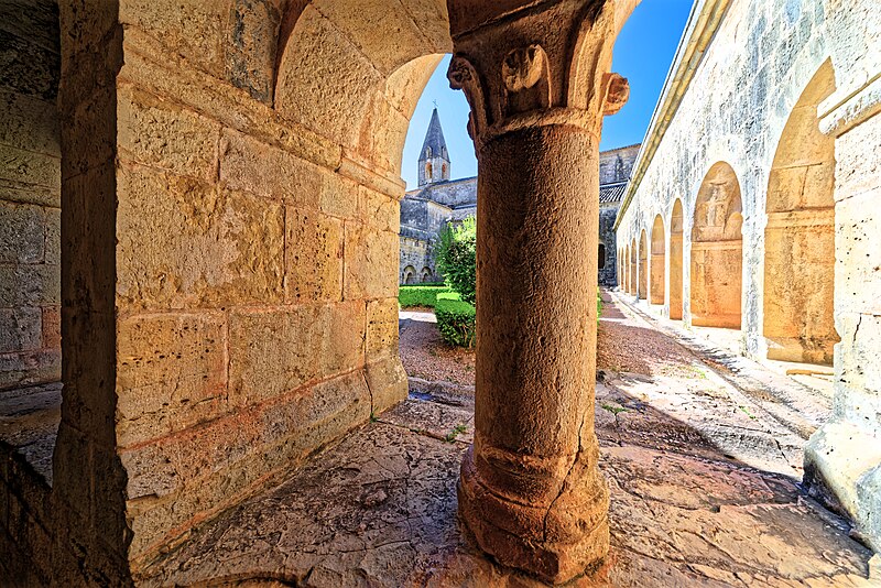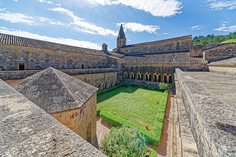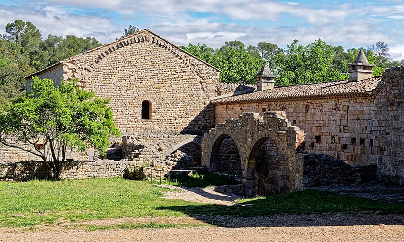 Le cloître, de plan trapézoïdal et d'environ 30 mètres de côté, constitue le centre de la vie monastique ; ses galeries, construites sur et dans le rocher, montrent une économie de moyens et une grande unité de formes, la galerie sud étant la plus ancienne. Parmi les bâtiments conventuels, la salle capitulaire voûtée d'ogives et dotée de deux colonnes centrales, la sacristie, le lavabo hexagonal adossé au préau et le cellier attestent de la distribution des fonctions ; la salle des moines a abrité le scriptorium, pièce chauffée essentielle pour la production de parchemins. La vie matérielle reposait sur des ressources parfois éloignées : l'abbaye exploitait des marais salants et des pêcheries à Marignane, Hyères, Martigues et Sainte-Maxime, et tirait principalement ses revenus de l'élevage.