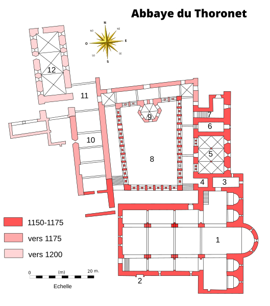 Implantée dans un vallon boisé, l'abbaye disposait sur place d'une carrière, de sources et d'une forêt, éléments qui ont conditionné ses choix de construction et son autonomie. Les premiers bâtiments comprenaient le cellier et un édifice proche de la porterie, puis l'abbatiale orientée à l'est et le cloître trapézoïdal qui suit la disposition des constructions. L'emploi d'une pierre calcaire locale, parfois laissée brute en bossage, confère à l'ensemble une unité matérielle et des qualités acoustiques et lumineuses remarquées depuis le XIXe siècle ; les parements sont taillés pour obtenir des joints très fins tout en assurant l'attache du blocage interne.