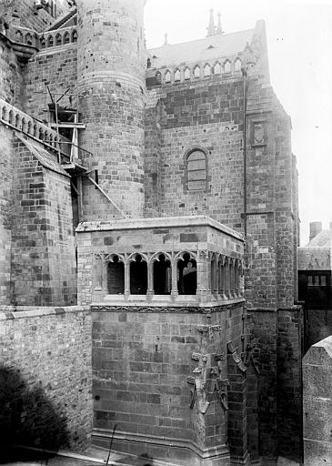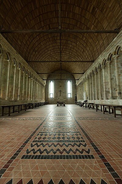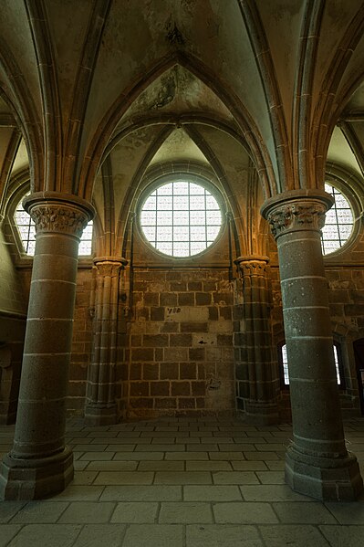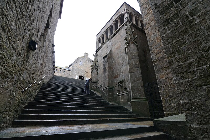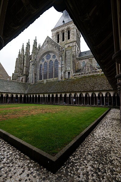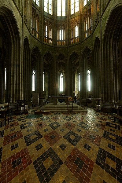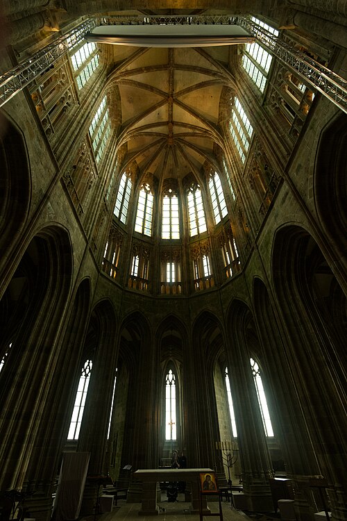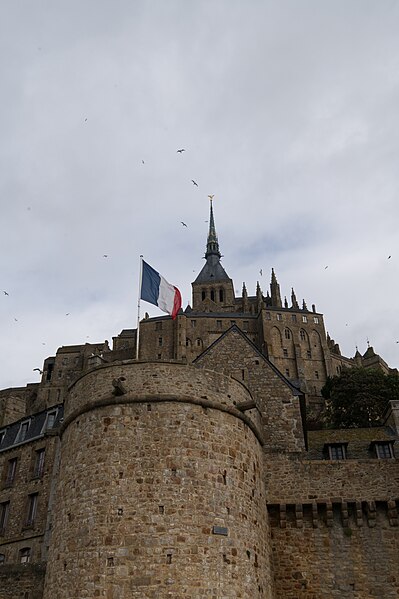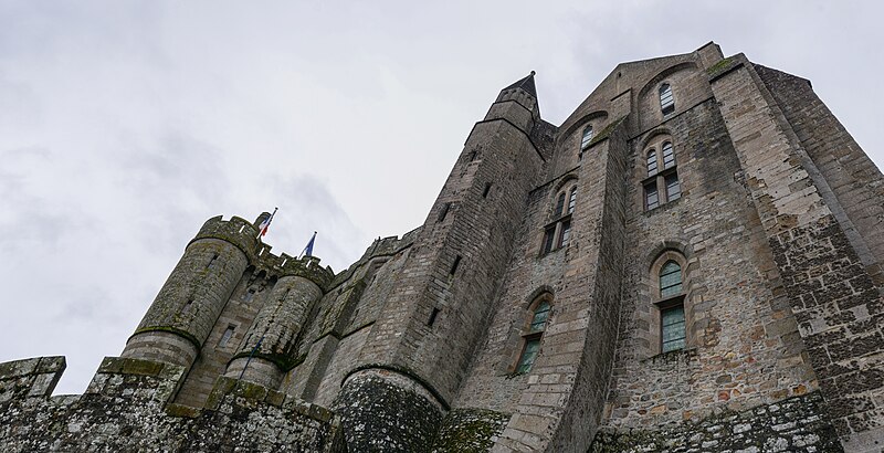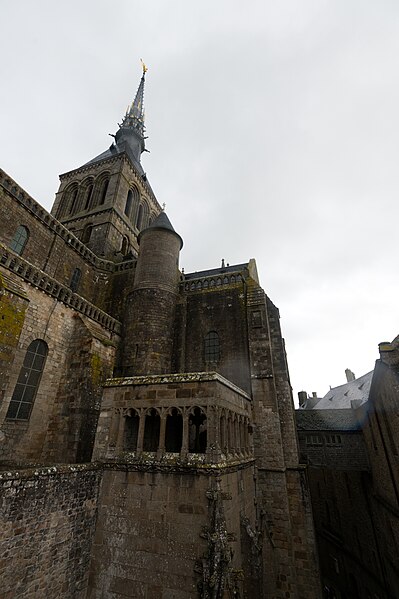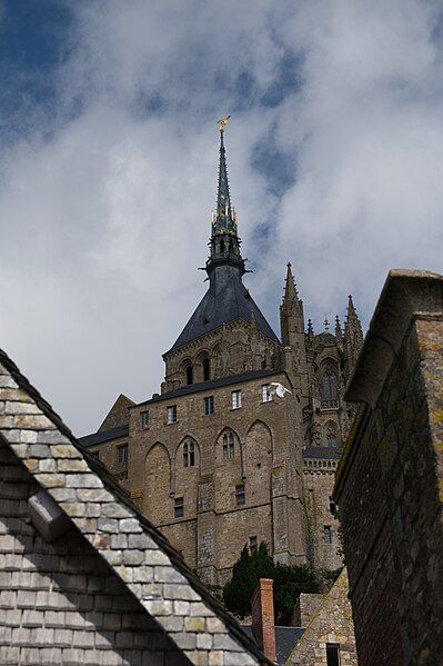 L'abbaye du Mont‑Saint‑Michel, dédiée à l'archange Saint‑Michel, est un établissement monastique de style gothique édifié entre le XIe et le XVIe siècle sur l'îlot du Mont‑Saint‑Michel, dans la Manche (Normandie). Autrefois bénédictine, elle est depuis 2001 liée aux Fraternités monastiques de Jérusalem et conserve une vie religieuse permanente. Le site, propriété de l'État et géré par un établissement public, est classé au titre des monuments historiques (liste de 1862) et inscrit deux fois au patrimoine mondial de l'UNESCO, pour le « Mont Saint‑Michel et sa baie » et comme composante des « Chemins de Compostelle en France ». L'abbaye attire à elle seule 1,5 million des quelque 2,5 millions de visiteurs annuels du Mont, ce qui en fait l'un des principaux sites culturels visités en France. Le nom ancien du rocher, « Mont‑Tombe », dérive vraisemblablement du latin tumba et renvoie soit à un tertre naturel soit à un site funéraire antérieur à l'installation monastique; l'îlot voisin de Tombelaine tire son nom d'une formation apparentée. La tradition rapporte que saint Aubert, évêque d'Avranches, fit ériger un premier oratoire à l'archange, récit légendaire dont les origines réelles restent obscures et que les sources médiévales traitent avec un mélange de foi et de propagande locale. Des constructions carolingiennes et préromanes ont été successivement reprises et agrandies: la chapelle dite Notre‑Dame‑sous‑Terre, redécouverte lors de fouilles, illustre cet état primitif et ses remaniements. À la fin du Xe siècle la collégiale initiale fut remplacée par une communauté bénédictine, fondation retenue traditionnellement à la suite de la réforme imposée par le duc de Normandie. Les moines bénédictins développèrent l'abbaye, construisirent l'église abbatiale romane et organisèrent l'ensemble monastique autour de cryptes et de bâtiments conventuels adaptés à la topographie du rocher. Au XIIIe siècle, grâce au soutien de mécènes, la construction de la « Merveille », ensemble exceptionnel construit sur trois niveaux pour loger cloître, réfectoire, salle des chevaliers, a donné à l'abbaye son appareil monumental et fonctionnel le plus célèbre. L'édifice combine des éléments carolingiens, romans et gothiques: quatre cryptes soutiennent la plateforme du chœur, la nef conserve une élévation à trois niveaux de tradition normande et le chœur gothique présente un triforium et des chapelles rayonnantes. Par sa situation stratégique et symbolique, le Mont fut fortifié et défendu à de nombreuses reprises; il résista notamment aux attaques et sièges pendant la guerre de Cent Ans, qui entraînèrent renforcement des remparts et creusement de citernes. L'abbaye connut ensuite un déclin progressif, aggravé par le régime de la commende, puis fut transformée en lieu de détention aux XVIIe‑XIXe siècles, ce qui, paradoxalement, contribua à la conservation de l'ensemble face aux démantèlements révolutionnaires. Durant la période pénitentiaire, l'abbatiale fut aménagée pour accueillir ateliers et dortoirs, et de nombreuses modifications architecturales furent réalisées, parfois au prix de dommages importants. À partir du XIXe siècle s'amorcent des campagnes de restauration et de mise en valeur menées par des architectes de l'entourage de Viollet‑le‑Duc; la flèche néogothique est couronnée par une statue de saint Michel due à Emmanuel Frémiet. Les fouilles et les travaux de consolidation des XXe et XXIe siècles ont précisé la chronologie des vestiges anciens et redonné sa lisibilité au site; Notre‑Dame‑sous‑Terre a notamment été dégagée et mise en valeur. L'aménagement des accès et la construction d'une digue‑route à la fin du XIXe siècle, puis la restauration du caractère maritime de l'îlot engagée au XXIe siècle et achevée en 2015 ont cherché à rendre au Mont sa relation à la mer. L'abbaye reste un pôle culturel et religieux vivant: elle accueille pèlerins, visiteurs et manifestations artistiques, et la présence religieuse actuelle assure la célébration régulière du culte. Sur le plan architectural et spatial, l'abbaye illustre une remarquable adaptation au site: les constructions s'étagent en terrasses, les niveaux inférieurs servent de fondations et d'espaces utilitaires tandis que les salles supérieures, plus légères, accueillent les activités spirituelles et d'hospitalité. Le monument conserve une grande diversité d'espaces — cryptes et chapelles souterraines, nef abbatiale, cloître, Merveille, salles des hôtes et des chevaliers, promenoirs, celliers et logis abbatiaux — qui témoignent à la fois de sa vocation monastique, de son rôle d'accueil et de sa fonction défensive. Géré par le Centre des monuments nationaux et propriété de l'État, le site fait l'objet d'un programme de conservation et d'accueil visant à concilier protection patrimoniale, vie religieuse et fréquentation touristique.
