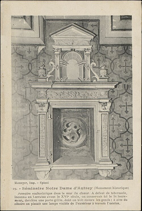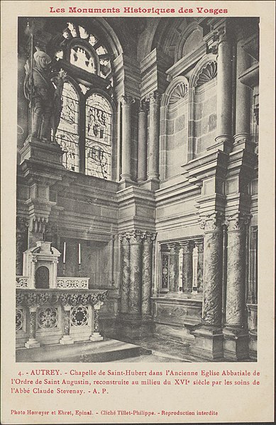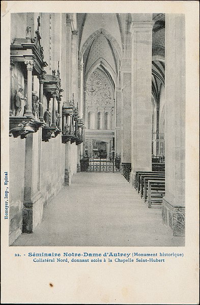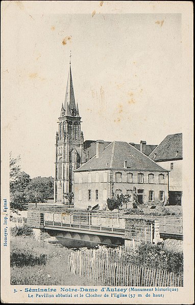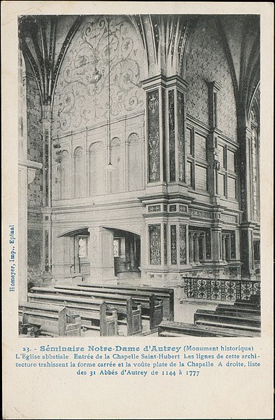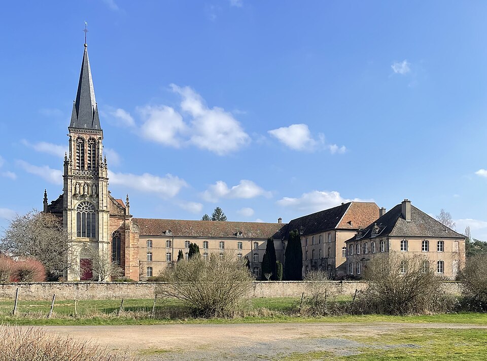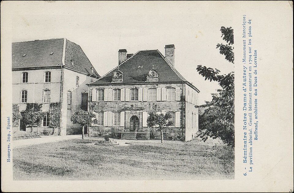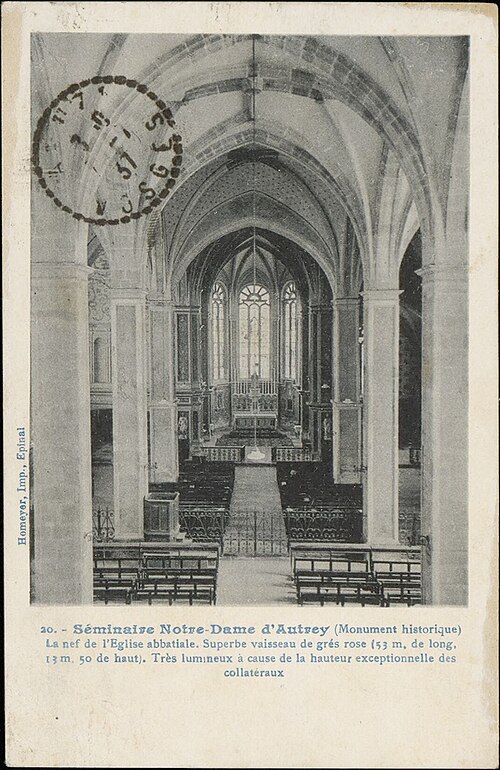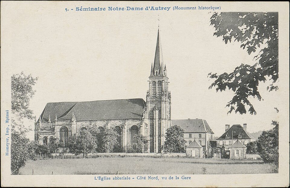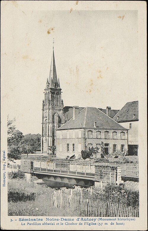 L'abbaye Notre-Dame d'Autrey est située dans la commune d'Autrey, dans les Vosges, à huit kilomètres au sud de Rambervillers. Fondée au XIIe siècle par Étienne de Bar, évêque de Metz, elle est confiée aux chanoines réguliers de saint Augustin; le premier abbé connu est Anselme (1172-1182). Autrey devient rapidement un lieu de pèlerinage, en particulier pour le culte de saint Hubert, dont une relique attire de nombreux fidèles. L'abbaye subit à plusieurs reprises les ravages de la guerre, puis connaît des campagnes de restauration, notamment sous l'abbatiat de Claude Stevenel de 1537 à 1545. À cette époque sont reconstruits le chevet, le transept et les chapelles nord-est et sud-est, donnant à l'église un équilibre harmonieux entre gothique et Renaissance. La chapelle Saint-Hubert, au nord-est, est l'un des exemples les plus remarquables de la Renaissance dans les Vosges et évoque la chapelle des évêques de la cathédrale Saint-Étienne de Toul. Après les graves épreuves du XVIIe siècle, l'ensemble monastique est reconstruit et la nef est rebâtie entre 1704 et 1715. Sous l'Ancien Régime, les religieux appartiennent à la congrégation de Notre-Sauveur, réformée par saint Pierre Fourier; Autrey assure même le noviciat de la congrégation. En 1777, l'abbé de Chaumont devient premier évêque de Saint-Dié, et l'établissement perd son titre d'abbaye. Après la Révolution, l'ensemble est vendu en juin 1792 à un industriel, M. Colombier, qui y installe une manufacture de tréfilerie; le clocher roman est démoli et un canal aménagé dans la nef pour alimenter l'usine, tandis que les bâtiments servent de logements d'ouvriers, ce qui contribue à leur conservation. La manufacture ferme en 1850 et la propriété est mise en vente; en 1856, Louis-Marie-Joseph-Eusèbe Caverot l'acquiert et y transfère l'un des petits séminaires diocésains, celui de Senaide, sous la direction du chanoine Morquin. La maison est placée sous le patronage de Marie Immaculée pour commémorer la proclamation du dogme de l'Immaculée Conception. La loi de 1906 affecte le séminaire; en 1912 un hospice départemental de vieillards s'y installe, puis l'établissement sert d'hôpital de guerre en 1914 avant de redevenir petit séminaire en 1931. L'église est classée au titre des monuments historiques le 8 juillet 1911, et les façades et toitures des deux ailes sont classées en 1931. Rachetée par le diocèse en 1930, l'abbaye abrite à nouveau des élèves des petits séminaires à partir du 3 novembre 1931 jusqu'à son abandon vers 1974. Occupée par les forces allemandes pendant la Seconde Guerre mondiale, l'abbaye est bombardée en septembre 1944; le clocher et la nef sont partiellement détruits et d'importants travaux de restauration sont menés en 1952, mettant au jour les ruines de la première abbaye et la future chapelle Saint-Bernard. En 1982, la Communauté catholique des Béatitudes s'installe sur le site et ouvre en 1988 le Cours Agnès de Langeac, un internat pour garçons souhaitant discerner une vocation; l'école ferme en 2007. En janvier 2023, un reportage du quotidien La Croix rapporte des allégations d'agressions sexuelles commises au sein de l'internat, impliquant deux prêtres et touchant dix anciens élèves, plusieurs victimes alléguées s'étant suicidées. Le domaine comprend un parc de quatre hectares aménagé en véritable jardin botanique où l'on compte quelque 2 500 essences; hydrangeas, rhododendrons, rosiers anciens, glycines et autres plantes y côtoient une pépinière qui cultive 550 variétés de rosiers anciens, d'arbres, d'arbustes et de plantes grimpantes. Une manifestation intitulée "Plantes en fête" se tient chaque troisième week-end de mai. La bière de l'abbaye, imaginée par le père Jean Bosco de la Communauté des Béatitudes et brassée par la brasserie La Madelon à Saint-Étienne-lès-Remiremont, est une bière blonde de haute fermentation titrant 6,9° d'alcool.