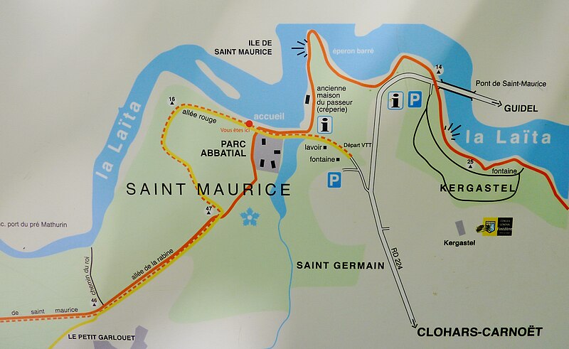 L’ancienne abbaye Saint-Maurice, dite de Carnoët, se situe à Clohars‑Carnoët sur la rive droite de la ria de la Laïta, quelques kilomètres au sud de Quimperlé. Il s’agit d’une abbaye cistercienne en ruines qui conserve toutefois des éléments architecturaux remarquables plongés dans un cadre naturel apprécié des promeneurs. Le site intéresse également les naturalistes pour la présence d’arbres anciens et d’une colonie de chauves‑souris. Les sources évoquent une fondation au Moyen Âge : la salle capitulaire date du XIIIe siècle, tandis que d’autres documents placent la fondation entre 1170 et 1177 par Maurice Duault de Croixanvec, devenu abbé et plus tard vénéré sous le nom de saint Maurice. Fille de l’abbaye Notre‑Dame de Langonnet, la communauté bénéficia d’importantes donations, dont des droits de prélèvement de bois sur la forêt de Carnoët, qui furent parfois abusés au point d’entraîner des sanctions judiciaires au XVIe siècle. L’abbaye prospéra pendant plusieurs siècles mais connut de nombreuses campagnes de construction et de réparation : le chœur fut refait et décoré au XVe siècle, des travaux eurent lieu au XVIe siècle et l’église ainsi que le monastère furent largement reconstruits au XVIIe siècle. Pendant la Révolution, l’abbaye fut vendue comme bien national et partiellement pillée ; en 1799 une bande de chouans pénétra dans l’enceinte et maltraita des personnes liées au monastère. Au XIXe siècle une partie du site fut transformée en habitation et en château, et la relique attribuée à saint Maurice fut transférée et célébrée à Langonnet en 1880 ; la salle capitulaire fit l’objet d’une restauration en 1893‑1894. Fortement endommagé pendant la Seconde Guerre mondiale, le château, utilisé par l’armée allemande, fut incendié en avril 1945 puis en grande partie détruit par les propriétaires en 1953 ; de l’ensemble monastique subsistent aujourd’hui la salle capitulaire, le chartrier, la façade de l’église et une partie des bâtiments abbatiaux. Le domaine, dont la superficie est indiquée dans les sources autour de 118 à 123 hectares, a été acquis par le Conservatoire du littoral en 1991 qui a engagé des travaux de restauration du bâti et de gestion forestière. La salle capitulaire a été inscrite au titre des monuments historiques le 2 mai 1956, et l’ensemble des autres bâtiments ainsi que le site ont été inscrit le 8 août 1995. On peut encore voir la salle capitulaire et le chartrier du XIIIe siècle, la grange, la ferme abbatiale, le fronton de l’abbatiale du XVIIe siècle et l’orangerie du XVIIIe siècle. La ferme abbatiale accueille une exposition sur la vie cistercienne et l’histoire du lieu ; le grenier abrite une colonie de grands rhinolophes observable grâce à une caméra infrarouge. Le domaine boisée présente également des vestiges de fortifications de l’âge du fer et les rives de la Laïta en font un lieu de promenade apprécié, géré par la commune de Clohars‑Carnoët dans le cadre d’un site naturel protégé. Le site est cependant menacé par la montée des eaux liée au réchauffement climatique : des digues ont été élevées pour protéger l’abbaye, mais une élévation d’un mètre du niveau de l’eau pourrait temporairement submerger la salle capitulaire, avertit un représentant du Conservatoire du littoral. Parmi les abbés connus, la liste des réguliers débute par Maurice Duault (1177‑1191) puis Hervé Ier de Caborel (1192‑1220) et s’étend jusqu’à Jean II de Kerdeffrec’h (1529‑1541) ; les abbés commendataires, à partir du milieu du XVIe siècle, comprennent notamment Jean III du Staër, Jean IV Eudes de Vivier, Guillaume VI de Launay, Guillaume VII Riou et, pour la période finale, Jérôme‑François de Keroulas.