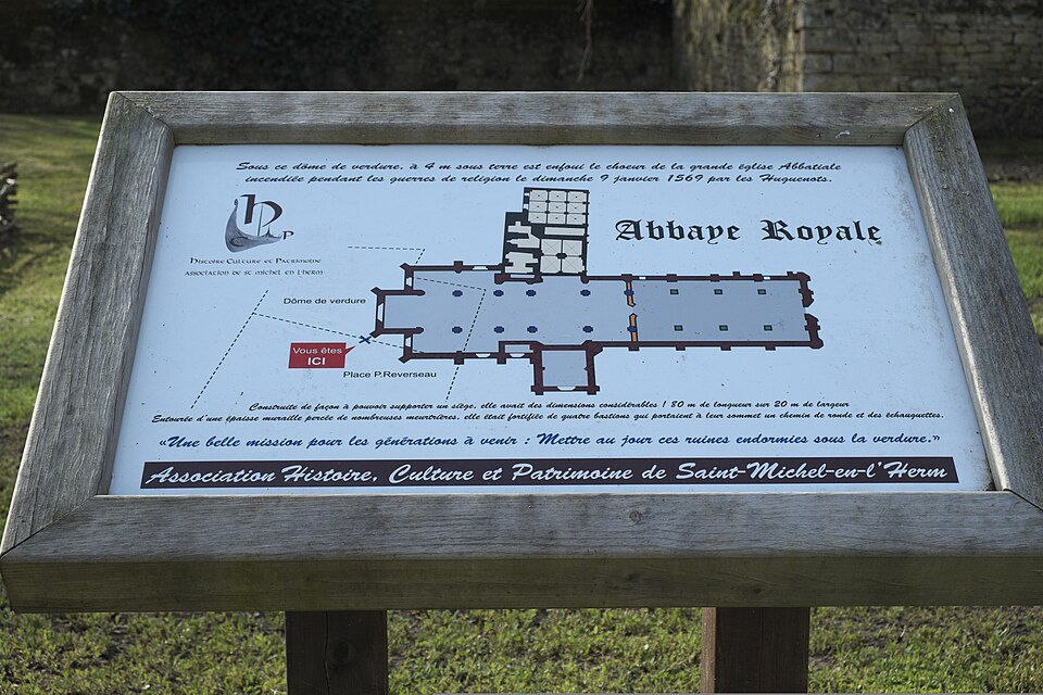 L'ancienne abbaye royale de Saint-Michel-en-l'Herm, située en Vendée, est un ancien monastère bénédictin aujourd'hui propriété privée et classé monument historique depuis 1973. Sa fondation est attribuée à l'évêque de Poitiers Ansoald à la fin du VIIe siècle, sur une île au confluent du Lay et de la Sèvre niortaise, d'où ses anciens noms Condate ou Vieux-Condet. Dès ses origines le monachisme y prit une forme érémitique d'inspiration irlandaise, tournée vers l'évangélisation, et le choix du vocable saint Michel et du terme « Herm » souligne l'idée d'un établissement en désert. L'abbaye passa sous la règle de saint Benoît en 817 sous l'abbé d'alors de Noirmoutier, Arnoux. Détruite par les Normands en 877, elle servit de base aux incursions vikings pendant près de quatre-vingts ans avant d'être restaurée à partir du Xe siècle ; les travaux de reconstruction entrepris par Ebles s'étendirent près de soixante-dix ans et aboutirent à la consécration d'une église en 1047. Aux Xe et XIe siècles, l'abbaye connut des changements de suzeraineté et dépendances, passant notamment sous l'influence des vicomtes de Thouars puis retrouvant son indépendance en 1041 avec l'arrivée de moines venus de Luçon. Fortement impliquée dans les rivalités féodales et régulièrement menacée par les incursions, elle fit l'objet de nouvelles constructions après un incendie en 1048 et fut consacrée à nouveau en 1078. Aux XIIe, XIIIe et XIVe siècles l'abbaye s'affirma comme un acteur économique majeur grâce à un réseau de possessions terrestres et maritimes, au commerce, et surtout au sel ; elle finança d'importants travaux d'endiguement, de canalisation et de drainage du Marais poitevin, souvent en paréage avec des seigneurs locaux et d'autres abbayes, comme en témoigne le canal des Cinq-Abbés. Malgré sa richesse, elle dut néanmoins payer des rançons pour échapper à certaines destructions pendant la guerre de Cent Ans et renforcer ses défenses après des attaques. Pendant les guerres de Religion, l'abbaye, refuge des biens de l'évêque de Luçon et place forte catholique, fut assiégée et prise par les huguenots en 1568 ; le pillage entraîna la perte d'archives et de la bibliothèque, des destructions matérielles importantes et un lourd bilan humain. À partir de la fin du XVe siècle l'abbaye entra dans la période des abbés commendataires, accentuée après le concordat de 1516 : des titulaires issus de familles aristocratiques furent nommés par le roi, parmi lesquels plusieurs figures notables apparaissent dans la succession connue des abbés. La restauration entreprise à la fin du XVIe siècle resta incomplète faute de moyens, et le testament de Jules Mazarin, abbé de 1651 à 1661, ainsi que des décisions royales afférentes, fragilisèrent encore la communauté avant qu'une partie des revenus ne soit finalement conservée pour la mense conventuelle. En 1669, face au dépeuplement, l'évêque de Luçon fit appel à la congrégation de Saint-Maur, qui lança une reconstruction confiée à l'architecte François Le Duc entre 1685 et 1705 ; cette campagne comprit notamment le logis de l'abbé, le réfectoire et le dortoir, le remblaiement et la réorganisation des espaces médiévaux, puis la reconstruction d'une église au XVIIIe siècle sur un plan plus modeste. À la veille de la Révolution le monastère avait fortement décliné : en 1789 il ne comptait plus qu'un prieur et six moines titulaires, et en 1790 l'ensemble fut vendu comme bien national, les religieux se dispersèrent et de nombreux bâtiments et biens furent vendus ou détruits ; la bibliothèque, inventoriée à 3 506 volumes, fut dispersée. Racheté en 1792 par Jean-François Didelot puis, en 1818, par Julien Anne Le Roux, l'ensemble est resté dans la descendance de cette famille ; plusieurs descendants des Le Roux en sont aujourd'hui propriétaires. Le patrimoine de l'abbaye témoigne de ses cinq états successifs : les éléments les plus anciens subsistants correspondent à la « basse église », aujourd'hui partiellement enfouie, tandis que la salle capitulaire du XIIe siècle, le chauffoir et le réfectoire du XIIIe siècle, ainsi que des vestiges romans et des chapiteaux, attestent de la riche période médiévale. Les mauristes ont laissé des bâtiments majeurs — logis abbatial, réfectoire, dortoir — qui s'appuient sur un remblaiement ayant mis les structures médiévales en sous-sol, et l'abbaye conserve par ailleurs des constructions du XVIIIe siècle comme le logis de l'Aiguier et son pigeonnier. La succession des abbés, dont la liste partiellement connue court du Xe au XVIIe siècle et s'achève avec Jules Mazarin, comporte de nombreux noms cités dans les sources et illustre la longue continuité institutionnelle de Saint-Michel-en-l'Herm.