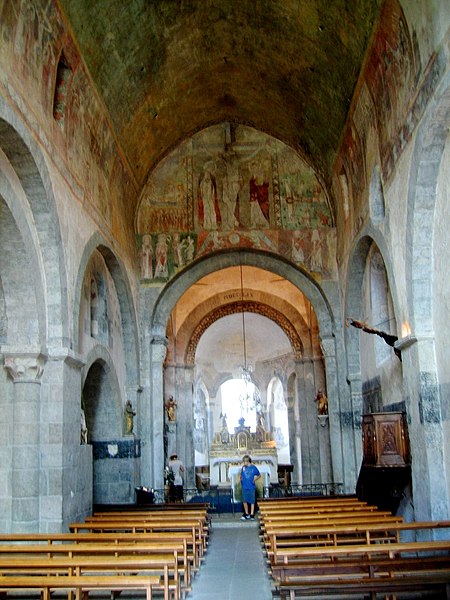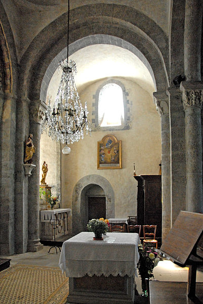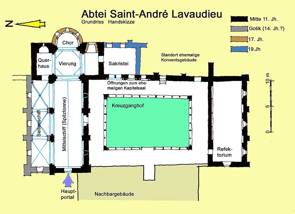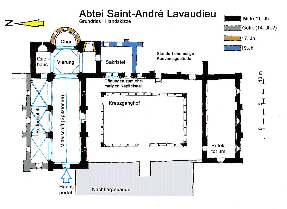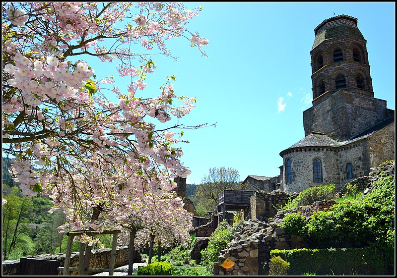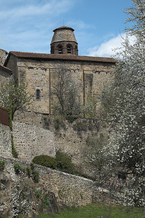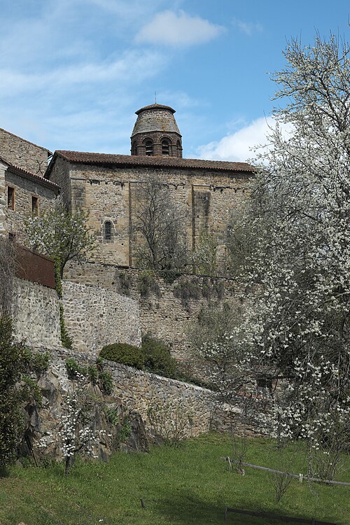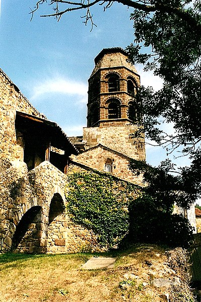 L'abbaye Saint-André-de-Lavaudieu est un ancien prieuré de moniales bénédictines situé à Lavaudieu, en Haute-Loire, qui dépendait de l'abbaye de La Chaise-Dieu et de l'ancien diocèse de Saint-Flour. Fondé au XIe siècle, le prieuré connaît son apogée au XIIe siècle, période durant laquelle sont édifiés l'église prieurale, le cloître et une grande partie des bâtiments conventuels. L'église abbatiale romane et le cloître subsistent, et le réfectoire, décoré de peintures, est également préservé. Le cloître, de petites dimensions mais complet, alterne colonnes simples et jumelées surmontées de chapiteaux historiés ; sa partie la plus ancienne se trouve sur le côté ouest. Des chapelles latérales ont été ajoutées au nord de la nef au XIIIe siècle. Un important cycle de peintures orne l'arc triomphal et la nef ; on y lit des scènes de la Crucifixion, des épisodes de la Passion, des évangélistes et des représentations mariales, nombre de ces peintures ayant été recouvertes entre le XVIe et le XIXe siècle et redécouvertes en 1966-1967. Le réfectoire porte une fresque de la fin du XIIe siècle, de style byzantinisant avec une influence syrienne, et des fragments d'une peinture du XIIe siècle représentant le Christ en majesté et la Vierge ont été retrouvés en 1896. Parmi les sujets figurés figurent l'Annonciation, la Dormition de la Vierge, saint André, saint Christophe, un évangéliste, l'assomption de sainte Madeleine, une allégorie de la Mort d'influence italienne, ainsi que la légende de sainte Ursule et des onze mille vierges, cette dernière repeinte au XVIe siècle à l'emplacement d'une scène de 1315 abîmée par l'humidité. Le mur nord, qui porte un cartouche daté de 1315, présente un aspect gothique. À partir du XVIe siècle, l'abbaye passe en commende et adopte la règle des chanoinesses, le recrutement se faisant alors parmi la noblesse auvergnate ; les religieuses quittent le dortoir au-dessus du cloître pour vivre dans des maisons individuelles à l'arrière du monastère tout en conservant des offices communautaires. Les supérieures portent le titre d'abbesse à partir de 1718 et des appartements pour l'abbesse sont aménagés au XVIIIe siècle au-dessus de la galerie ouest du cloître. Le cardinal de Rohan y trouva refuge au XVIIIe siècle après l'affaire du collier. Lors de la Révolution, les chanoinesses quittent le monastère en 1791 ; l'abbaye est vendue comme bien national en 1792, morcelée et partiellement transformée en bâtiments agricoles, le côté ouest du cloître étant modifié pour la stabulation et le passage des charrettes, et le clocher tronqué en 1793. Des campagnes de restauration ont ensuite cherché à mettre en valeur les vestiges conventuels intégrés au village, et le site a servi de décor pour le film Les Rivières pourpres 2. Propriété de l'État pendant une période, la propriété a été transférée à la commune par convention le 28 juin 2007 ; les bâtiments, protégés au titre des monuments historiques, appartiennent à la commune et se visitent. Plusieurs éléments bénéficient d'une protection officielle : l'église abbatiale et le cloître ont été classés en 1862, le réfectoire orné de fresques classé en 1932, des parties des bâtiments abbatiaux protégées en 1958, l'ancien logis de l'abbesse classé en 1966 et les jardins inscrits en 2001. Les dimensions intérieures sont encore mesurables : l'église a une longueur de 26,70 m, la nef une largeur comprise entre 5,30 et 5,60 m, le transept une largeur de 12,15 m et une hauteur de nef d'environ 14 m ; le cloître et le réfectoire mesurent chacun environ 15,6 × 5,5 m. La succession des prieures et des abbesses est bien documentée, de même que l'ensemble des biens et prieurés rattachés au prieuré au fil de son histoire.