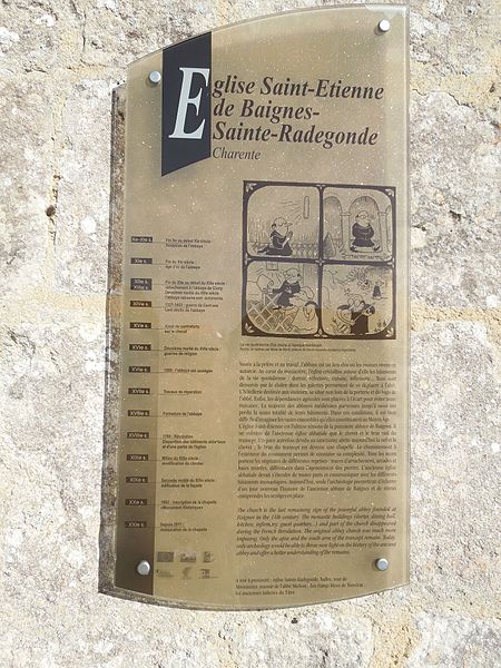 L'abbaye Saint‑Étienne est une ancienne abbaye bénédictine située à Baignes‑Sainte‑Radegonde (Charente), devenue l'église paroissiale de la commune. La tradition lui attribue des origines très anciennes, parfois rattachées à saint Martial ou à Charlemagne, mais les recherches la situent à la fin du Xe ou au début du XIe siècle ; elle fut consacrée un 15 mai entre 1060 et 1066. Placée sous l'invocation de saint Étienne et relevant de l'archiprêtré d'Archiac, l'abbaye est connue par un cartulaire dont la plus ancienne charte date du 14 février 1083. Elle connut d'abord une période de prospérité grâce aux libéralités des seigneurs de Barbezieux et de Montausier, puis subit les conséquences des invasions anglaises et des guerres de Religion, après lesquelles elle eut surtout des abbés commendataires ou non résidents. À son apogée, elle dépendait d'une cinquantaine de prieurés ou de cures locaux ; dans les derniers siècles avant la Révolution, l'abbé pouvait, sous certaines conditions, proposer leurs titulaires, qui étaient ensuite institués par l'évêque de Saintes. En 1789 l'abbaye ne comptait plus que quelques religieux ; la Révolution dispersa les derniers religieux et vendit les bâtiments comme biens nationaux, à l'exception de l'église devenue paroissiale. Les bâtiments conventuels ont totalement disparu, mais l'église conserve des éléments anciens : le large chœur reçut un chevet plat muni d'arcatures extérieures vers la fin du XIIe siècle, des contreforts d'angle furent ajoutés à la fin du Moyen Âge et des buttresses plus massives vinrent renforcer les murs au XVIIe siècle. Des fenêtres de style gothique datent du XVe siècle. D'importants travaux au XIXe siècle ont porté sur la voûte, le crépi, la toiture, le clocher et la façade, restaurations dirigées en 1827 par J. Tessier puis en 1889‑1890 par A. Boisnier. Parmi les vestiges subsistent les murs gouttereaux, une chaire dans la nef et, dans la partie contiguë à la nef, des colonnes avec leurs hauts chapiteaux de l'église primitive. Une chapelle voûtée d'ogives conserve des traces de peintures murales et une niche avec piscines ; cette chapelle, isolée de la nef, aurait servi de seconde église paroissiale, dite Saint‑Nicolas, après la destruction de l'église du village en 1562. La succession des abbés est connue depuis le XIe siècle et figure dans les sources, qui mentionnent notamment Adémar Ier (1032‑1037) et, aux XVIIIe siècles, la famille Des Balbes de Berton de Crillon parmi les derniers abbés avant la Révolution. L'abbaye Saint‑Étienne a été inscrite au titre des monuments historiques en mars 1992.