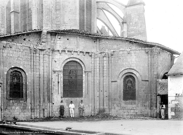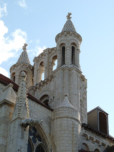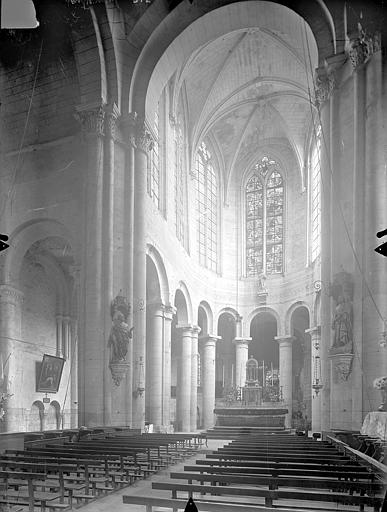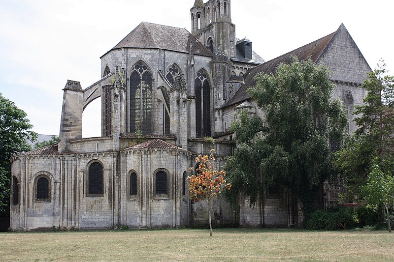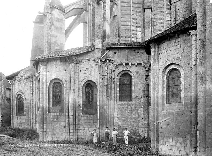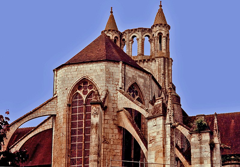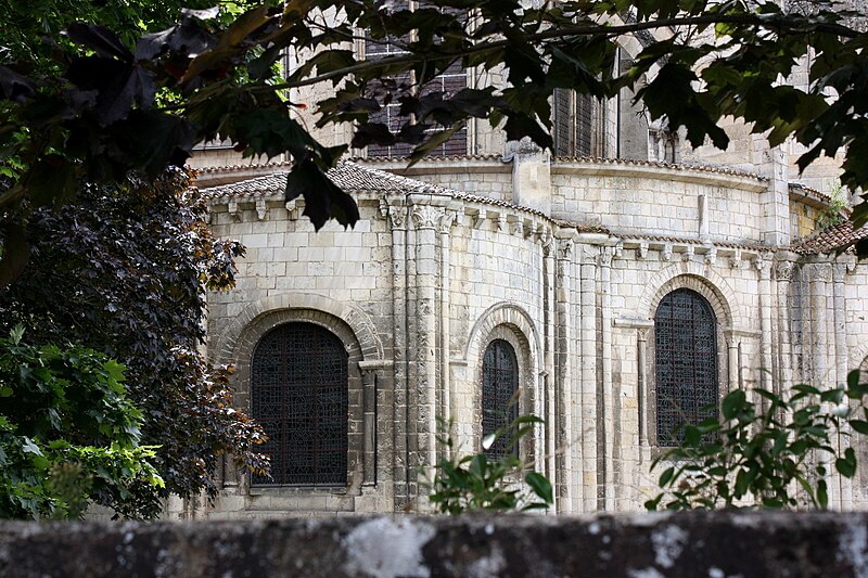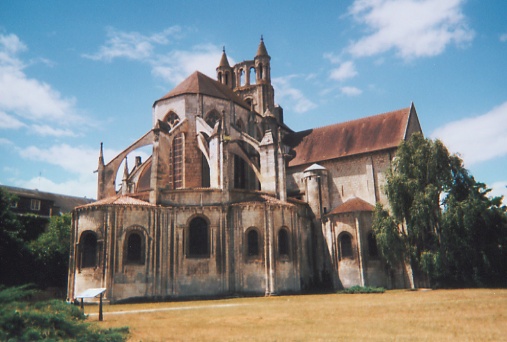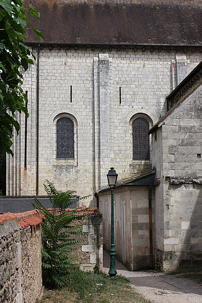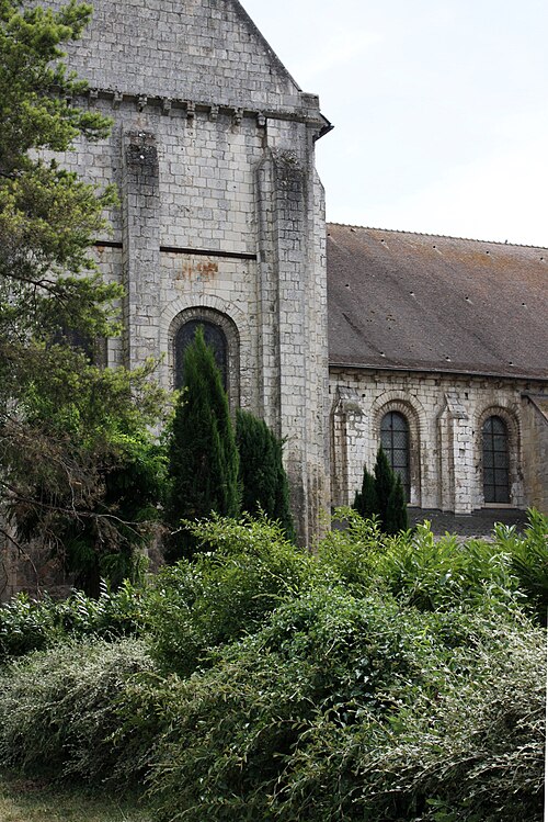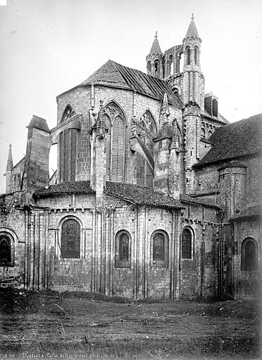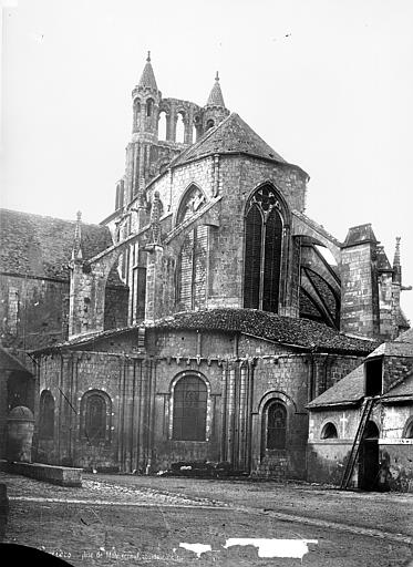 Le chevet, de style gothique rayonnant, a été reconstruit avec des arcs-boutants proches de la maçonnerie portant encore leurs gargouilles et ornés des armoiries des abbés ; deux arcs-boutants à double arc semblent traduire des reprises, et l'ensemble a été fortement remanié au XVIIe siècle, comme l'indiquent la stéréotomie et des sculptures intérieures. Le chœur, daté de la seconde moitié du XIIIe siècle, associe piles et arcades romanes à une abside pentagonale claire ; les nervures retombent sur des consoles décorées de masques feuillagés et trois chapelles rayonnantes, de type roman, sont consacrées à saint Joseph, à Notre-Dame du Bon Secours (à l'est) et à sainte Barbe.