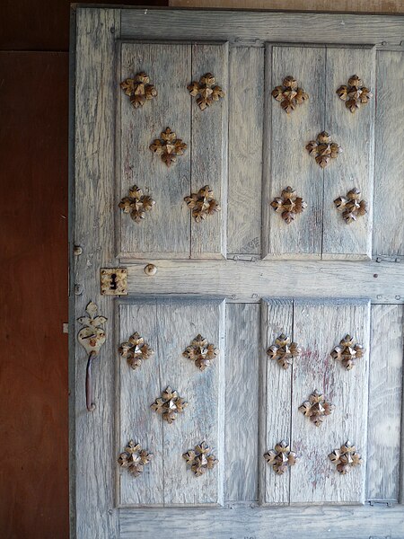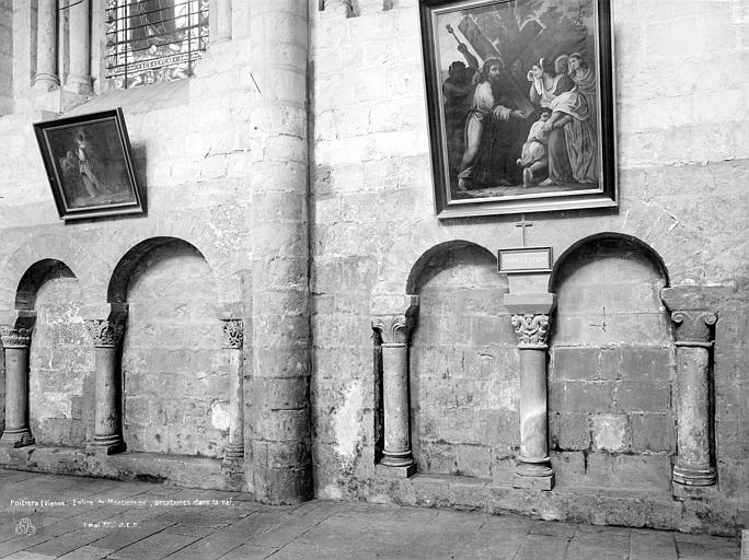 L'église abrite un cénotaphe orné d'un gisant de Guillaume VIII ; le monument qui couvrait sa tombe fut partiellement détruit par l'effondrement des voûtes, reconstruit puis à nouveau démoli à la Révolution, et le gisant restauré au XIXe siècle par l'abbé Sabourin d'après un modèle du XVIIe siècle, d'où son caractère anachronique ; l'œuvre attribuée à un certain Benoist fut vivement critiquée et défendue par son auteur comme une copie fidèle d'une sculpture antérieure. La tombe médiévale, puis sa version du XVIIe siècle, occupait le centre de la nef ; lors de la reconstruction, le monument fut déplacé dans le collatéral sud tandis que le corps resta au centre, si bien que le fondateur reste inhumé au centre de l'église. Les chapelles du transept nord et sud sont respectivement dédiées à saint Isidore et à saint Maurice.