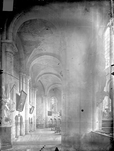 La nef a subi de graves dommages lors de l'incendie de 1562, entraînant l'effondrement des voûtes et du bras sud du transept ; au milieu du XVIIe siècle la travée occidentale fut supprimée pour ouvrir une nouvelle façade classique en moellons décorée de colonnes corinthiennes, d'un fronton et d'ornements baroques, tandis que des éléments de l'ancienne façade romane furent remployés. La nef et les collatéraux furent alors reconstruits en plein cintre à une hauteur moindre que les voûtes originelles, et l'abaissement de la nef a modifié les proportions intérieures ; à la fin du XVIIIe siècle l'effondrement du clocher massif détruisit de nouveau les voûtes et la tombe du fondateur, ne laissant que deux tourelles et des fragments du tambour. Malgré ces transformations, la pureté du plan roman demeure lisible au sol, notamment par la longueur inhabituelle des collatéraux alignés sur le déambulatoire et par l'emploi mesuré du décor monumental : grands arcs de décharge dans les bras du transept, arcatures basses autour de l'abside et larges baies à double ébrasement.