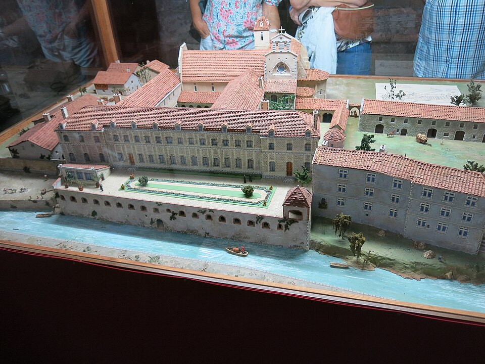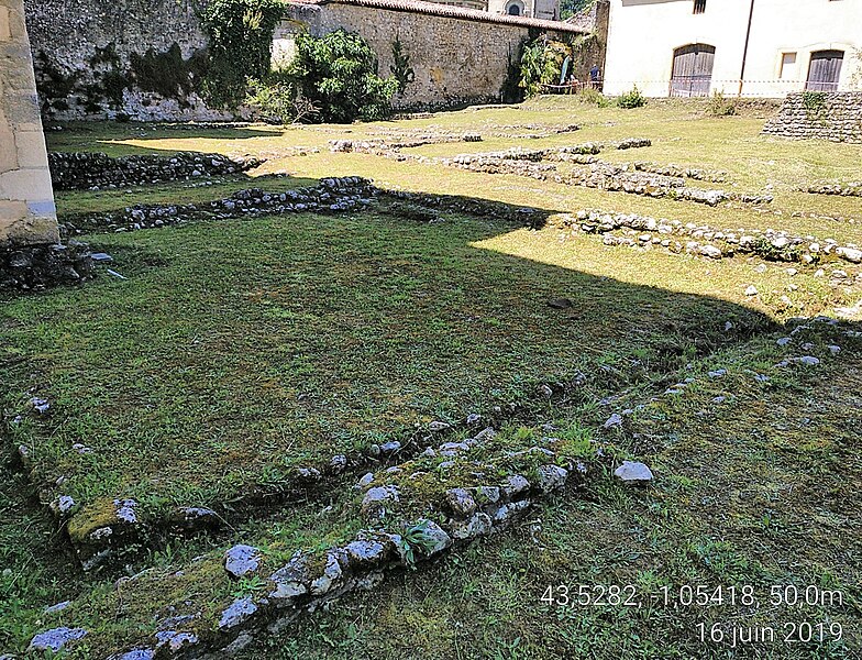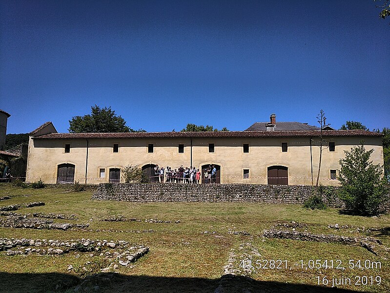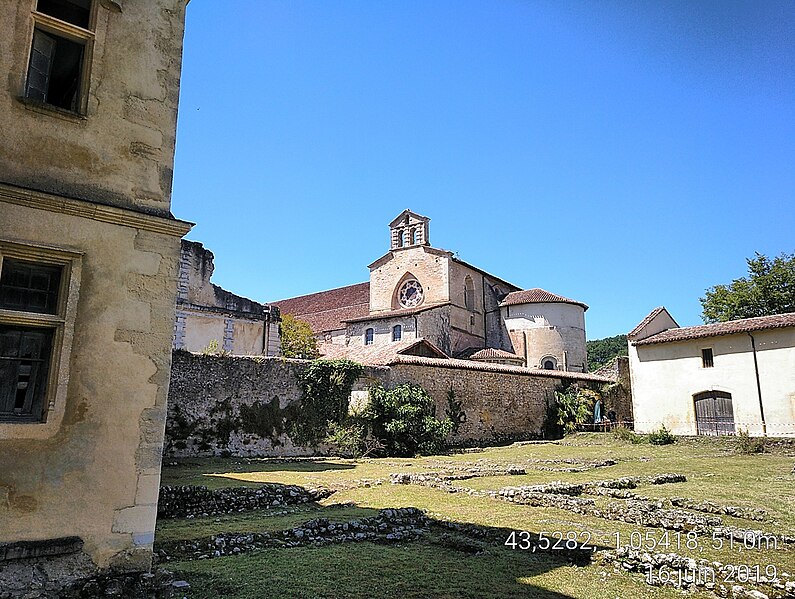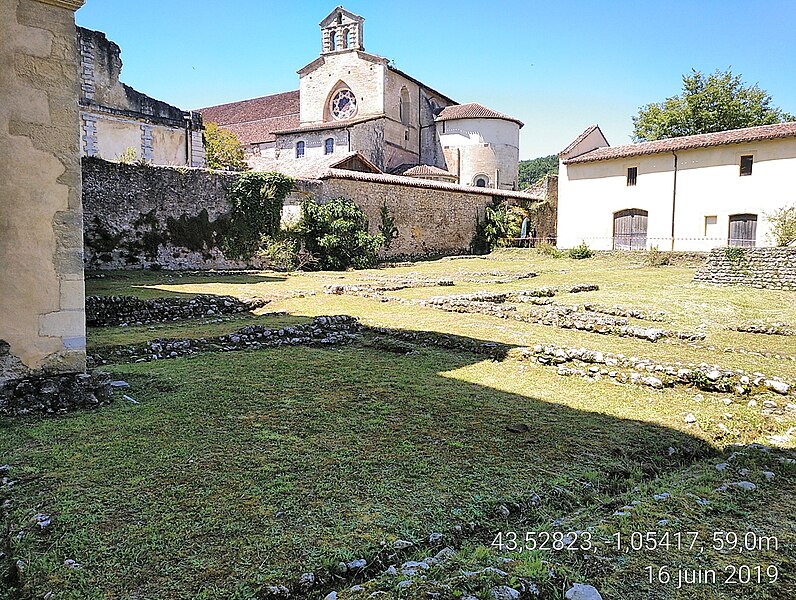 Le plan monastique répond aux besoins liturgiques et aux processions : un chœur développé et un transept central pour la vie communautaire, une nef pour les fidèles et les pèlerins, des absidioles abritant des chapelles et des bas-côtés organisant le déroulement des offices. Le cloître, centre de la vie monastique, avait ici trois galeries et s'articulait avec la salle capitulaire, le grenier des dîmes, le cryptoportique et des granges batelières en sous-sol permettant le déchargement direct depuis le gave, ainsi que des aménagements pour l'élevage et la conservation du poisson. Malgré l'état partiellement ruiné des bâtiments conventuels et la végétation envahissante, l'ensemble conserve des vestiges remarquables qui témoignent de la longue histoire du site, depuis l'occupation romaine jusqu'aux aménagements modernes de protection et de restauration.