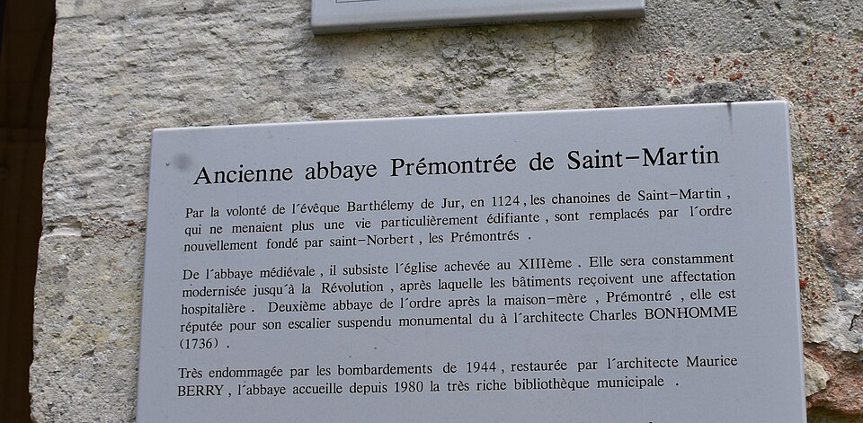 Les origines carolingiennes de l'abbaye de Saint‑Martin à Laon demeurent obscures. Selon Julia Fritsch, l'évêque Barthélemy de Jur installa Norbert de Xanten sur le site en 1119 pour réformer les chanoines ; après l'échec de la tentative, Norbert fonda l'ordre des Prémontrés en 1121 et douze chanoines de Prémontré furent établis à Saint‑Martin en 1124. L'abbaye, considérée parmi les principales maisons de l'ordre, aurait compté jusqu'à 500 frères en 1136, ce qui motiva l'agrandissement de l'église pour accueillir les offices communautaires. L'église abbatiale actuelle a été largement construite au XIIe siècle, principalement dans la seconde moitié de ce siècle. La nef à deux niveaux et les bas‑côtés, couverts initialement d'une charpente apparente, furent édifiés au milieu du XIIe siècle ; le chœur, le transept et la nef sont datés d'environ 1160. Vers 1190, la charpente primitive fut remplacée par des voûtes, nécessitant l'ajout de colonnes engagées, d'arcatures d'appui et d'arcs‑boutants plus puissants, et la façade du bras sud du transept fut surélevée. Le chœur reçut une couverture en charpente entre 1226 et 1240 (dendrochronologie) et la construction des tours se poursuivit jusqu'à la fin du XIIIe siècle. La façade occidentale est postérieure, sa construction débutant autour de 1270, et le tympan du portail nord représente le martyre de saint Laurent, relique importante arrivée vers 1230. Au fil des siècles, des modifications notables furent apportées : les flèches des tours ont été abattues (les dates mentionnées varient entre 1605 et 1737), le palais abbatial et le pavillon dit « vide‑bouteilles » furent élevés entre 1616 et 1621 pour Nicolas Lesaige, et une vaste campagne de reconstruction fut entreprise en 1736 par les architectes Charles et Nicolas Bonhomme. La tour nord‑est fut reconstruite en 1740, l'aile est avec son grand escalier était achevée en 1754, et les ailes nord et ouest ainsi que les galeries du cloître furent reprises entre 1779 et 1788. En 1340, l'abbé Jean de Bruyères reçut l'ordre de fortifier le monastère, ce qui traduit l'importance stratégique et religieuse du site. Au XVIIIe siècle, des démarches aboutirent à l'incorporation de l'abbaye à l'évêché de Laon : des bulles pontificales furent obtenues dans les années 1730, suivies de la prise de possession épiscopale et de l'approbation royale. Après la Révolution, l'église devint paroissiale et, aménagés par l'ingénieur Duroché, les autres bâtiments accueillirent l'hôtel‑Dieu en 1810. En 1944, un bombardement détruisit les bâtiments entourant la cour de la « Communauté », dont les ailes ouest et nord, mettant au jour les pignons médiévaux du cellier et du réfectoire. L'abbaye possédait plusieurs reliques et objets de dévotion — un fragment de la Croix rapporté par le premier abbé Gautier, un os de saint Barthélemy, un os de saint Norbert et le bras gauche de saint Laurent — reliques qui attirèrent indulgences, pèlerinages et une foire annuelle déplacée en 1523 au premier lundi de janvier. Le pèlerinage et les foires connurent des interruptions pendant les troubles de la fin du XVIe siècle, disparurent à la Révolution et les foires subsistèrent au XIXe siècle sous une forme différente. Aujourd'hui, l'emprise de l'abbaye accueille l'hôpital de Laon ; le cloître abrite une médiathèque et l'église reste en usage paroissial.