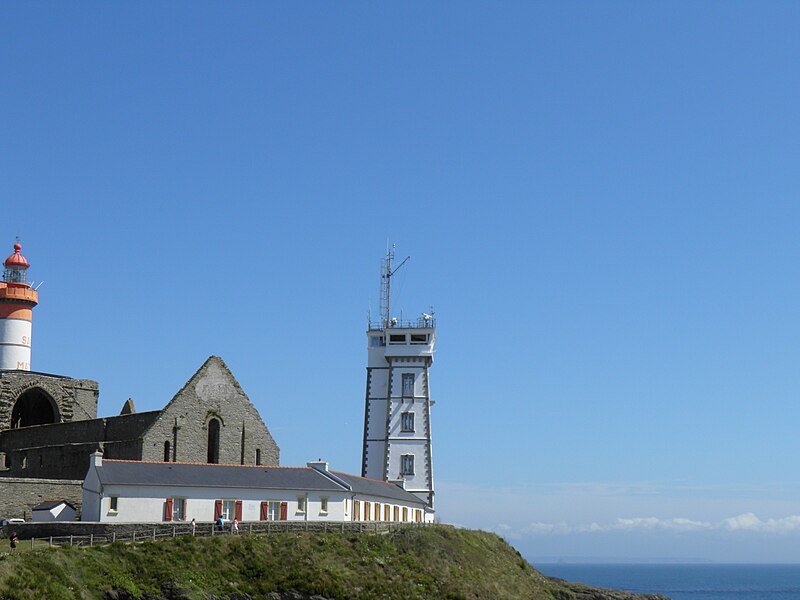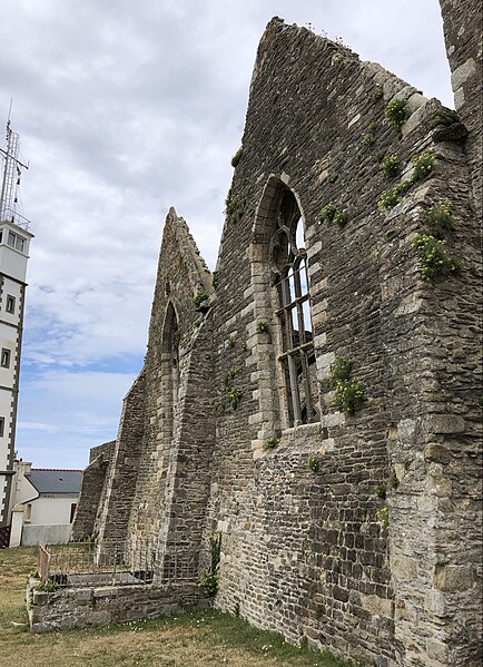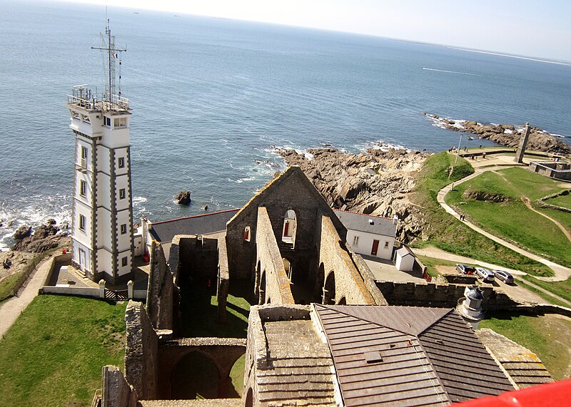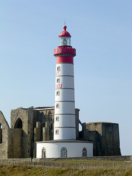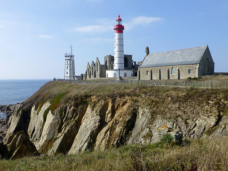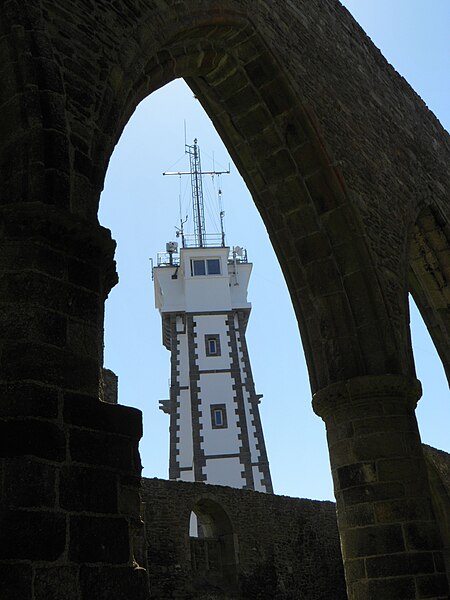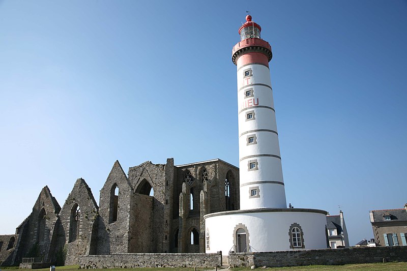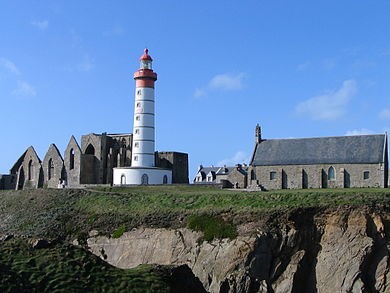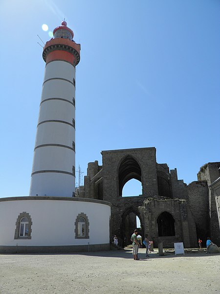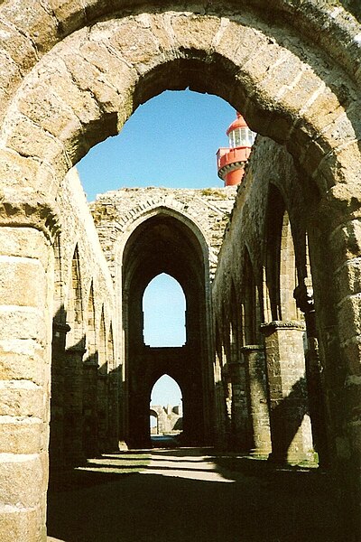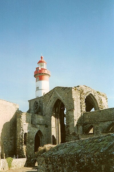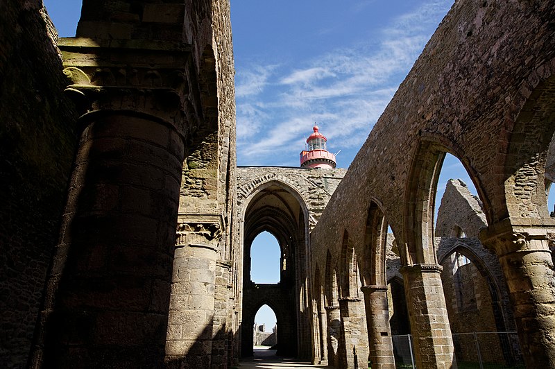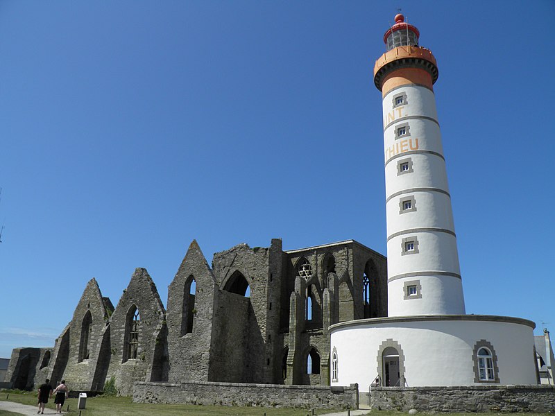 Les ruines de l'abbaye Saint‑Mathieu de Fine‑Terre se dressent sur la pointe Saint‑Mathieu, commune de Plougonvelin, dans le Finistère ; l'abbaye est classée au titre des monuments historiques depuis 1875. On l'appelle aussi abbaye Saint‑Mahé ; les textes indiquent qu'une communauté existait déjà en 555 et la tradition attribue la fondation au VIe siècle à saint Tanguy, qui aurait choisi ce promontoire « au bout du monde ». Une autre tradition, rapportée par Albert le Grand, raconte la translation des reliques de saint Mathieu jusqu'à la pointe, récit légendaire qui a fortement marqué le culte local. Les historiens relèvent toutefois l'absence de sources sûres sur la fondation et il paraît probable que saint Tanguy ait rassemblé un premier noyau monastique. Les vestiges visibles aujourd'hui correspondent au monastère bénédictin reconstruit aux XIe‑XIIe siècles : l'église abbatiale fut élevée entre 1157 et 1208 puis remaniée aux XIVe et XVe siècles. L'emploi de l'opus spicatum et la présence de solins témoignent d'étapes plus anciennes et suggèrent que la nef et le transept existaient dès le Xe siècle. Implantée sur une pointe dominant le chenal du Four, l'abbaye a longtemps contrôlé, avec les comtes de Léon, des droits maritimes et connut un important rayonnement économique à partir du milieu du XIIe siècle. Elle détenait de nombreux privilèges se traduisant par des droits de marché, de four, de mouture, de mesure des denrées, ainsi que le droit de bris et d'épave sur les rivages. Autour de l'abbaye s'était développée, jusqu'au XIVe siècle, une agglomération prospère dotée d'un port à activité internationale et d'une population importante. Le site fut cependant régulièrement exposé aux violences : raids maritimes et pillages frappèrent la ville et le monastère, et le reliquaire de saint Mathieu fut à plusieurs reprises emporté lors de ces incursions. Au XIVe siècle, on fortifia l'ensemble ; une charte ducale ordonna la démolition de maisons voisines pour permettre l'élévation d'ouvrages défensifs et, au début du XVe siècle, une citadelle avec une grande tour carrée fut édifiée. L'abbaye connut au fil des siècles occupations militaires, sièges et passages de garnisons qui contribuerent à son affaiblissement. À la fin du Moyen Âge elle fut placée en commende, situation qui favorisa parfois des abus de gestion et participa au déclin de ses ressources. Aux destructions et aux mises à sac, notamment en 1558, s'ajoutèrent des difficultés administratives et sanitaires qui réduisirent progressivement la population et la prospérité du site. Un renouveau intervint au XVIIe siècle grâce à l'abbé Louis de Fumée et à l'arrivée des bénédictins de la congrégation de Saint‑Maur, qui conduisirent des travaux de restauration, rassemblèrent des reliques et relancèrent les pèlerinages. Une tour à feu, aménagée sur une tour de l'abbaye et dotée d'une lanterne vitrée à la fin du XVIIe siècle, servit de balise pour la navigation avant d'être remplacée par des dispositifs modernisés ; le phare actuel, au pied des ruines, date du XIXe siècle. La Révolution entraîna la dispersion du mobilier, la vente des matériaux et l'abandon progressif du site ; déjà avant l'inventaire révolutionnaire peu de religieux y résidaient. D'importants travaux de mise en valeur ont été conduits depuis 1998 : le site a été dégagé des constructions parasites et les seules implantations modernes proches sont désormais des bâtiments de la Marine nationale et le phare du XIXe siècle. L'abbatiale présente un assemblage d'éléments de différentes époques : la façade ouest, d'inspiration romane et remaniée au XIIe siècle, s'ouvre par une porte à arcade trilobée encadrée de voussures et surmontée de trois fenêtres étroites ; le second niveau en retrait est rythmé par ces baies et par des contreforts plats. Les piliers et grandes arcades de la nef relèvent de la fin du XIIe ou du début du XIIIe siècle ; un bas‑côté sud supplémentaire date du XIVe siècle. Le transept sud et le mur nord conservent un appareillage en opus spicatum, tandis que le chœur et la croisée du transept, voûtés d'ogives et culminant à 18 mètres, appartiennent aux campagnes gothiques de la fin du Moyen Âge et révèlent une influence anglo‑normande, avec un chevet plat de deux travées dont les fenêtres latérales ont conservé leurs remplages. L'édifice comportait une chapelle axiale flanquée de deux chapelles latérales ; seule subsiste aujourd'hui la chapelle nord, les autres ayant été arasées notamment lors de la construction du phare. Le cloître a disparu ; à l'ouest de son ancien emplacement subsiste un mur percé d'anciennes fenêtres murées. À l'angle nord‑est, reliée au transept par des dépendances, s'élève l'ancienne tour à feu du XIIIe siècle, qui fut en partie arasée lors de l'édification du phare. À l'est, les vestiges du bâtiment mauriste du XVIIe siècle livrent au rez‑de‑chaussée quatre pièces identifiées comme la salle d'accueil, le réfectoire des moines, le cellier et le réfectoire des hôtes ; une cave à vin a été mise au jour lors de fouilles. Les murs des jardins, hauts de 4,60 mètres, subsistent en grande partie et bordent une esplanade repavée en moellons et galets qui mène à l'entrée ornée d'un blason sculpté. La même voie conduit à la chapelle Notre‑Dame‑de‑Grâce, relevée en 1881 ; en avant d'elle, un porche du XIVe siècle est le seul vestige conservé de l'ancienne église paroissiale Notre‑Dame‑du‑Bout‑du‑Monde. Les archives de l'abbaye mentionnent une première chapelle dédiée à Notre‑Dame‑du‑Bout‑du‑Monde, remplacée selon un document anonyme par l'église Notre‑Dame‑de‑Grâce au VIIe siècle, et des traces du cimetière paroissial ont été retrouvées lors de découvertes récentes. La succession de