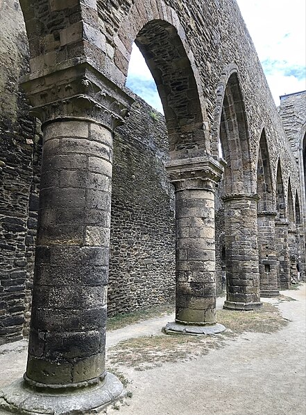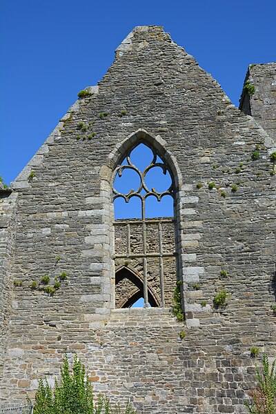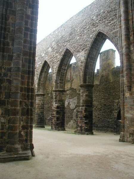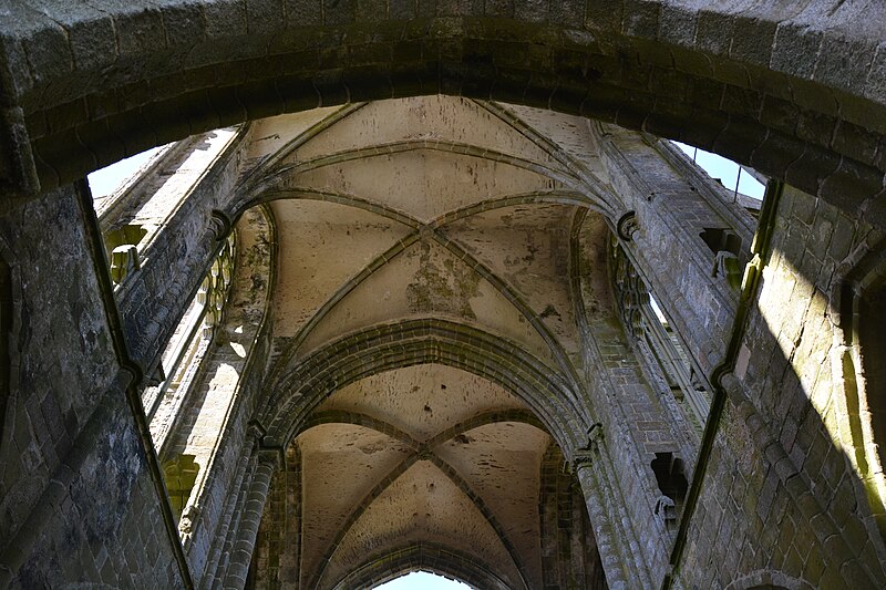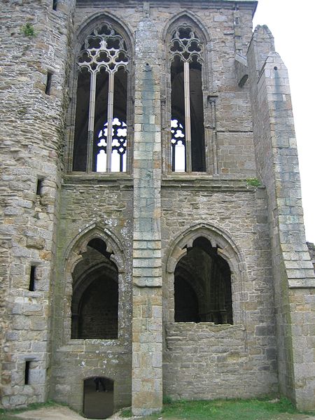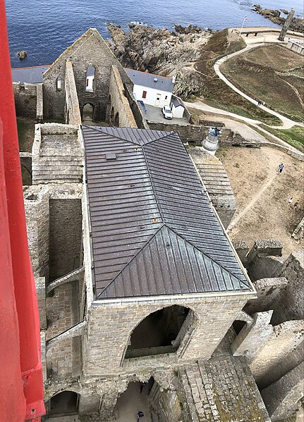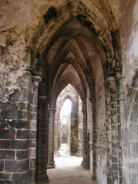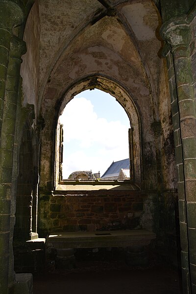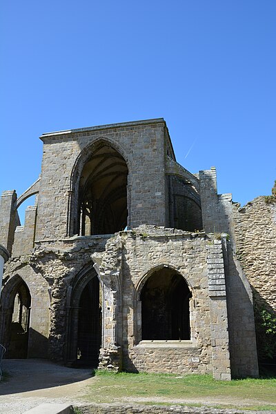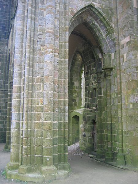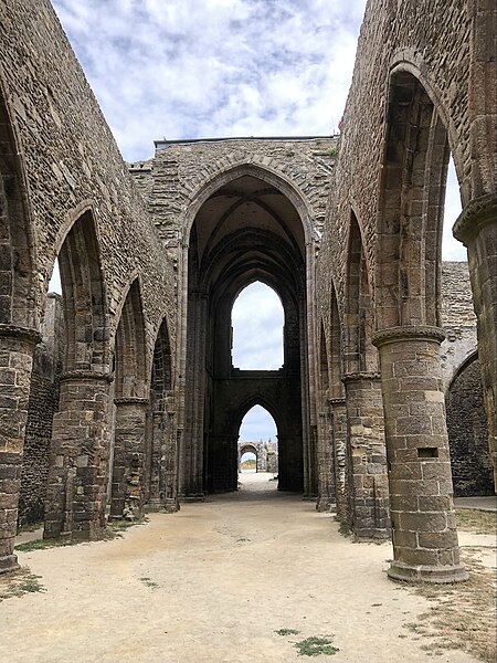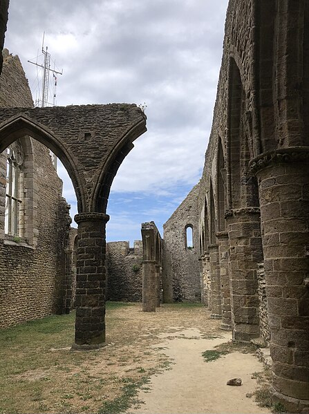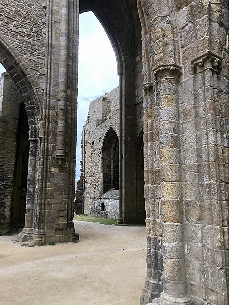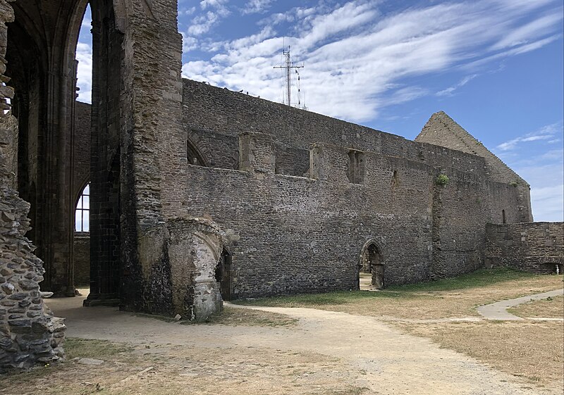 Les ruines de l'abbaye Saint‑Mathieu de Fine‑Terre se dressent sur la pointe Saint‑Mathieu, commune de Plougonvelin, dans le Finistère ; l'abbaye est classée au titre des monuments historiques depuis 1875. On l'appelle aussi abbaye Saint‑Mahé ; les textes indiquent qu'une communauté existait déjà en 555 et la tradition attribue la fondation au VIe siècle à saint Tanguy, qui aurait choisi ce promontoire « au bout du monde ». Une autre tradition, rapportée par Albert le Grand, raconte la translation des reliques de saint Mathieu jusqu'à la pointe, récit légendaire qui a fortement marqué le culte local. Les historiens relèvent toutefois l'absence de sources sûres sur la fondation et il paraît probable que saint Tanguy ait rassemblé un premier noyau monastique. Les vestiges visibles aujourd'hui correspondent au monastère bénédictin reconstruit aux XIe‑XIIe siècles : l'église abbatiale fut élevée entre 1157 et 1208 puis remaniée aux XIVe et XVe siècles. L'emploi de l'opus spicatum et la présence de solins témoignent d'étapes plus anciennes et suggèrent que la nef et le transept existaient dès le Xe siècle. Implantée sur une pointe dominant le chenal du Four, l'abbaye a longtemps contrôlé, avec les comtes de Léon, des droits maritimes et connut un important rayonnement économique à partir du milieu du XIIe siècle. Elle détenait de nombreux privilèges se traduisant par des droits de marché, de four, de mouture, de mesure des denrées, ainsi que le droit de bris et d'épave sur les rivages. Autour de l'abbaye s'était développée, jusqu'au XIVe siècle, une agglomération prospère dotée d'un port à activité internationale et d'une population importante. Le site fut cependant régulièrement exposé aux violences : raids maritimes et pillages frappèrent la ville et le monastère, et le reliquaire de saint Mathieu fut à plusieurs reprises emporté lors de ces incursions. Au XIVe siècle, on fortifia l'ensemble ; une charte ducale ordonna la démolition de maisons voisines pour permettre l'élévation d'ouvrages défensifs et, au début du XVe siècle, une citadelle avec une grande tour carrée fut édifiée. L'abbaye connut au fil des siècles occupations militaires, sièges et passages de garnisons qui contribuerent à son affaiblissement. À la fin du Moyen Âge elle fut placée en commende, situation qui favorisa parfois des abus de gestion et participa au déclin de ses ressources. Aux destructions et aux mises à sac, notamment en 1558, s'ajoutèrent des difficultés administratives et sanitaires qui réduisirent progressivement la population et la prospérité du site. Un renouveau intervint au XVIIe siècle grâce à l'abbé Louis de Fumée et à l'arrivée des bénédictins de la congrégation de Saint‑Maur, qui conduisirent des travaux de restauration, rassemblèrent des reliques et relancèrent les pèlerinages. Une tour à feu, aménagée sur une tour de l'abbaye et dotée d'une lanterne vitrée à la fin du XVIIe siècle, servit de balise pour la navigation avant d'être remplacée par des dispositifs modernisés ; le phare actuel, au pied des ruines, date du XIXe siècle. La Révolution entraîna la dispersion du mobilier, la vente des matériaux et l'abandon progressif du site ; déjà avant l'inventaire révolutionnaire peu de religieux y résidaient. D'importants travaux de mise en valeur ont été conduits depuis 1998 : le site a été dégagé des constructions parasites et les seules implantations modernes proches sont désormais des bâtiments de la Marine nationale et le phare du XIXe siècle. L'abbatiale présente un assemblage d'éléments de différentes époques : la façade ouest, d'inspiration romane et remaniée au XIIe siècle, s'ouvre par une porte à arcade trilobée encadrée de voussures et surmontée de trois fenêtres étroites ; le second niveau en retrait est rythmé par ces baies et par des contreforts plats. Les piliers et grandes arcades de la nef relèvent de la fin du XIIe ou du début du XIIIe siècle ; un bas‑côté sud supplémentaire date du XIVe siècle. Le transept sud et le mur nord conservent un appareillage en opus spicatum, tandis que le chœur et la croisée du transept, voûtés d'ogives et culminant à 18 mètres, appartiennent aux campagnes gothiques de la fin du Moyen Âge et révèlent une influence anglo‑normande, avec un chevet plat de deux travées dont les fenêtres latérales ont conservé leurs remplages. L'édifice comportait une chapelle axiale flanquée de deux chapelles latérales ; seule subsiste aujourd'hui la chapelle nord, les autres ayant été arasées notamment lors de la construction du phare. Le cloître a disparu ; à l'ouest de son ancien emplacement subsiste un mur percé d'anciennes fenêtres murées. À l'angle nord‑est, reliée au transept par des dépendances, s'élève l'ancienne tour à feu du XIIIe siècle, qui fut en partie arasée lors de l'édification du phare. À l'est, les vestiges du bâtiment mauriste du XVIIe siècle livrent au rez‑de‑chaussée quatre pièces identifiées comme la salle d'accueil, le réfectoire des moines, le cellier et le réfectoire des hôtes ; une cave à vin a été mise au jour lors de fouilles. Les murs des jardins, hauts de 4,60 mètres, subsistent en grande partie et bordent une esplanade repavée en moellons et galets qui mène à l'entrée ornée d'un blason sculpté. La même voie conduit à la chapelle Notre‑Dame‑de‑Grâce, relevée en 1881 ; en avant d'elle, un porche du XIVe siècle est le seul vestige conservé de l'ancienne église paroissiale Notre‑Dame‑du‑Bout‑du‑Monde. Les archives de l'abbaye mentionnent une première chapelle dédiée à Notre‑Dame‑du‑Bout‑du‑Monde, remplacée selon un document anonyme par l'église Notre‑Dame‑de‑Grâce au VIIe siècle, et des traces du cimetière paroissial ont été retrouvées lors de découvertes récentes. La succession de