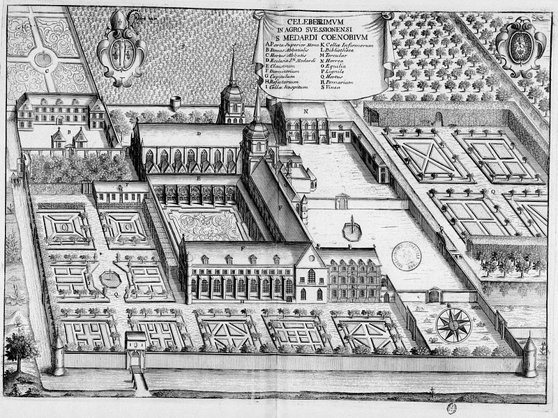 L'ancienne abbaye Saint‑Médard est un monastère bénédictin situé à Soissons, dans l'Aisne. Fondée en 557 par le roi des Francs Clotaire Ier pour abriter les reliques de saint Médard, elle conserva un mausolée provisoire en bois ; Clotaire mourut avant l'achèvement et son fils Sigebert Ier inaugura et orna l'église ; tous deux furent inhumés dans la basilique face au tombeau de Médard. En novembre 751, le dernier Mérovingien, Childéric III, fut déposé dans l'abbaye par Pépin le Bref, qui y reçut également la consécration royale. Sous les Carolingiens, l'abbaye prit une importance considérable et devint, au début du IXe siècle, l'un des domaines seigneuriaux les plus puissants de l'Empire, ses abbés étant considérés comme de premiers seigneurs. Le monastère formait une véritable cité à Soissons où plus de quatre cents religieux vivaient dans un ensemble comprenant basilique, palais royal, palais abbatial, plusieurs églises et chapelles, cloîtres, écoles, cours, jardins et vignes. Hors de la cité, son domaine s'étendait sur de nombreuses dépendances ecclésiastiques et laïques, près de deux cent vingt paroisses, villages, fermes, manoirs et fiefs tels que la seigneurie de Vic‑sur‑Aisne. L'abbaye bénéficia des faveurs impériales, notamment de Charlemagne et de Louis le Pieux : elle reçut le droit de battre monnaie et fut exemptée de contributions financières et militaires. L'Évangéliaire produit au scriptorium, préparé à l'école palatine d'Aix‑la‑Chapelle dans les dernières années du règne de Charlemagne, constitue un exemple majeur de l'enluminure carolingienne du début du IXe siècle. En 825, Louis le Pieux associa l'évêque de Soissons Rothad et le comte Ruotfrid aux fonctions de missi dans le Soissonnais, et l'abbé Hilduin fut chargé de régir plusieurs grandes abbayes dont Saint‑Médard ; en 826 Hilduin y déposa des reliques de saint Sébastien. L'abbaye connut des épisodes de crise politique et d'attaques : en 833 un synode présidé par l'archevêque Ebon de Reims déposa Louis le Pieux, et au IXe siècle les invasions normandes ravagèrent le Soissonnais, provoquant le pillage et l'incendie des bâtiments abbatiaux. En 888, Eudes reprit l'offensive contre les Vikings et fit entourer l'abbaye d'une enceinte munie de tours, fortifiant aussi ses possessions, notamment le château de Vic‑sur‑Aisne. À partir du règne de Charles le Chauve, les abbés laïcs se multiplièrent et percevaient les revenus attachés à l'abbaye ; parmi eux figurent Carloman (abbé laïc de 860 à 870), Herbert II de Vermandois et Herbert l'Ancien. Le moine Odilon, mort vers 920, rédigea une Histoire des translations des reliques de saint Sébastien et de saint Grégoire au monastère à la demande d'Ingramme (ou Enguerrand), prévôt devenu évêque de Laon ; ses textes et d'autres récits liés au monastère furent publiés ultérieurement. L'abbaye fut détruite par les Vikings puis par les Magyars avant d'être reconstruite au XIe siècle. Vers 1079, saint Arnould de Palmèle fut sollicité par Thibaud Ier de Champagne pour pourvoir en religieux les projets monastiques de Vertus, aboutissant en 1081 à la fondation de l'abbaye Saint‑Sauveur avec Sophrone comme premier abbé. L'édifice subit encore des destructions : il fut démoli en 1567 au début des guerres de Religion, partiellement reconstruit en 1630, puis rasé jusqu'à la crypte en 1793. L'historien Otto von Corvin rapporte une accusation selon laquelle l'abbaye aurait servi de lieu de falsification d'actes ecclésiastiques, citant notamment un moine nommé Guernon qui se serait confessé sur son lit de mort ; cette assertion figure dans son essai anticlérical. La crypte et la chapelle ont reçu des protections au titre des monuments historiques : la crypte depuis 1875 et la chapelle depuis le 14 février 1921. Selon Eugène Lefèvre‑Pontalis, l'abbaye connut quatre campagnes de construction aux VIe, IXe, XIIe et XVIe siècles ; la datation de la crypte fait l'objet de débats entre spécialistes, mais sa mention la plus ancienne remonte à 1079. La crypte, composante intégrée de l'édifice et comparable par sa forme à celle de Saint‑Willibrord d'Echternach, s'étendait sous le maître‑autel oriental et mesurait environ 30 mètres de largeur. Des trois chapelles du XIIe siècle, seule la chapelle méridionale subsiste et a été réparée dans les années 1970. L'église abbatiale — aujourd'hui disparue — était une basilique allongée à trois nefs avec collatéraux voûtés, deux tours carrées au transept oriental et, côté ouest, un porche monumental flanqué de deux tours, formant une façade particulièrement imposante. Parmi les abbés connus figurent Carloman, Herbert II de Vermandois, Odoleus (ou Odolenus, dit Oldoric), saint Arnould de Palmèle, Engerrand, Milon de Bazoches et Albéric de Braine, dont le corps exhumé lors de fouilles a été confié fin 2020 à un atelier de conservation pour restauration. Le patrimoine écrit de l'abbaye comprend notamment l'Évangéliaire de Saint‑Médard et un cartulaire daté vers 1201‑1300. Les armes de l'abbaye se blasonnent ainsi : de gueules à une crosse en pal d'or à dextre et une lance de tournoi de même à senestre, garnie d'un guidon d'argent chargé d'une aigle de sable, le tout accosté de deux fleurs de lys d'or.