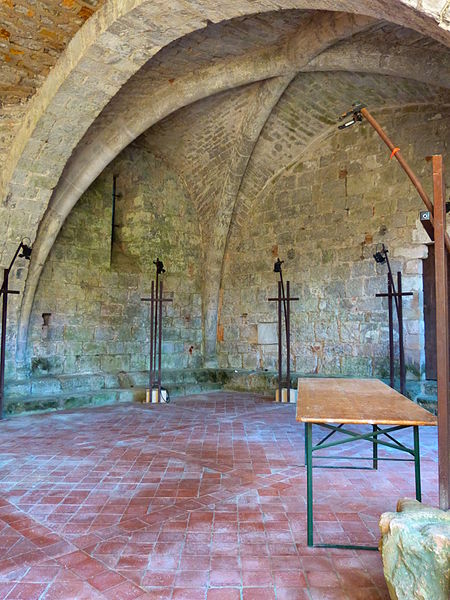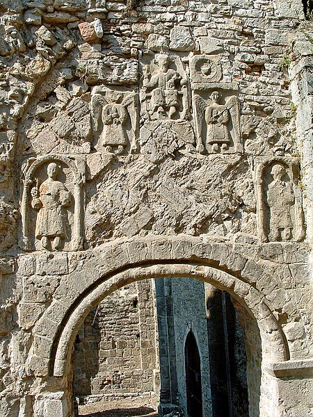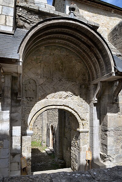 L'église ; les ruines des cloîtres contigüs à l'église et les ruines attenant aux cloîtres : classement par arrêté du 20 novembre 1906 - Les immeubles aux abords de l'église (cad. E 424, 425) : classement par arrêté du 31 mai 1939 - La porte sud de l'enceinte, c'est-à-dire les deux maisons anciennes, le mur auquel ces maisons sont adossées et la partie dont ce mur est percé (cad. E 414, 444) : inscription par arrêté du 13 janvier 1965
