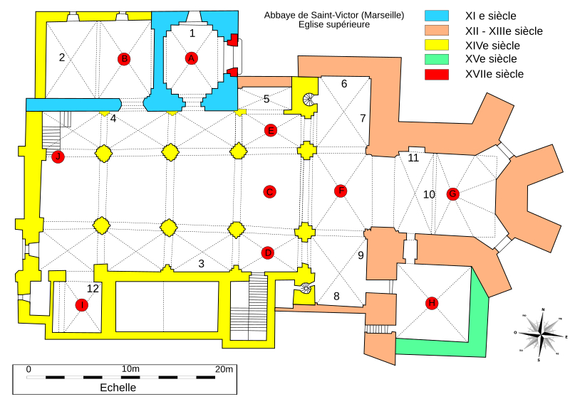 L'abbaye Saint-Victor de Marseille, située dans les Bouches‑du‑Rhône, a été fondée au Ve siècle par Jean Cassien à proximité des tombes de martyrs parmi lesquels saint Victor, qui a donné son nom au lieu. Elle acquiert un rayonnement considérable à la fin du premier millénaire et exerce une forte influence dans toute la Provence ; l'un de ses abbés, Guillaume de Grimoard, sera élu pape sous le nom d'Urbain V. À partir du XVe siècle l'abbaye entre en déclin, mais l'église, bien que le monastère ait été démantelé pendant la Révolution, reste toujours affectée au culte. En 1968 le maire Gaston Defferre fait replacer dans les cryptes la riche collection de sarcophages tard‑antique qui se trouvait au musée du château Borély, faisant de Saint‑Victor l'un des principaux musées d'art chrétien du premier millénaire en Provence après celui d'Arles. Le monument est classé au titre des monuments historiques dès les listes de 1840 et 1862, et l'abbatiale est élevée au rang de basilique mineure par le pape Pie XI en 1934.