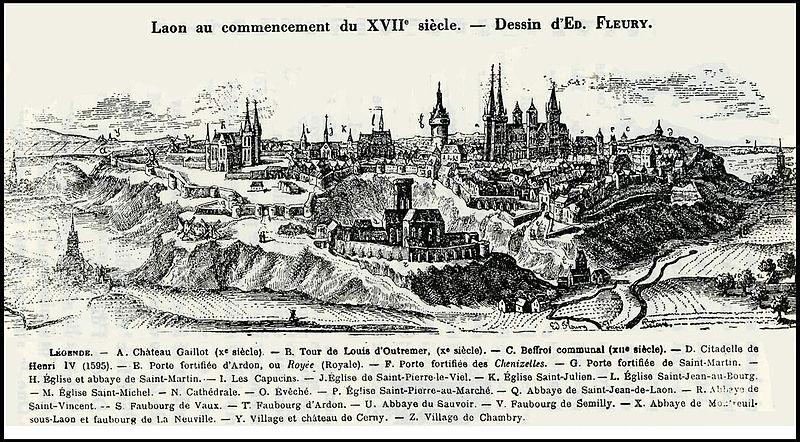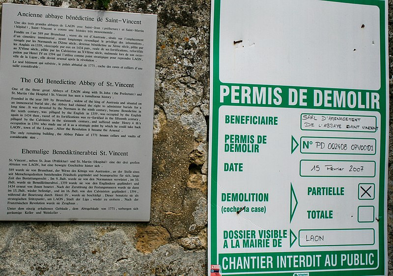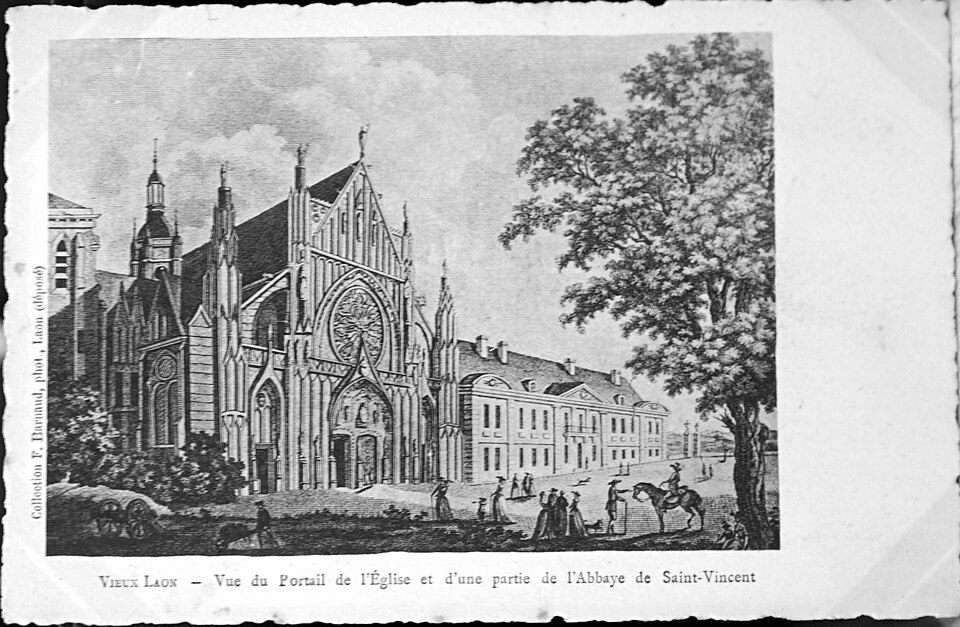 L'ancienne abbaye Saint-Vincent, située à Laon dans l'Aisne, est un établissement colombanien devenu bénédictin au Xe siècle et profondément transformé en arsenal au XIXe siècle. Le site est limité par une enceinte du XIIe siècle, restaurée jusqu'à aujourd'hui, et il conserve deux ensembles de constructions distincts : des vestiges de l'abbaye — enceinte à peu près complète, logis abbatial et bâtiment des hôtes, grand étang, plusieurs puits, celliers, caves et galeries souterraines — et des aménagements liés à l'ancien arsenal — porte d'entrée en pierre calcaire, poudrière, quinze hangars en brique à structure métallique et divers garages, auxquels se sont ajoutés deux hangars au XXe siècle. Selon la tradition l'abbaye aurait été fondée en 589 par la reine Brunehaut, et la fondation est parfois datée du VIe siècle ; la première église connue fut édifiée par l'abbé Rénier dans la seconde moitié du XIe siècle. Au début du XIIe siècle l'évêque Adalbéron fit entourer l'abbaye de murailles et fit construire une chapelle funéraire dédiée à Marie-Madeleine ; la reconstruction majeure de la fin du XIIe siècle comprit le cloître, le grand réfectoire et la remise en état de l'église abbatiale. L'église fut achevée au XVIe siècle, avec une façade de style gothique flamboyant et une tour côté croisillon nord ; à la même époque on entreprit le dortoir et le premier logis abbatial, dont subsistent des celliers et des caves, le logis ayant été en partie démoli au XVIIe siècle. L'abbaye subit de nombreux dommages au cours des siècles : pillages et incendies lors des incursions vikings, incendie et perte de la bibliothèque en 1359, incendie en 1145, dégâts pendant le siège de Laon en 1594 et effondrement partiel d'une voûte en 1612 par manque d'entretien. La réforme de Saint-Maur au XVIIe siècle amorça une vaste campagne de restauration, ponctuée de travaux aux XVIIe et XVIIIe siècles et de la reconstruction du logis abbatial et du bâtiment des hôtes en 1771. Pendant la Révolution l'abbaye fut convertie en hôpital militaire en 1793 puis en maison de réclusion ; vendue comme bien national en 1797, elle fut en grande partie démolie au début du XIXe siècle, si bien qu'en 1810 ne subsistaient guère que la tour de l'église et le logis abbatial. L'armée acquit le site en 1876 et y installa un arsenal, réalisant entre 1879 et 1890 la série de hangars en brique et métal, la porte d'entrée en 1879 et la poudrière en 1880 ; ces aménagements modifièrent profondément l'intérieur du logis abbatial. Le rôle militaire se poursuivit jusqu'à la professionnalisation de l'armée à la fin des années 1990, et l'usage du site a évolué depuis lors. L'ancienne abbaye, qui exerça un rayonnement notable sur l'architecture médiévale et classique du Laonnois pendant l'Ancien Régime, est aujourd'hui difficile à apprécier du fait de la disparition presque totale de ses bâtiments conventuels. Parmi les éléments historiques conservés figurent l'inhumation de l'évêque Adalbéron vers 1030-1031 et, découverte en 1769, une peinture représentant les chevaliers d'Eppes près de tombes datées des XIIIe siècle. Le logis abbatial a été inscrit au titre des monuments historiques en 1926; l'enceinte, les vestiges de l'église et les celliers et caves l'ont été en 1927; le grand étang, la poudrière et les sols archéologiques ont été inscrits en 1999. Un incendie majeur en juin 2008 détruisit toitures et planchers ; des mineurs furent mis en cause dans cet incendie. En décembre 2019 la ville de Laon a acquis l'abbaye pour 260 000 € HT et a envisagé un projet de reconversion en hôtel haut de gamme.