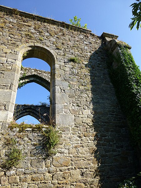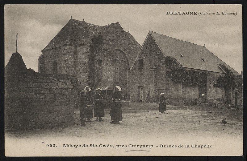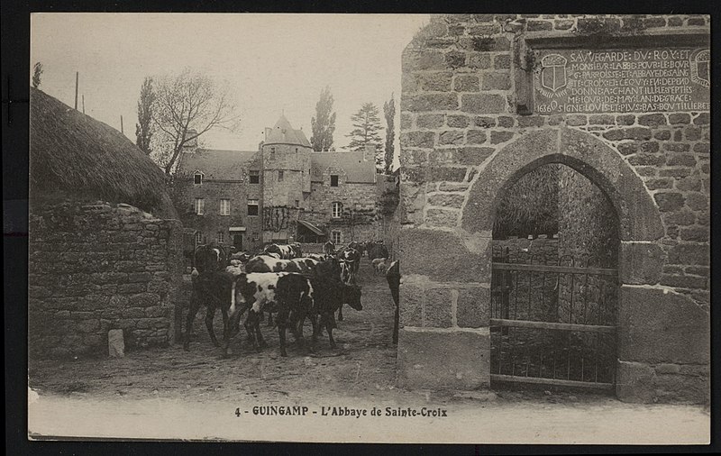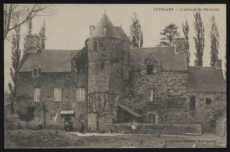 L'ancienne abbaye Sainte-Croix de Guingamp, dans les Côtes-d'Armor, a été fondée en 1134 par le comte Étienne Ier de Penthièvre pour des chanoines réguliers augustins venus de l'abbaye Saint-Victor de Paris. Le premier abbé fut Jean de la Grille, futur évêque de Saint-Malo ; son successeur Moyse fut un temps chassé par le fils du fondateur, Henri, qui plaça sa maîtresse à la tête de la communauté. Jean de la Grille, revenu de Rome porteur d'une lettre d'admonestation du pape Eugène III, obtint le repentir d'Henri ; le comte rappela alors Moyse et les chanoines, maria sa concubine et, à partir de 1151, combla l'abbaye de libéralités avec son épouse Mahaut de Vendôme. Avant de mourir, Henri adressa une lettre de confession au pape Alexandre III pour demander son pardon ; les donations des fondateurs furent confirmées par le pape et par Célestin III. Aux XVe et XVIe siècles, des campagnes de reconstruction furent menées sous les abbés Jean Hamon (1437-1452) et Jean de Kernavanay (1514-1536), la première phase bénéficiant de l'appui du comte Pierre de Guingamp. Lors des combats de la Ligue en Bretagne, Sainte-Croix fut le seul monastère de Guingamp à échapper au pillage des troupes royales. Entre 1592 et 1639, sous l'abbatiat de Pierre Cornulier, les chanoines furent remplacés par six prêtres dont un à la charge de prieur. Au XVIIIe siècle, un prieur fut accusé par trois chapelains de ne plus assurer l'office canonial tout en percevant sa prébende ; l'évêque de Tréguier transféra en 1748 le Saint-Sacrement dans la chapelle de Rochefort. Lors des réparations effectuées vers 1750, on ne conserva que la croisée du transept et le chevet polygonal de l'édifice primitif. À la Révolution, l'abbaye et les bâtiments abbatiaux furent vendus comme biens nationaux et disparurent progressivement. Certains éléments, notamment le manoir abbatial et les restes de l'église, furent inscrits au titre des monuments historiques en 1926. Aujourd'hui subsistent des ruines de l'abbatiale, principalement datées de 1748-1750, comprenant le chevet polygonal et le transept. Le carré du transept est le dernier vestige de l'édifice antérieur (fin du XIIe ou XIIIe siècle) : ses quatre arcades brisées à triple rouleau retombent sur des colonnes aux chapiteaux sculptés de feuilles d'eau et de crochets. Le logis abbatial, d'origine XVIe siècle et remanié, conserve une tourelle d'escalier hexagonale couronnée d'un élément circulaire. L'arcade d'entrée piétonne du portail, datée du XVIIIe siècle, est surmontée d'une plaque de pierre gravée rappelant la sauvegarde accordée à l'abbaye par Louis XIII en 1636. Parmi les abbés et prieurs connus figurent Jean de la Grille (1134-1144), Moyse (à partir de 1144), Jodoin (1190), un certain L. (vers 1202), Daniel (vers 1267), Jean de Plédran (vers 1397), Rolland (Ier, vers 1400), Prigent (1418-1436), Jean Hamon (1437-1452), Bertrand (1453-1497), Rolland (II, 1502-1512), Jean de Kernavanay (1514-1536), Jean le Cozic (1536-1546), Philippe Remond (vers 1556), Pierre Cornulier (1592-1639), Louis Berbier Du Metz (vers 1671), Charles du Plessis d'Argentré (1699-1740), René Joseph de Gouyon-Launay (1741-1762) et Louis-François Freslon de la Freslonnière (1762-1790).