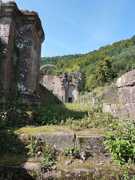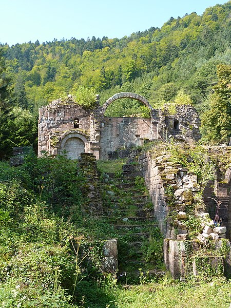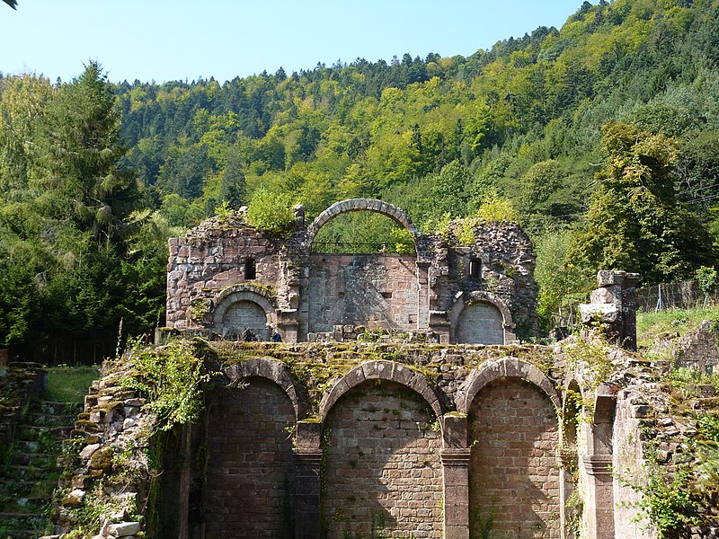 Situées au pied du mont Sainte-Odile, dans le vallon de Niedermunster (commune de Saint-Nabor, Bas-Rhin), les ruines de l'abbaye Sainte-Marie se dressent à environ 511 mètres d'altitude. La tradition attribue à sainte Odile la création au bas de la montagne d'un établissement consacré à saint Martin, avec un hospice pour les pèlerins, qui aurait évolué en monastère de moniales. Selon la légende, une parcelle de la Vraie Croix déposée par Hugues de Tours et apportée par un chameau a renforcé la renommée du lieu et favorisé le culte qui s'y développa. Les abbayes de Hohenbourg et de Niedermunster partagèrent longtemps leur patrimoine jusqu'à la fin du XIIe siècle, puis fonctionnèrent séparément à partir du XIIIe siècle. L'église abbatiale qui subsiste fut édifiée entre 1150 et 1180 et consacrée en 1180 ; le complexe du XIIe siècle comprenait des bâtiments claustraux, trois tours, un hospice et des chapelles. Dès 1016, l'empereur Henri II accorda à l'abbesse Helewig autonomie et droits d'élection. Restaurée au XIIe siècle sous les abbesses Relinde et Herrade de Landsberg, l'abbaye adopta la règle augustinienne et assura jusqu'au début du XVe siècle la liturgie, l'accueil des pèlerins et l'éducation de jeunes filles de la noblesse. Elle reçut de nombreuses donations et posséda des cours et domaines en Basse-Alsace, parmi lesquels Arlesheim, Biesheim, Gertwiller et Saint-Nabor, ainsi que des biens et vignobles sur plusieurs communes. Au XVIe siècle, une succession de catastrophes marqua la fin de la communauté : saccages pendant l'insurrection paysanne, incendies en 1542 et 1572, dispersion des chanoinesses et intégration des biens à la mense épiscopale. Abandonnés, les bâtiments servirent de carrière de pierres pour diverses constructions régionales; seules subsistent aujourd'hui les ruines de l'église abbatiale et une métairie avec une grange construites en 1758 avec des matériaux remployés. Classé au titre des monuments historiques dès 1846, le site a fait l'objet de dégagements et de consolidations au début du XXe siècle, notamment entre 1902 et 1904 sous la direction de Félix Wolff; ces fouilles ont mis au jour de nombreuses sépultures médiévales, dont plusieurs abbesses. Le sceau de l'abbaye connu en 1264 représentait la Vierge en orante ; après l'arrivée de la relique de la Croix, l'effigie du chameau portant la croix y apparut fréquemment. Non loin se trouvent la chapelle Saint-Nicolas, liée à l'hospice des pèlerins et restaurée au milieu du XIXe siècle à l'identique, et l'ermitage Saint-Jacques, dont la fondation légendaire se rattache au voyage du chameau porteur de la Croix. Les ruines ont été acquises par l'évêché de Strasbourg en 1895 et restent un témoignage important de l'histoire monastique du Bas-Rhin.