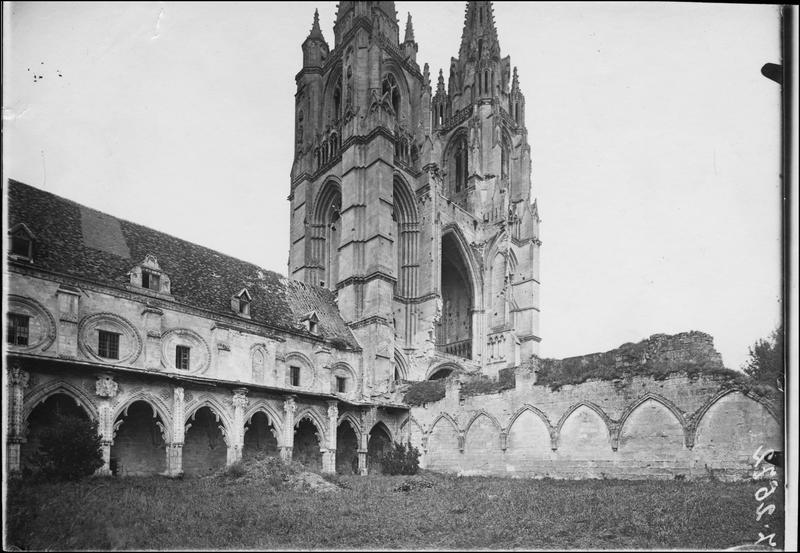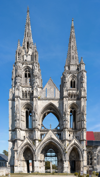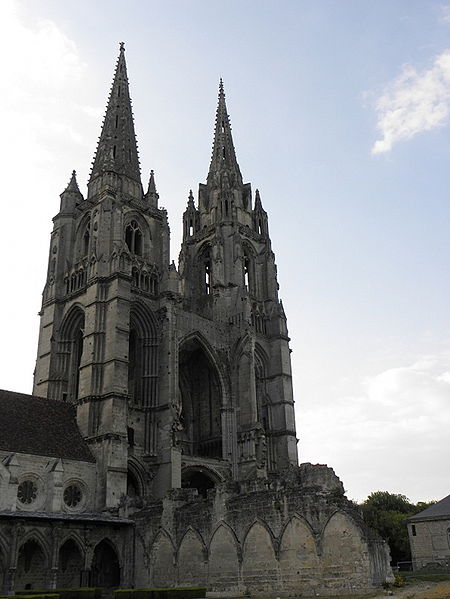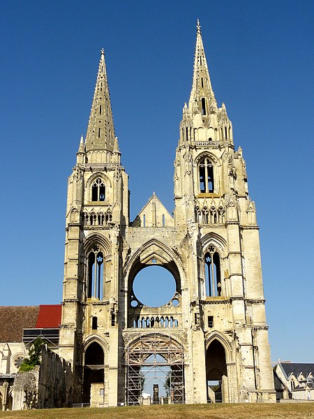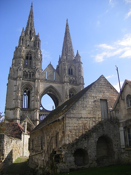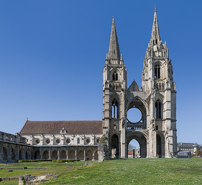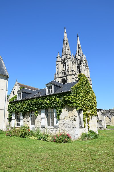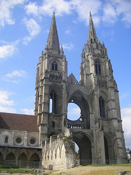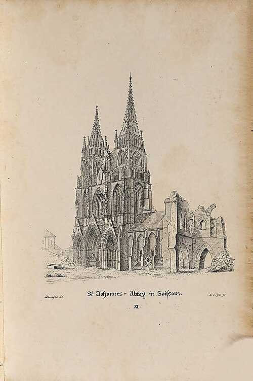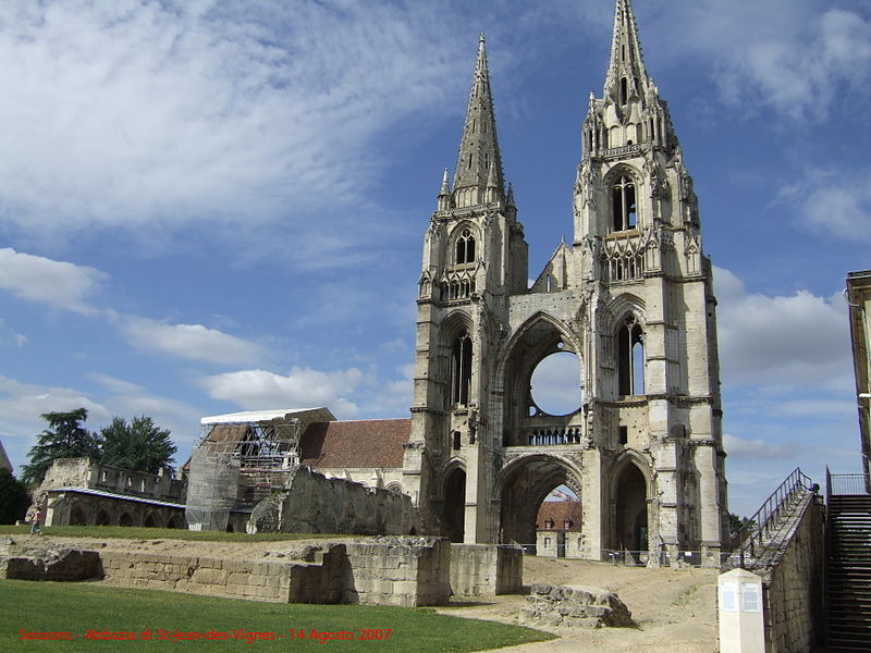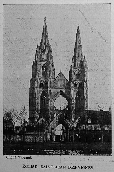 L'abbaye Saint-Jean-des-Vignes est une ancienne abbaye de chanoines réguliers fondée en 1076 par Hugues le Blanc sur la colline Saint-Jean, au sud‑ouest de Soissons (Aisne), de style gothique. Les clochers et les cloîtres datent des XIIIe et XIVe siècles. Hugues restitua cinq paroisses — Charly, Montlevon, Saint‑Aignan, Le Grand Rozoi et Arthaise — ainsi que deux moulins, et Philippe Ier confirma la fondation par lettres patentes en 1076 ; Gui Ier de Châtillon confirma aussi une donation la même année. Douze ans plus tard Hugues acheta trente arpents de vignes et fit d'autres donations en vignes et terres dans la paroisse de Charly ; cette seconde fondation fut confirmée par l'évêque Henri et par le fils d'Hugues, et le monastère prit alors le nom de Saint‑Jean‑des‑Vignes. Une communauté de chanoines johannistes suivant la règle de saint Augustin s'installa à l'abbaye, qui devint la maison mère de l'ordre. Le pape fixa le nombre de chanoines à 90 ; y vivaient aussi environ trente frères convers et, au début, quelques sœurs couturières. Les moines pratiquaient des soins médicaux à base de plantes, ce qui se reflète dans l'abondante décoration florale de l'abbaye, la plus vaste de Soissons, ville qui en comptait sept. À son apogée vers 1520, l'ensemble monastique formait un vaste domaine entouré d'enceintes et d'un fossé ; environ 150 moines en dépendaient et l'abbaye exploitait une trentaine de fermes et possédait une quarantaine de paroisses. Les chanoines exerçaient aussi des fonctions paroissiales ; l'habit des pères était blanc, celui des frères convers noir et violet. Les bâtiments visibles aujourd'hui datent principalement de la fin du XIIIe siècle, période qui vit l'élévation du cellier, des portails, du réfectoire et des cuisines ; la nef fut achevée au XIVe siècle tandis que les tours furent montées ultérieurement. Au Moyen Âge des dons royaux et seigneuriaux, dont ceux du cardinal Jean de Dormans, affluèrent, et des bienfaiteurs plus modestes léguèrent argent, terres ou maisons. Trois donations particulières servirent à l'instruction des novices : Raoul de Presles institua des bourses perpétuelles à Paris, Aubert de Bignicourt fonda le collège Sainte‑Catherine de Soissons en confiant sa direction aux moines, et Jean de Dormans donna la direction de Dormans‑Beauvais. La guerre de Cent Ans entraîna la construction de remparts vers 1375, et en 1414 le quartier général de Charles VI et des Armagnacs s'installa dans l'enceinte durant le siège et le pillage de la ville. Après les troubles on acheva la construction des tours lors de deux grandes campagnes, la grande tour et la petite tour étant terminées aux alentours de 1488–1495 et 1516–1520 respectivement. L'abbatiale, consacrée en 1478 par Jean Milet, était dédiée à la Vierge, à saint Jean‑Baptiste et à saint Jean l'Évangéliste. En 1544 la grande salle reçut Charles Quint du 13 au 16 septembre pour la préparation du traité de Crépy ; par la suite les ingénieurs d'Henri II proposèrent de raser le monastère pour des raisons stratégiques, mais l'abbaye fut finalement intégrée à l'enceinte de la ville, ce qui contraignit à réduire ses clos de vignes. À partir de 1566 les abbés furent souvent nommés commendataires par le roi et devinrent fréquemment absents, la direction religieuse relevant alors du prieur claustral. En 1567 les huguenots commandés par le prince de Condé s'emparèrent de Soissons : l'abbaye fut saccagée, l'église transformée en écurie, l'argenterie et les cloches fondues, la tuyauterie brisée, l'autel renversé, le clocher du réfectoire détruit et les archives presque entièrement perdues, les dégâts étant estimés à plus de 100 000 livres. À la Révolution les 72 moines furent chassés, le mobilier vendu et l'argenterie fondue et envoyée à la Monnaie de Paris ; le dernier grand prieur fut massacré en 1792 à Saint‑Firmin à Paris et l'abbaye fut transformée en manutention militaire avec l'installation de boulangeries. Les bâtiments, bien qu'épargnés de destructions massives grâce à leur usage militaire, se dégradèrent par manque d'entretien ; des vitraux se brisèrent, provoquant un incident lié à des morceaux de verre dans le pain, et il fallut ensuite des travaux de rénovation dont le coût fut estimé à 26 786 livres. Malgré des projets de démolition et la vente de matériaux, les tours furent préservées : l'église fut cédée en 1809 à un maçon et à un charpentier, des pierres furent réemployées pour des maisons à Soissons et la démolition s'arrêta après une vingtaine d'années, mais la nef disparut. Les restes ont nécessité des consolidations, notamment de la flèche, réalisées par des ferrements et des chaînages. Les vestiges appartiennent aujourd'hui à la Ville de Soissons et sont accessibles librement en saison ; la municipalité a engagé, avec le soutien des Monuments historiques, des collectivités et du mécénat, une opération de sauvegarde des deux tours, commencée en 2016 par la purge de la végétation et des éléments dangereux et prévue pour durer une dizaine d'années. Les clochers, les cloîtres, les vestiges des bâtiments et certains logis et terrains font l'objet de protections au titre des monuments historiques, distinguées par des classements et inscriptions effectués entre 1875 et 1947. Les armes de l'abbaye se blasonnent d'azur semé de fleurs de lys d'or, à un chevron de gueules chargé de six ou cinq roses d'argent, surmonté en chef d'un lambel de cinq pendants du même. Parmi les abbés réguliers, Raoul est attesté en 1214.