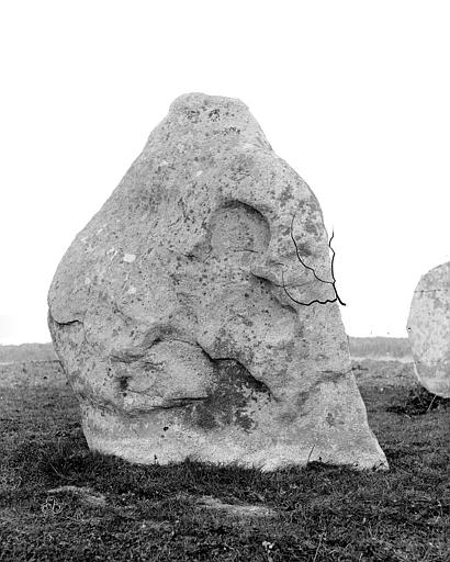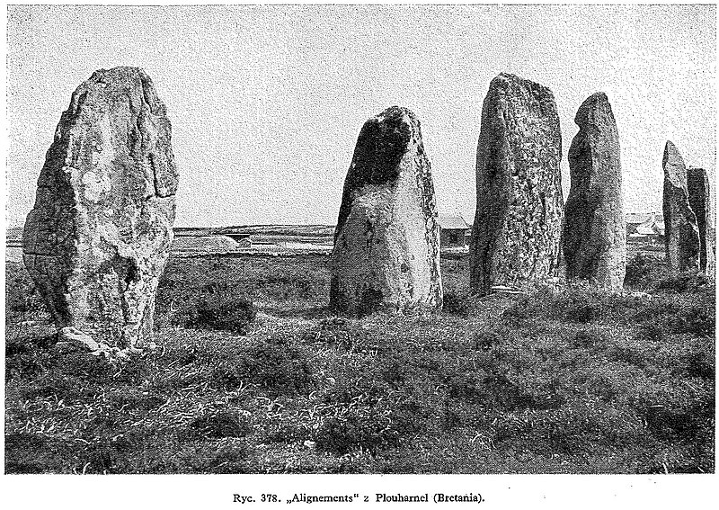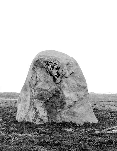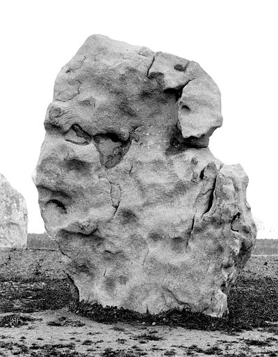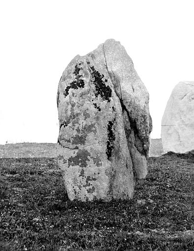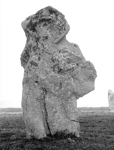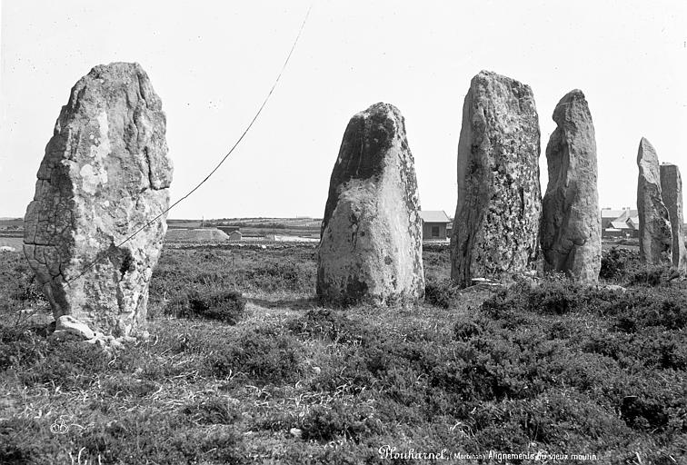 Les alignements du Vieux-Moulin, à Plouharnel (Morbihan), se composent de deux groupes de menhirs. Ils figurent déjà sur le relevé topographique de Murray Vicars en 1832 et sont mentionnés par L. Rosenzweig en 1863, qui signale trois pierres correspondant à deux menhirs du groupe nord et un du groupe sud. Félix Gaillard acquiert le site pour l'État en 1882-1883, restaure le groupe sud en 1884 et l'alignement est classé sur la liste des monuments historiques de 1889. Dans son inventaire de 1892, Gaillard ne signale cependant qu'un « groupe de trois menhirs dont un renversé ». Le toponyme renvoie à un ancien moulin implanté au sommet du site, visible sur des photographies de Le Rouzic prises au début du XXe siècle mais aujourd'hui détruit. Le site occupe le versant d'une petite colline et comprend deux groupes de pierres alignées, distants d'un peu moins de 100 mètres. Le groupe nord compte quatre menhirs orientés nord-sud, dont l'un est couché. Selon Serge Cassen, le bloc couché serait un fragment de la pierre dressée la plus méridionale qui se serait fracturée lors d'une chute et aurait été redressée par Le Rouzic. Le groupe sud réunit six menhirs, plus petits que ceux du nord, disposés sur un axe sensiblement nord-nord-est/sud-sud-ouest sur environ 12 mètres. Toutes les pierres sont en granite extrait sur place : le granite local est très diaclasé, ce qui a facilité son extraction, et le site présente plusieurs dépressions comblées correspondant à d'anciennes carrières. Le Rouzic rapporte que, au début du XXe siècle, des vestiges d'un tumulus étaient visibles entre les deux groupes. En 1972, R. Minot repère sur l'un des blocs de la file nord une gravure en forme de quadrilatère qu'il interprète comme la représentation « de la déesse de type Mané Bras, avec tête incorporée ». Sur cette même pierre existe une seconde gravure, moins visible en lumière naturelle et en forme de « croissant de lune aplati », que Minot n'avait pas remarquée. Un ensemble de gravures associant ces deux signes, parfaitement identique, est observable sur le menhir de Kermaillard.
