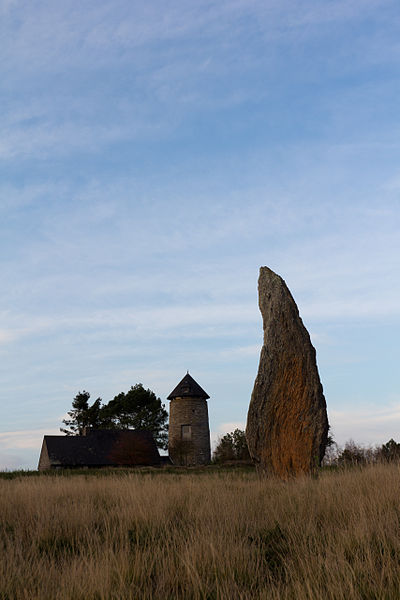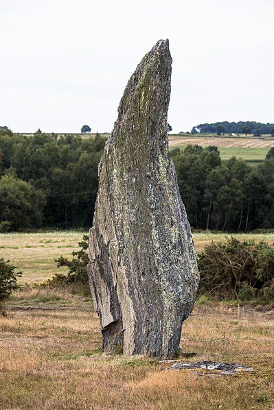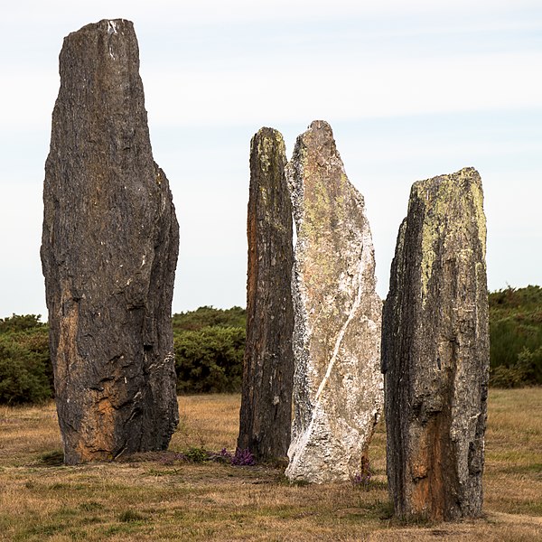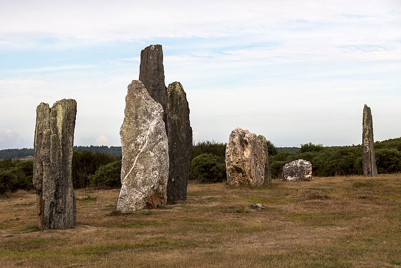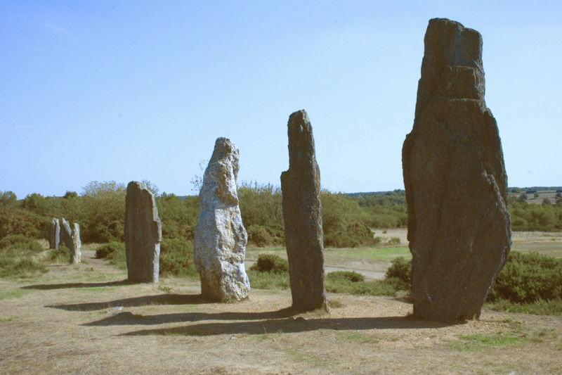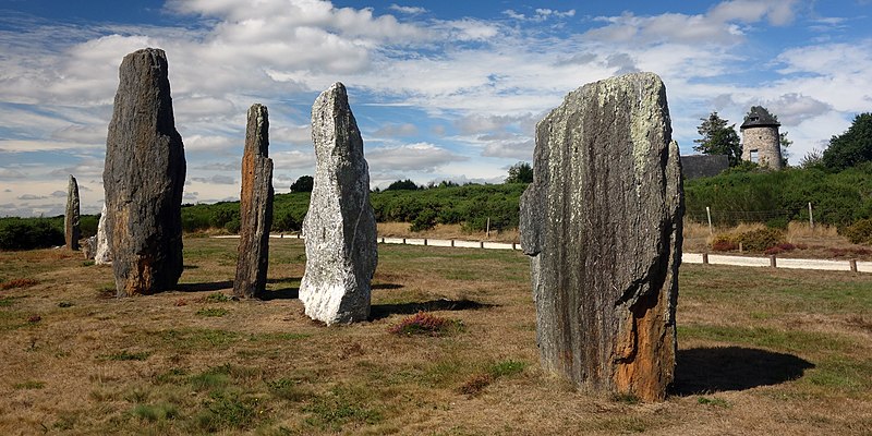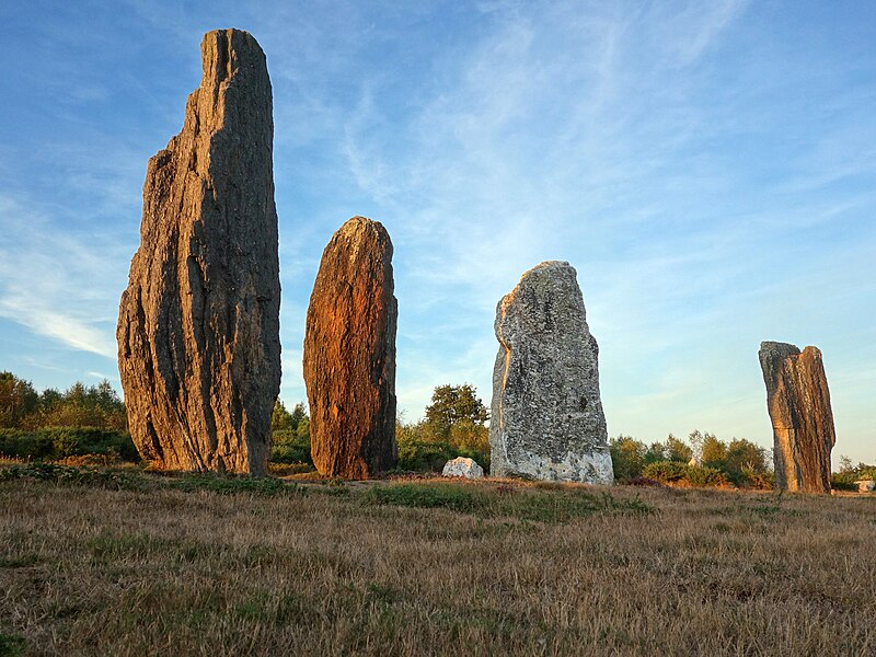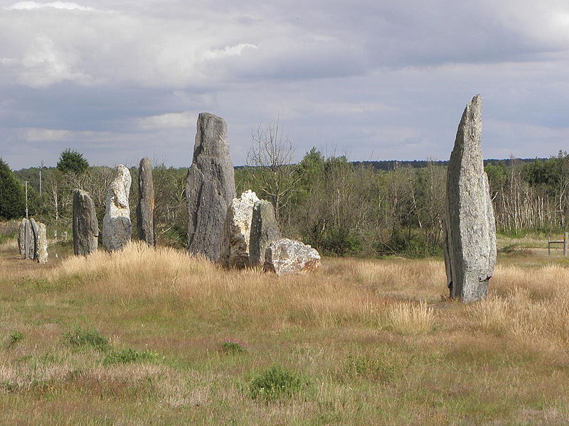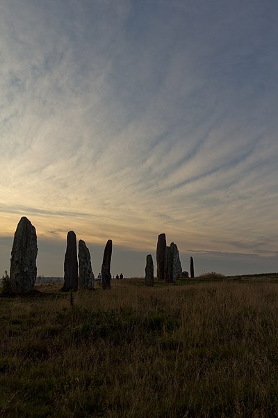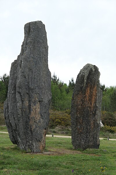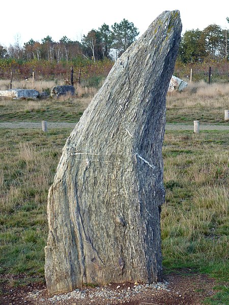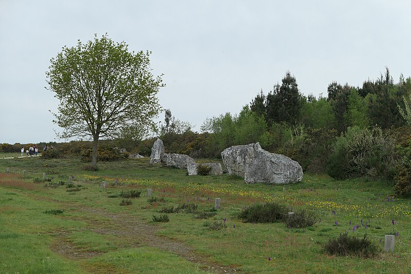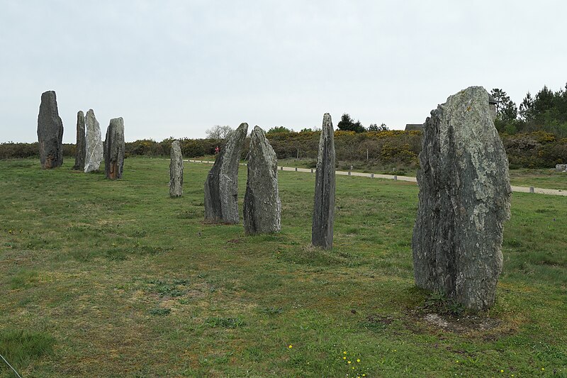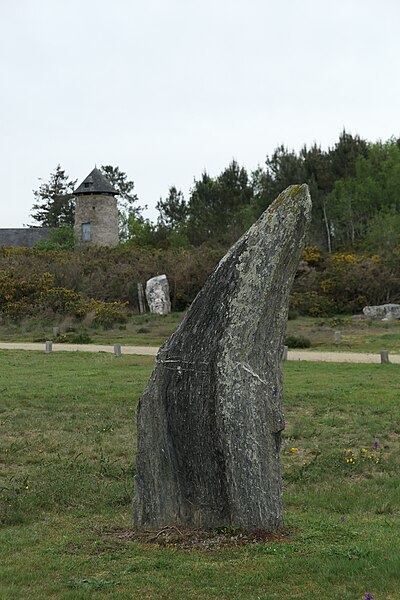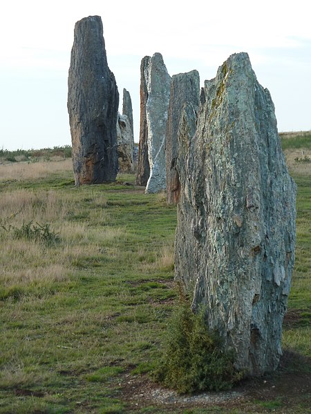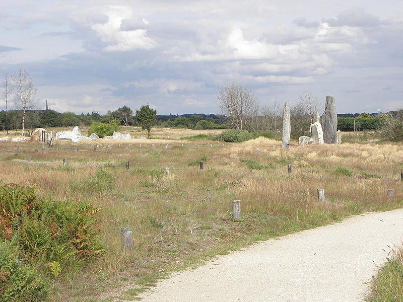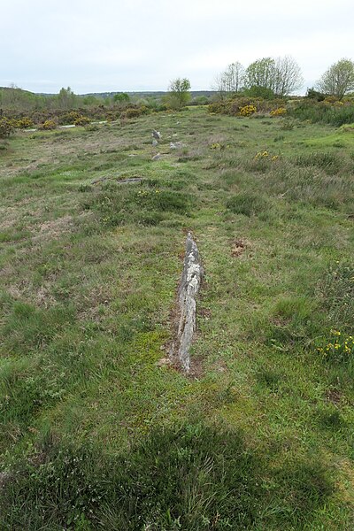 L'alignement B, orienté à l'azimut 117°, s'étend sur environ 270 m et s'élargit sur 70 m. Il comprend treize menhirs de tailles variées, faits de schiste rouge, schiste bleu et quartz blanc, ainsi que huit structures de calage sans menhir. La partie orientale débute par quatre blocs en schiste noduleux d'environ 2 m de hauteur, séparés d'un cinquième bloc un peu plus à l'ouest ; malgré la minceur du sol, ces pierres ont été dressées dans des fosses de calage. La partie centrale contient les plus grands menhirs, jusqu'à 5 m de hauteur, avec des espacements plus irréguliers. À leur base se trouve un massif pierreux de forme amande, large d'environ 6 m à l'est, qui se rétrécit vers l'ouest et se prolonge d'au moins 7 m au‑delà de la file de menhirs. L'alignement B pourrait avoir été construit en deux étapes, la partie occidentale étant la plus ancienne, et des traces de six grands foyers ont été retrouvées au contact du vieux sol. La datation au radiocarbone des charbons recueillis dans ce contexte donne une fourchette comprise entre 4570 av. J.-C. et 4370 av. J.-C.