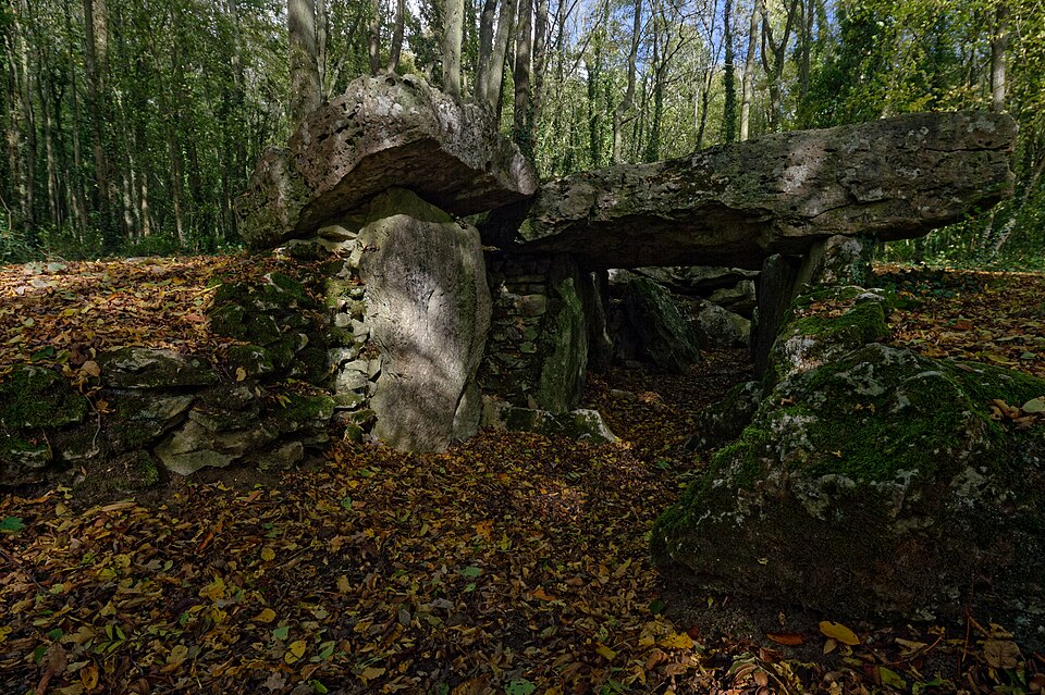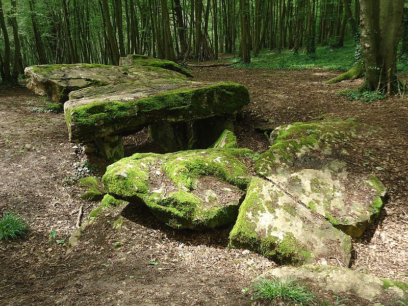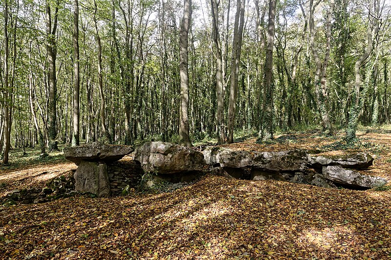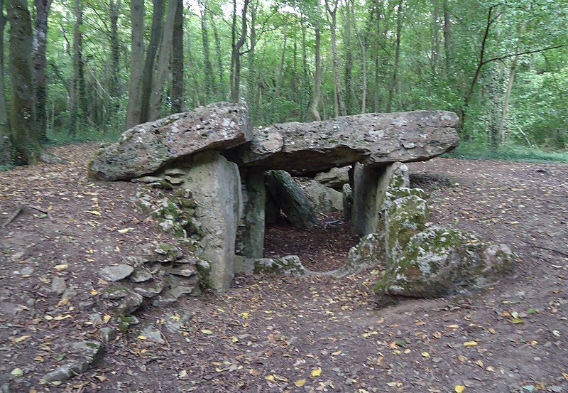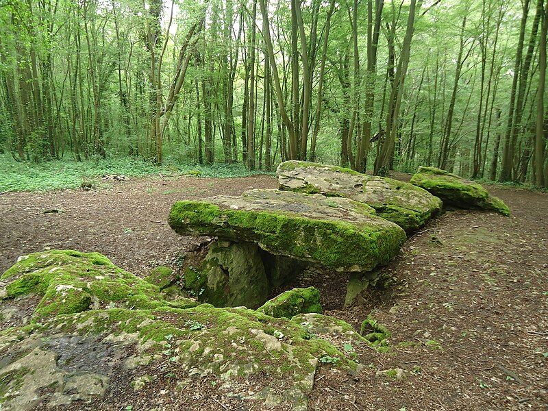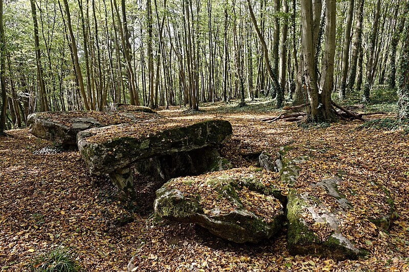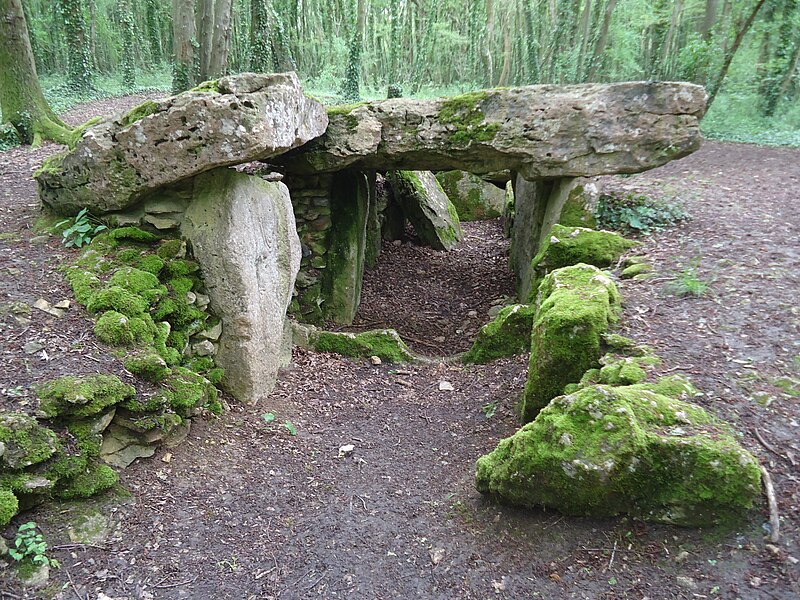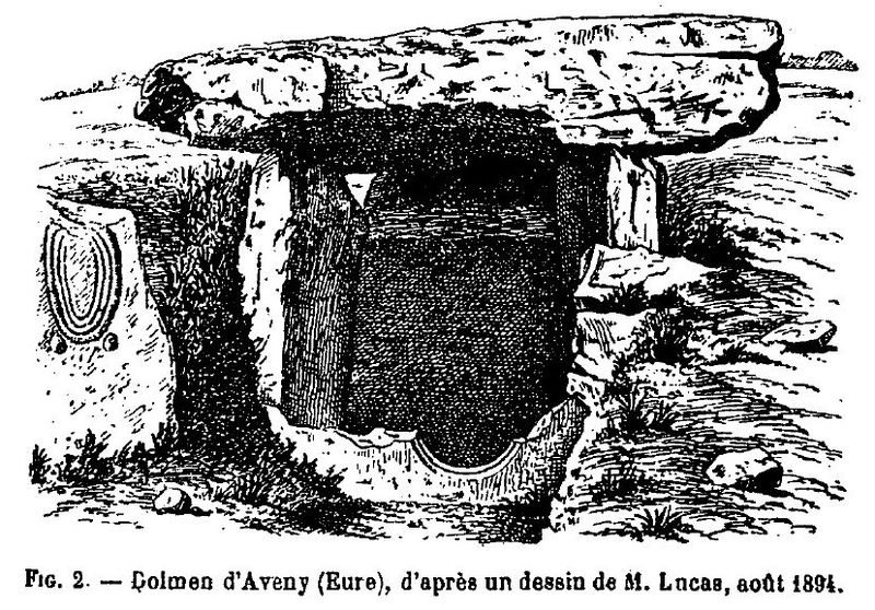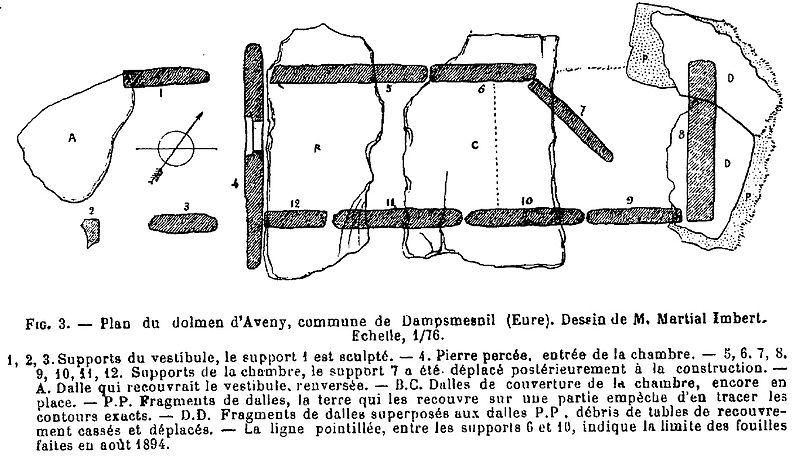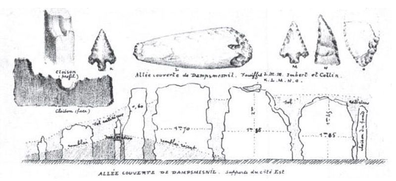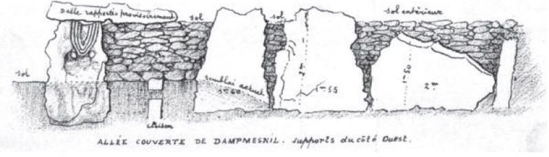 L'allée couverte de Dampsmesnil, située dans la commune de Dampsmesnil (Eure), se distingue par une sculpture gravée sur l'un de ses supports. Le mégalithe se trouve dans le bois de la Garenne, en léger retrait du sommet du versant sud-ouest d'une vallée sèche. L'édifice comprend une chambre et un vestibule orientés au sud-ouest ; sa longueur totale est de 10,5 m, sa largeur moyenne de 1,67 m et la hauteur libre de 2 m, atteignant 2,25 m à l'entrée. Le sol est constitué de dalles plates de pierre brute mesurant environ 0,25 à 0,35 m de long et 0,15 à 0,20 m de large. La chambre, longue de 5,81 m, reposait sur huit supports et était couverte par trois dalles ; deux d'entre elles sont encore en place, tandis que la dalle protégeant le fond de la chambre est brisée et ses fragments sont dispersés sur le site. Le fond de la galerie est fermé par un bloc de 2 m de largeur, 1,80 m de haut et 0,40 m d'épaisseur. Comme dans plusieurs allées couvertes des environs, la chambre est séparée du vestibule par une dalle percée, dont la moitié inférieure a été retrouvée lors des fouilles de 1894 ; cette dalle mesure 2,92 m de long pour 0,23 m d'épaisseur. Le bord inférieur de l'orifice se situe à 0,76 m du dallage et son diamètre est d'environ 0,60 m ; l'orifice est entouré d'une feuillure de 75 mm de profondeur sur 70 mm de largeur, résultant d'un travail soigné et presque circulaire. Cette disposition, identique à celle observée sur des monuments proches, suggère que la dalle percée, fermée par un bouchon de pierre maintenu éventuellement par une poutre, assurait l'étanchéité entre la chambre funéraire et le vestibule, espace probable des cérémonies. Le vestibule mesure actuellement 3 m de long, mais des destructions anciennes laissent incertaine sa longueur originelle ; une seule dalle de couverture a été retrouvée sur place et replacée en 1894 pour protéger le support sculpté. Le premier support à gauche de la dalle percée porte une représentation féminine en relief : une figure ovale encadrée de trois bourrelets concentriques, avec deux protubérances au bas de l'ovale. Des sculptures de même type ont été notées sur d'autres allées couvertes locales et interprétées soit comme la représentation d'une « déesse des morts » ou déesse funéraire, soit comme un indice de l'usage cérémoniel de l'antichambre. Cette sculpture fait de l'allée couverte de Dampsmesnil le seul mégalithe de Normandie présentant un décor gravé ; un moulage en résine réalisé en juillet 1985 est aujourd'hui exposé dans cinq musées. La construction du monument est estimée entre 2 500 et 2 000 ans av. J.-C., période du néolithique final, et les bâtisseurs appartenaient à la culture Seine-Oise-Marne. Le dolmen a été réutilisé à l'époque romaine, période durant laquelle il a été vidé de certains ossements et mobiliers ; la présence d'ossements humains mêlés à des fragments de poterie et des morceaux de tuiles à rebord, ainsi que la découverte d'une pièce en bronze d'aspect romain, montrent qu'il a conservé une fonction sépulcrale. Avant la Révolution, des fouilles entreprises par des chercheurs de trésors n'ont laissé aucun rapport écrit, et au début du XIXe siècle le vicomte de Pulligny rapporte que l'allée mesurait alors 17 m et était encore recouverte de dalles, une dalle percée obstruant le passage ; l'exploitation des carriers a par la suite entraîné la destruction et l'enlèvement de nombreuses dalles. Adrien de Mortillet a publié en 1893 la première description exacte de la gravure, tandis que les fouilles de 1894, menées par Martial Imbert, ont permis de retrouver la moitié inférieure de la dalle percée enfouie à un mètre de profondeur ; des travaux plus complets en 1896, dirigés par Martial Imbert et Émile Collin, ont achevé le déblaiement et le tamisage des déblais. Les campagnes de fouilles ont révélé des restes humains, des fragments de mâchoires et de crâne, ainsi que des vestiges néolithiques et objets divers, parmi lesquels des pointes de flèche à pédoncule et des lames en silex, des haches, un percuteur, des perles en os, des fragments de vases et d'autres petites pièces ; ces trouvailles ont été remises à la Société d'anthropologie de Paris. Le 14 août (lors de la campagne) la dalle effondrée à l'entrée fut replacée au-dessus du support sculpté pour le protéger, puis l'ouverture de la dalle percée fut de nouveau partiellement protégée par une pierre avant de recouvrir les déblais. La campagne a en outre permis d'établir un plan fidèle du mégalithe. L'allée couverte de Dampsmesnil est classée au titre des monuments historiques par arrêté du 28 janvier 1907.