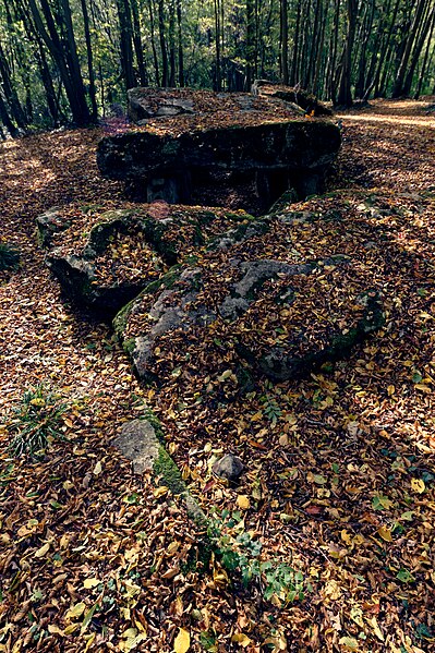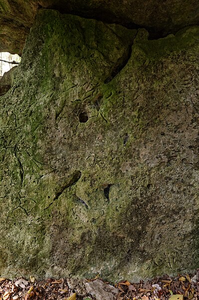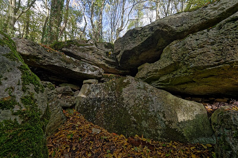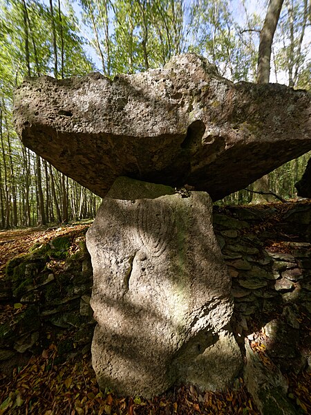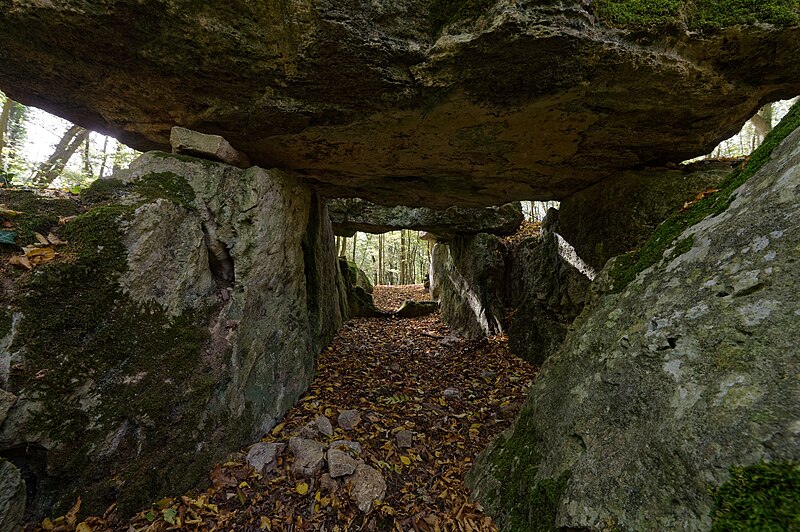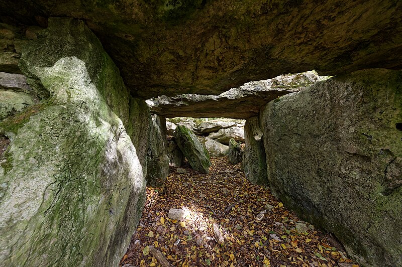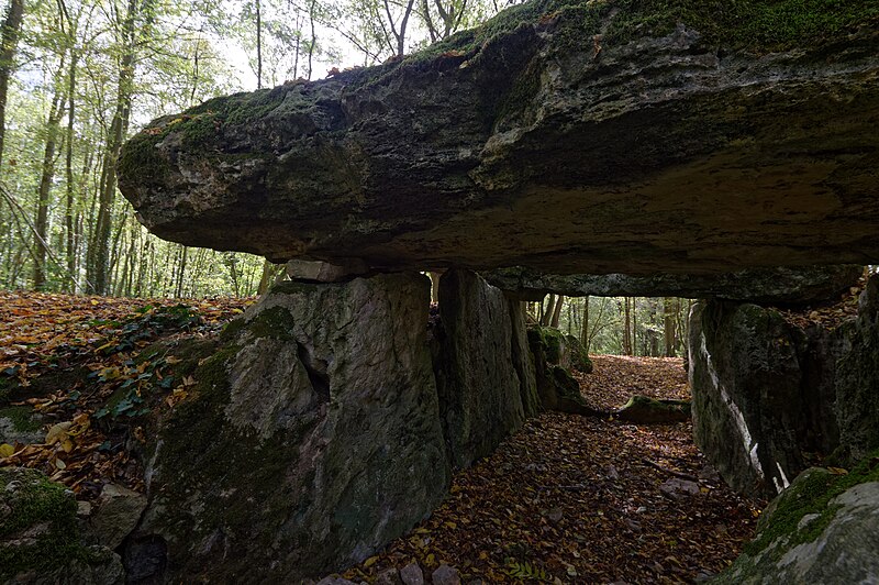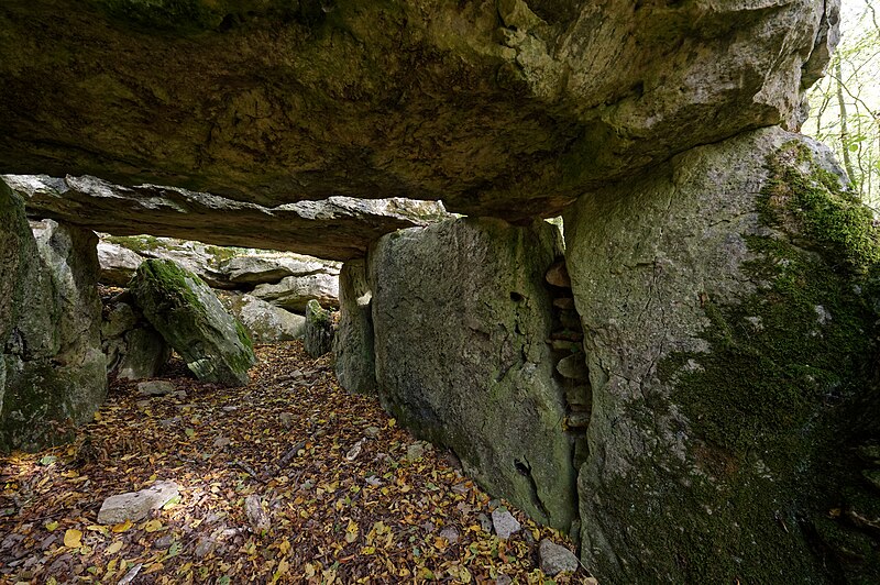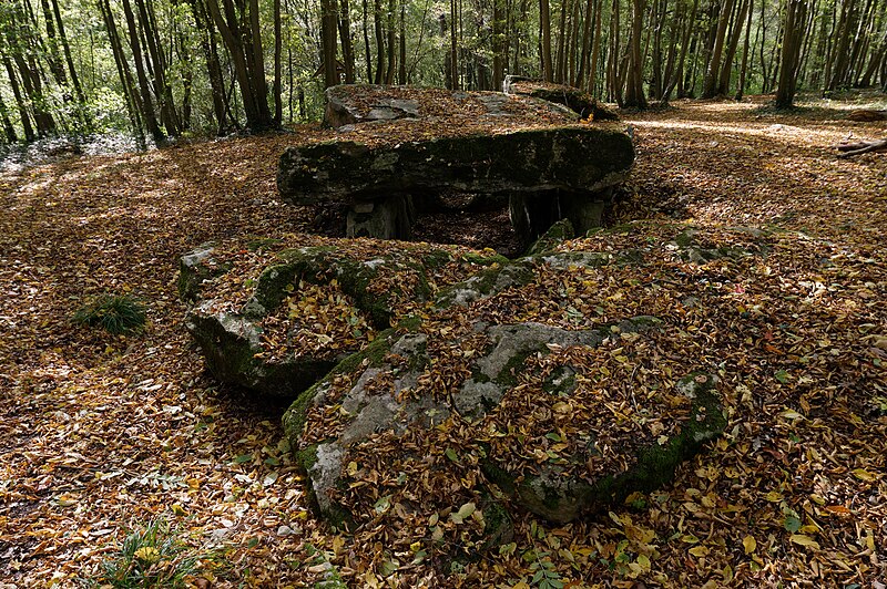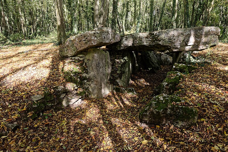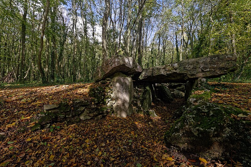 L'allée couverte de Dampsmesnil, située dans la commune de Dampsmesnil (Eure), se distingue par une sculpture gravée sur l'un de ses supports. Le mégalithe se trouve dans le bois de la Garenne, en léger retrait du sommet du versant sud-ouest d'une vallée sèche. L'édifice comprend une chambre et un vestibule orientés au sud-ouest ; sa longueur totale est de 10,5 m, sa largeur moyenne de 1,67 m et la hauteur libre de 2 m, atteignant 2,25 m à l'entrée. Le sol est constitué de dalles plates de pierre brute mesurant environ 0,25 à 0,35 m de long et 0,15 à 0,20 m de large. La chambre, longue de 5,81 m, reposait sur huit supports et était couverte par trois dalles ; deux d'entre elles sont encore en place, tandis que la dalle protégeant le fond de la chambre est brisée et ses fragments sont dispersés sur le site. Le fond de la galerie est fermé par un bloc de 2 m de largeur, 1,80 m de haut et 0,40 m d'épaisseur. Comme dans plusieurs allées couvertes des environs, la chambre est séparée du vestibule par une dalle percée, dont la moitié inférieure a été retrouvée lors des fouilles de 1894 ; cette dalle mesure 2,92 m de long pour 0,23 m d'épaisseur. Le bord inférieur de l'orifice se situe à 0,76 m du dallage et son diamètre est d'environ 0,60 m ; l'orifice est entouré d'une feuillure de 75 mm de profondeur sur 70 mm de largeur, résultant d'un travail soigné et presque circulaire. Cette disposition, identique à celle observée sur des monuments proches, suggère que la dalle percée, fermée par un bouchon de pierre maintenu éventuellement par une poutre, assurait l'étanchéité entre la chambre funéraire et le vestibule, espace probable des cérémonies. Le vestibule mesure actuellement 3 m de long, mais des destructions anciennes laissent incertaine sa longueur originelle ; une seule dalle de couverture a été retrouvée sur place et replacée en 1894 pour protéger le support sculpté. Le premier support à gauche de la dalle percée porte une représentation féminine en relief : une figure ovale encadrée de trois bourrelets concentriques, avec deux protubérances au bas de l'ovale. Des sculptures de même type ont été notées sur d'autres allées couvertes locales et interprétées soit comme la représentation d'une « déesse des morts » ou déesse funéraire, soit comme un indice de l'usage cérémoniel de l'antichambre. Cette sculpture fait de l'allée couverte de Dampsmesnil le seul mégalithe de Normandie présentant un décor gravé ; un moulage en résine réalisé en juillet 1985 est aujourd'hui exposé dans cinq musées. La construction du monument est estimée entre 2 500 et 2 000 ans av. J.-C., période du néolithique final, et les bâtisseurs appartenaient à la culture Seine-Oise-Marne. Le dolmen a été réutilisé à l'époque romaine, période durant laquelle il a été vidé de certains ossements et mobiliers ; la présence d'ossements humains mêlés à des fragments de poterie et des morceaux de tuiles à rebord, ainsi que la découverte d'une pièce en bronze d'aspect romain, montrent qu'il a conservé une fonction sépulcrale. Avant la Révolution, des fouilles entreprises par des chercheurs de trésors n'ont laissé aucun rapport écrit, et au début du XIXe siècle le vicomte de Pulligny rapporte que l'allée mesurait alors 17 m et était encore recouverte de dalles, une dalle percée obstruant le passage ; l'exploitation des carriers a par la suite entraîné la destruction et l'enlèvement de nombreuses dalles. Adrien de Mortillet a publié en 1893 la première description exacte de la gravure, tandis que les fouilles de 1894, menées par Martial Imbert, ont permis de retrouver la moitié inférieure de la dalle percée enfouie à un mètre de profondeur ; des travaux plus complets en 1896, dirigés par Martial Imbert et Émile Collin, ont achevé le déblaiement et le tamisage des déblais. Les campagnes de fouilles ont révélé des restes humains, des fragments de mâchoires et de crâne, ainsi que des vestiges néolithiques et objets divers, parmi lesquels des pointes de flèche à pédoncule et des lames en silex, des haches, un percuteur, des perles en os, des fragments de vases et d'autres petites pièces ; ces trouvailles ont été remises à la Société d'anthropologie de Paris. Le 14 août (lors de la campagne) la dalle effondrée à l'entrée fut replacée au-dessus du support sculpté pour le protéger, puis l'ouverture de la dalle percée fut de nouveau partiellement protégée par une pierre avant de recouvrir les déblais. La campagne a en outre permis d'établir un plan fidèle du mégalithe. L'allée couverte de Dampsmesnil est classée au titre des monuments historiques par arrêté du 28 janvier 1907.