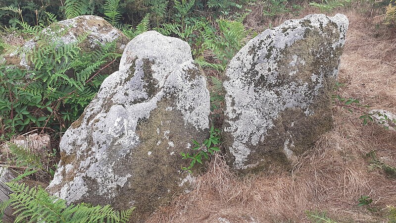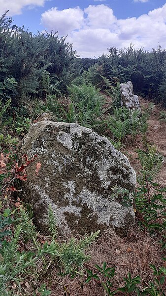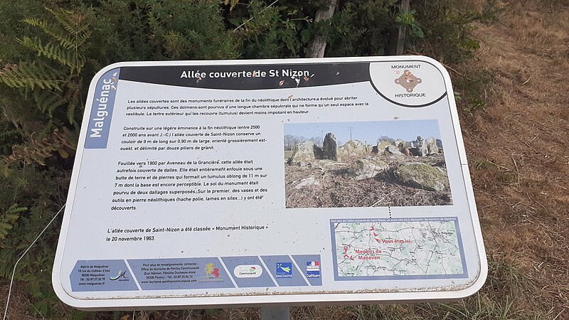 L’allée couverte de Saint‑Nizon se trouve sur la commune de Malguénac, dans le Morbihan. Elle a été fouillée vers 1899‑1900 par Paul Aveneau de la Grancière et classée au titre des monuments historiques par arrêté du 20 novembre 1963. L’édifice est inclus dans un tumulus de 11 m de long sur 7 m de large et orienté est/ouest. L’allée mesure environ 7 m de longueur totale, dont 4,30 m pour le couloir et 2,70 m pour la chambre, avec une hauteur moyenne de 1,60 m. Elle est délimitée par cinq orthostates côté est et quatre côté sud ; la chambre, large de 1,60 m, est plus vaste que le couloir qui fait 0,90 m de large, et une petite cellule terminale occupe l’extrémité sud‑ouest. Toutes les dalles sont en granite d’origine locale ; aucune table de couverture n’a été retrouvée. Lors des fouilles, Aveneau de la Grancière met en évidence une stratigraphie composée, depuis la surface de la chambre, d’une première couche de terre mêlée de pierres d’environ 0,25 cm d’épaisseur reposant sur un dallage de pierres plates d’environ 10 cm d’épaisseur ; sous ce dallage se trouve une seconde couche de terre fine mêlée de cendres, correspondant à la couche archéologique d’environ 10 cm d’épaisseur, elle‑même posée sur un second dallage de 10 cm, puis une couche d’argile foulée d’environ 0,65 cm d’épaisseur reposant sur le sol naturel. La couche archéologique contenait de la cendre et des charbons de bois, quelques débris osseux ainsi qu’un mobilier lithique et céramique varié : une hache polie en diorite, des lames de silex, de grandes lames en quartz façonnées en grattoir, plusieurs percuteurs en quartz et en granite, des galets et fragments en schiste ardoisier, et un fragment de pointe de javelot barbelée en os. Le mobilier céramique se compose d’un vase à fond rond à pâte grossière bien cuite de couleur brune comportant deux petites bosses, d’un autre vase à fond rond en pâte fine assez bien cuite, et d’un vase caliciforme en terre lustrée rouge, à pâte fine et bien cuite, décoré d’impressions de bandes pointillées et de cordelettes.