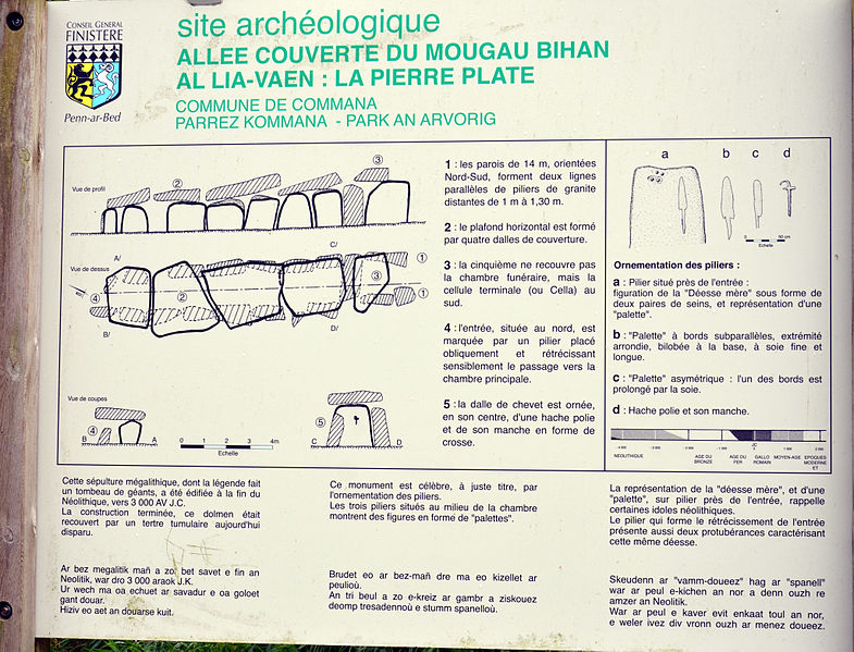 L'allée couverte du Mougau-Bihan, dite aussi Ti Lia Ven ou Al Lia Vaen (« la pierre plate »), se situe à Commana, dans le Finistère. Le monument est mentionné dès 1843 par Jean‑Baptiste Ogée ; il aurait été fouillé au milieu du XIXe siècle, mais les résultats de ces fouilles sont inconnus. La première description publiée est due à Jean‑Marie Abgrall en 1884 et l'allée a été classée au titre des monuments historiques par arrêté du 14 juin 1909. Orientée nord‑sud et ouverte au nord‑nord‑est, l'allée mesure 14 m de long pour une largeur interne comprise entre 1 et 1,40 m. Elle est délimitée par dix‑huit orthostates, dix du côté est et huit du côté ouest. L'édifice se compose d'une chambre rectangulaire de 11 m de long sur 1,50 m de large et d'une cellule terminale rectangulaire de 2,30 m sur 1,40 m. La présence d'un premier pilier débordant au‑delà de la première dalle de couverture suggère l'existence d'un vestibule ; le pilier oriental de l'entrée, placé obliquement, réduit le passage. La chambre et la cellule sont séparées par une dalle de chevet ; l'ensemble est recouvert de cinq dalles de granite (quatre pour la chambre, une pour la cella). Plusieurs dalles portent des sculptures en bas‑relief : le pilier d'entrée montre côté extérieur deux paires de seins superposées et une palette, la dernière dalle de la chambre côté est comporte deux palettes et la dalle de chevet présente au centre la représentation d'une hache polie dont le manche est recourbé en forme de crosse. Ces motifs sont interprétés comme la figuration d'une « déesse mère », de palettes et d'une hache polie. Le monument est daté, par comparaison, entre 3 000 et 2 500 av. J.‑C.