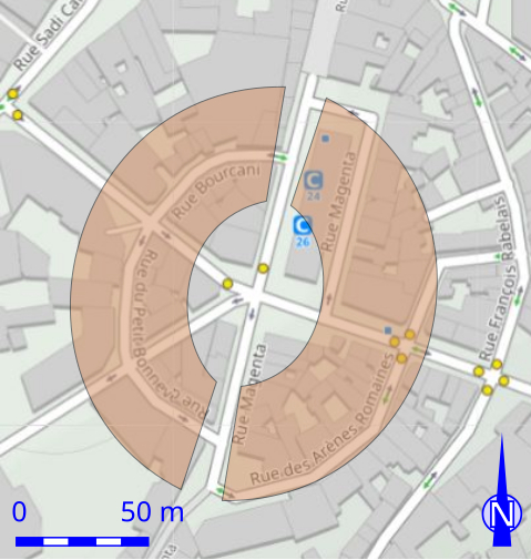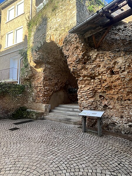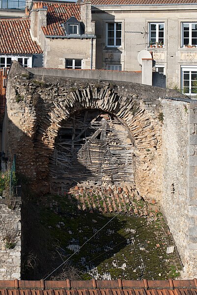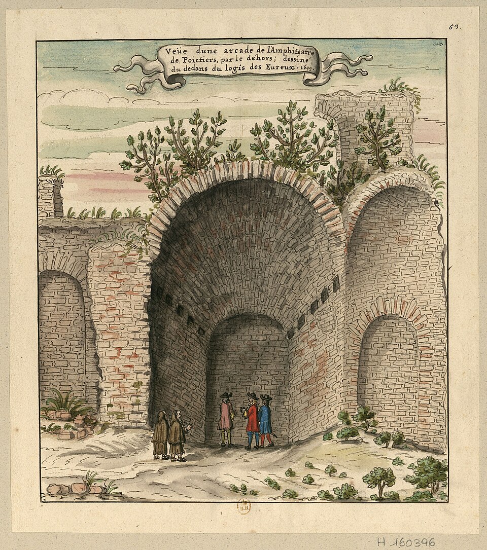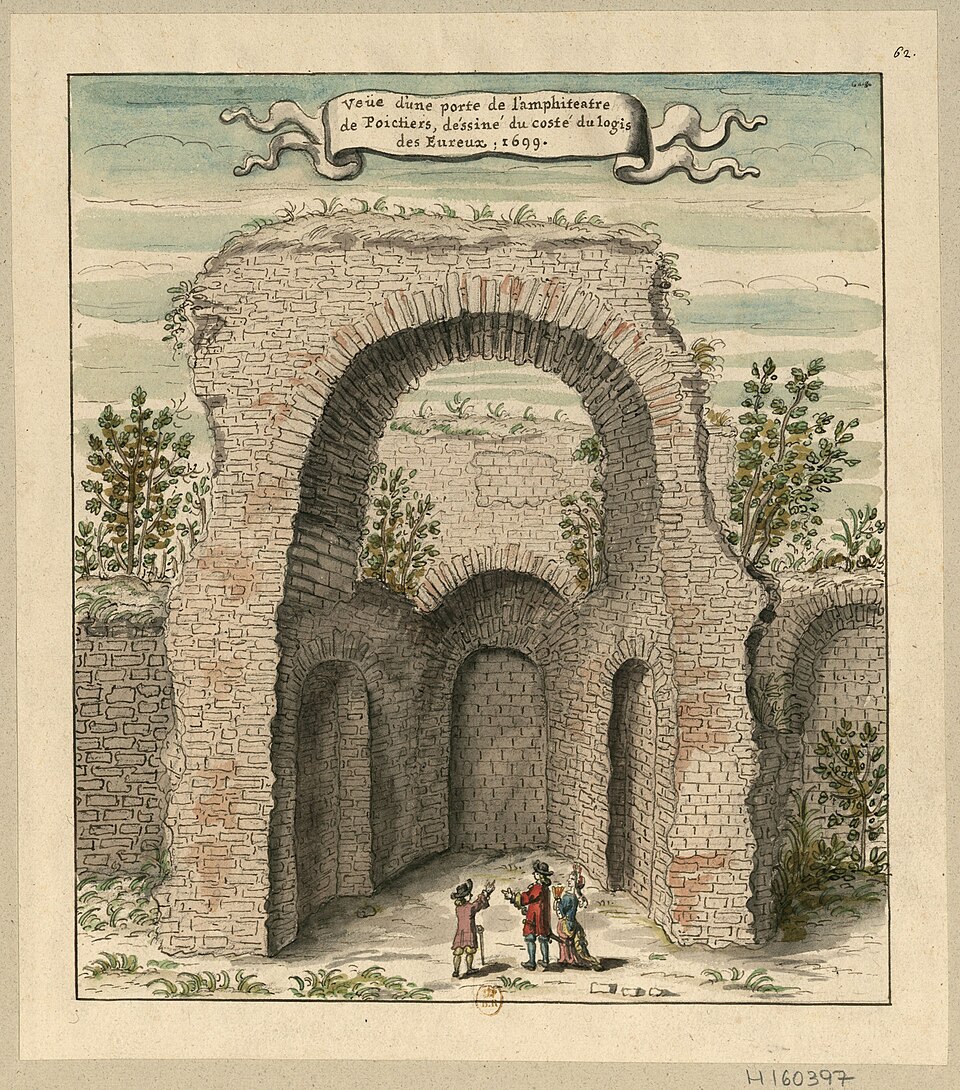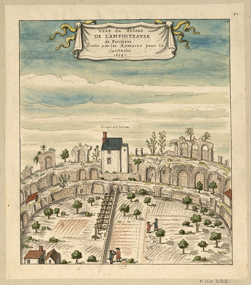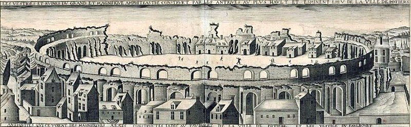L'amphithéâtre de Poitiers, appelé aussi arènes de Poitiers ou Palais Gallien, est un édifice romain implanté hors de la ville antique de Limonum (Poitiers, Vienne). Sa datation fait l'objet d'un débat : la notice du ministère de la Culture et Antonin Bourgnon de Layre l'attribuent au IIe siècle, tandis que Jean Hiérnard et Jean‑Claude Golvin l'estiment dans la première moitié du Ier siècle. L'édifice, de forme elliptique, figure parmi les plus grands amphithéâtres de Gaule. Les dimensions communiquées varient selon les sources, certaines mentionnant 142 × 125 m et d'autres 155,80 × 130,50 m, la hauteur pouvant atteindre environ 35 m depuis le niveau de l'arène jusqu'au sommet. Des estimations anciennes évoquent une capacité comprise entre environ 22 000 et 30 000 spectateurs. L'amphithéâtre se situait au sud de la ville antique, sur un éperon dominant une boucle du Clain au confluent de la Boivre, hors de la zone bâtie, et son grand axe est orienté nord‑nord‑est — sud‑sud‑ouest, en concordance avec la direction des cardines. Dans la voirie moderne, la rue Magenta traverse le site selon ce grand axe et plusieurs rues suivent la courbure de la cavea ou aboutissent au centre de l'arène. À chaque extrémité nord et sud se trouvent de larges vomitoires voûtés et pentus desservant l'arène encaissée, tandis que l'axe est‑ouest comporte deux entrées plus modestes. Les murs rayonnants sont bâtis en petit appareil de moellons réguliers, alors que les murs annulaires présentent un appareil moins soigné, sans recours apparent aux terres cuites architecturales. Les voûtes des arcs sont réalisées avec des pierres plates posées en rayonnement pour épouser leur forme. L'hypothèse d'une façade en grand appareil, totale ou partielle, ne peut être vérifiée faute de vestiges. Les gradins étaient desservis par des galeries à plusieurs niveaux reliées par des escaliers intérieurs ; l'existence d'une galerie périphérique en rez‑de‑chaussée reste incertaine. L'amphithéâtre semble avoir été désaffecté à la fin de l'Antiquité et aurait été transformé en citadelle par les Wisigoths, avant une ruine progressive. Aux périodes médiévale et moderne, l'aire de l'amphithéâtre a été occupée par des habitations et des jardins, des arcades et voûtes subsistant encore au XVIIe et XVIIIe siècles selon des témoignages. Au XIXe siècle, la plupart des structures avaient disparu : en 1844 une seule arcade était visible, et après la vente des restes par les hospices en 1857 des immeubles furent construits sur le site. Les vestiges ont été protégés au titre des monuments historiques à plusieurs reprises (mentionnés en 1840, complétés en 1935 et 1962). Aujourd'hui, des voûtes rayonnantes des premier et deuxième niveaux d'arcatures restent visibles rue Bourcani, et plusieurs éléments de murs et de voûtes sont intégrés aux maisons et caves des rues des Arènes romaines et Magenta. Des représentations et plans anciens, notamment des aquarelles de Louis Boudan (1699) et un plan de Lamotte aîné (1843), ainsi que des études récentes, documentent l'édifice et ses vestiges, mis en valeur par des expositions et travaux scientifiques.