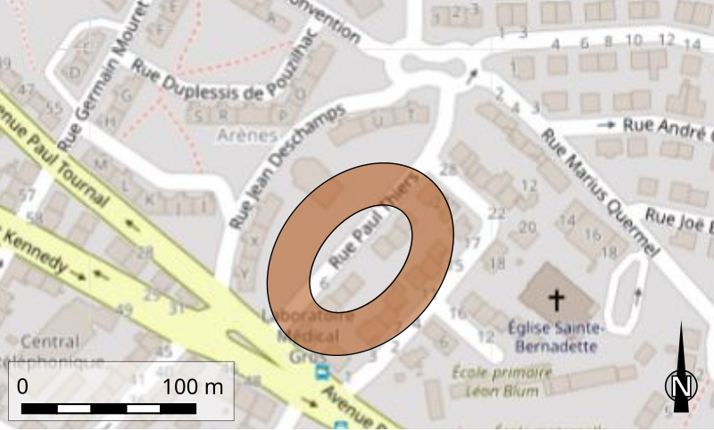 L'amphithéâtre de Narbonne, édifié au IIe siècle dans la ville antique de Narbo Martius (aujourd'hui Narbonne, Aude), occupe la partie orientale de l'agglomération. Il est implanté au contact d'un vaste complexe monumental, peut‑être un sanctuaire ou un campus, et se trouve à près de 800 mètres à l'est de la voie Domitienne qui traversait la cité. Les vestiges sont enfouis et ont été inscrits au titre des monuments historiques en 1943 et 1953. Les études restent incomplètes, mais on lui attribue une cavea de 121,60 × 93,20 m et une arène de 75 × 46,40 m. Dans la ville moderne, l'amphithéâtre se situe immédiatement au nord du carrefour de l'avenue du Président‑Kennedy et de l'avenue Paul‑Tournal ; la courbure de la rue Jean‑Deschamps souligne l'emprise extérieure de la partie nord‑ouest de la cavea. Les premières observations évoquent une construction sous Vespasien, mais il semble que le monument soit un peu plus récent et remonte à Domitien, avec au moins une phase de modifications, peut‑être deux ; sa date d'abandon reste inconnue. Des sondages de 1838 ont permis de lever un plan et de localiser l'édifice sur une zone alors non urbanisée, et au début des années 2000 il a été précisément retracé dans le plan du quartier désormais bâti. L'amphithéâtre a été fondé sur une couche de remblais destinée à assécher et à rendre le sol imperméable, sans recours à une pente naturelle ; sa structure repose entièrement sur des voûtes rayonnantes complétées par des murs annulaires. Au XIXe siècle, Arcisse de Caumont a signalé que des caves particulières avaient été aménagées dans ces structures. Selon Albert Grenier, le mur périphérique comportait 72 arcades d'environ 2 mètres d'ouverture, et quatre portes placées aux extrémités des axes donnaient accès à l'arène.
