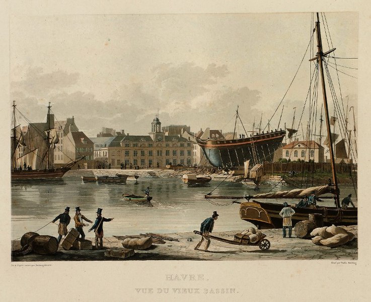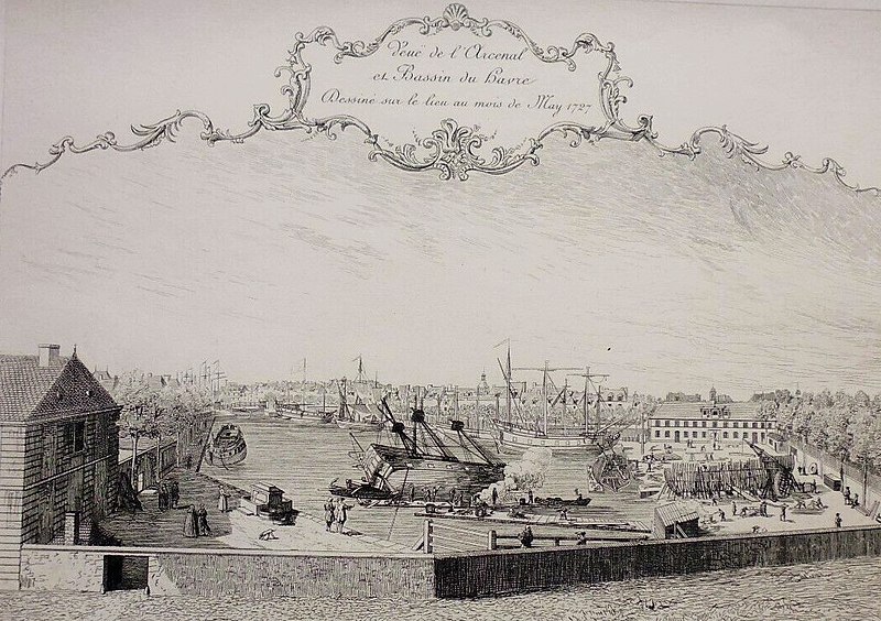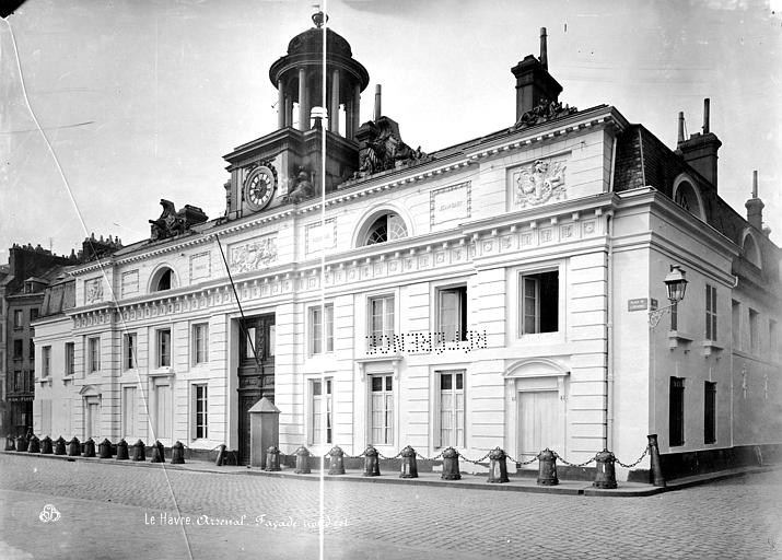 L'ancien arsenal du Havre, installé au début du quai de l'Arsenal à l'angle nord‑ouest du bassin du Roi, fut créé pour doter la Marine Royale des moyens de ses ambitions. Sa mise en place résulte de la volonté du roi Louis XIV et de son ministre Colbert, qui firent du Havre un port de construction navale et ordonnèrent l'édification, autour du bassin du Roi, de quatre bâtiments achevés en 1667 abritant poudrière, entrepôt de matériel et magasin d'armement. Un premier magasin général fut élevé en 1669 à l'emplacement de l'hôpital Hôtel‑Dieu, tandis que le bassin fut remis en état. En 1680, un mur clôtura le bassin pour limiter la divagation des ouvriers et prévenir les vols, plaçant l'ensemble sous juridiction militaire. De 1671 à 1824 l'arsenal resta en activité : plus de 900 navires de tous types y furent construits pour la Marine Royale. De 1776 à 1780 Paul‑Michel Thibaut, architecte de la ville, reconstruisit le magasin général, puis réalisa les fortifications et, une décennie plus tard, la Maison de l'armateur. La prison de l'Arsenal servit aux XVIIIe et XIXe siècles aussi de « dépôt de noirs », centre de rétention où étaient enfermés les esclaves résidant au Havre envoyés par leurs maîtres pour se former en métropole afin d'assurer leur retour forcé aux colonies. Le 15 juillet 1789, au lendemain de la prise de la Bastille, des émeutiers havrais s'emparèrent de l'Arsenal pour s'y fournir en armes et munitions avant de se retrancher dans la Tour François Ier. La suppression du port militaire du Havre en 1824, au profit de Cherbourg et Brest, signa la fin de l'arsenal ; l'année suivante les biens de la Marine furent mis en vente. Le magasin général de 1780, unique vestige du démantèlement, fit l'objet d'un projet de rehaussement en 1934, ce qui provoqua l'intervention de Georges Priem auprès du maire Léon Meyer pour obtenir son classement. Il fut classé au titre des monuments historiques par arrêté du 30 juillet 1934. Pendant la Seconde Guerre mondiale l'arsenal fut occupé par la Wehrmacht et employé à diverses fonctions, notamment comme prison. Les bombardements de 1944 le détruisirent ; il ne subsiste aujourd'hui que la porte sculptée, conservée au musée André Malraux, et la sphère armillaire du campanile, conservée aux Archives municipales du Havre. Le magasin général reconstruit par Thibaut présentait une façade en pierres de taille calcaires, ornée d'une horloge, de cartouches à l'effigie de marins et surmontée d'un péristyle dont la cloche rythma longtemps la vie des ouvriers du port. Des représentations de l'arsenal et du bassin du Roi figurent dans des vues de 1727 et de 1820, la porte sculptée restant le seul vestige matériel visible aujourd'hui.