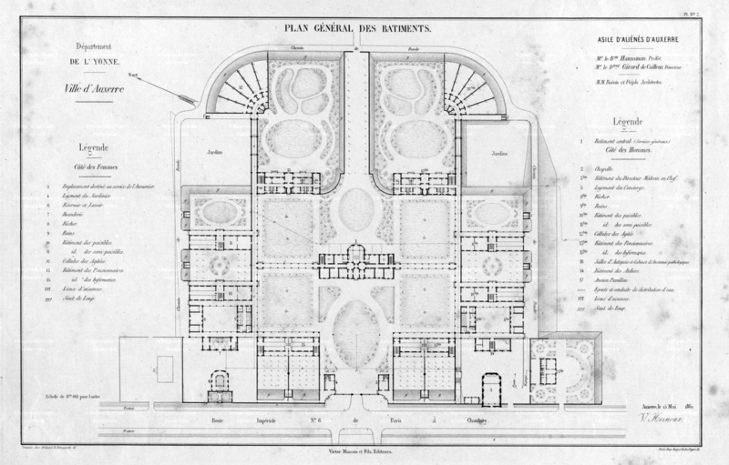 L'ancien asile des aliénés, aujourd'hui Centre Hospitalier Spécialisé de l'Yonne, a été implanté en 1840 sur l'emplacement de l'ancien hôpital général et agrandi en 1860. Conçu par le docteur Jacques-Henri Girard de Cailleux selon les principes d'un hôpital pavillonnaire, l'ensemble se compose de pavillons à deux étages disposés parallèlement et séparés par des cours plantées, avec un bâtiment central abritant l'administration et la chapelle. Les pavillons, reliés par des galeries couvertes soutenues par colonnes ou pilastres d'inspiration néo-classique, étaient organisés selon le programme thérapeutique de Girard de Cailleux, inspiré par la théorie d'Esquirol : des bâtiments isolés pour séparer les malades selon les pathologies ; deux pavillons à l'extrémité est accueillaient autrefois les cellules des agités. La réalisation du projet fut confiée aux architectes Jean Boivin puis M. Piéplu ; les travaux commencés au début des années 1840 s'achevèrent vers 1858 avec le soutien du baron Haussmann, alors préfet de l'Yonne. L'Asile d'Auxerre servit de modèle pour d'autres établissements, notamment pour des constructions réalisées dans les années 1860 en banlieue parisienne.