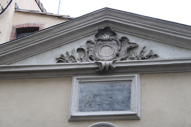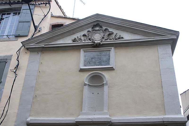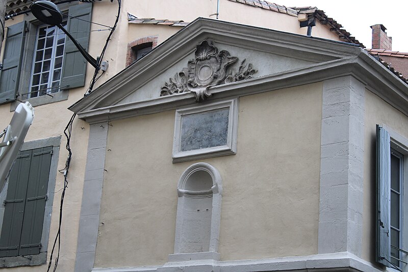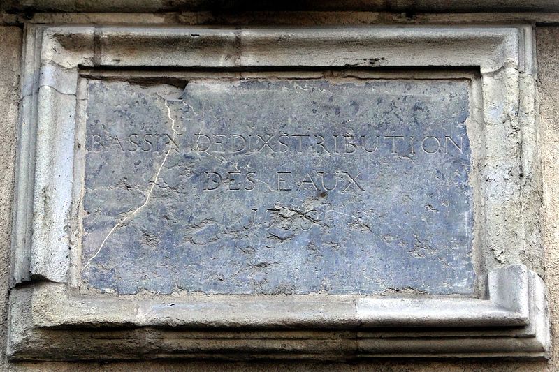 La façade présente un grand fronton triangulaire suivant la pente du toit ; l'intérieur de ce fronton est orné d'un cartouche ovale surmonté d'une coquille et encadré de rameaux de feuillage. Sous ce décor, un cadre rectangulaire en relief porte l'inscription gravée « Bassin de dixstribution des eaux 1756 ». Encore en dessous, une niche à encadrement en plein cintre, qui a pu contenir une statue de la Vierge, ponctue la composition.