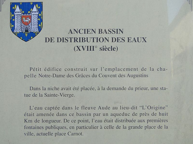 L'ancien bassin de distribution des eaux se situe à Carcassonne, à l'intersection des rues de Verdun et des Études, sur un point élevé de la ville qui permettait d'alimenter par gravité les secteurs de la « ville basse ». Après la construction de la prise d'eau dite de l'Origine, distante de plusieurs kilomètres, le développement des fontaines publiques et des branchements particuliers rendit nécessaire un bassin de répartition. Les Augustins vendirent à la ville une petite maison de leur enclos ; le toisé en vue de l'achat fut réalisé en 1750 et la construction achevée en 1756. En 1775, ce bassin comportait cinq soupasses desservant la paroisse Saint-Vincent, la place, les faubourgs et la paroisse Saint-Michel. Abandonné au XIXe siècle après la mise en service de la prise d'eau de Maquens et des réservoirs de Grazaille, le bâtiment fut transformé en maison particulière. Il est inscrit au titre des monuments historiques par arrêté du 29 mai 1947.
