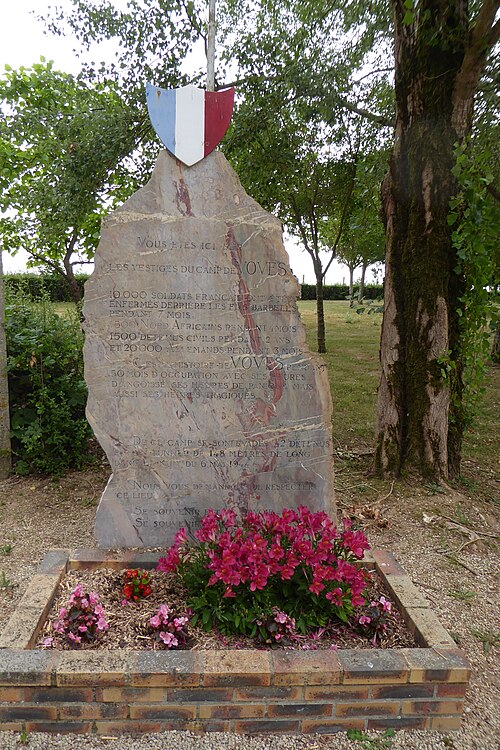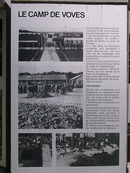 Le camp de Voves, en Eure-et-Loir, a été aménagé en 1939 pour accueillir un centre d'instruction de la DCA. En 1940-1941, l'armée allemande l'a transformé en camp de prisonniers de guerre (Frontstalag n°202), y installant baraquements, double clôture de fils barbelés, miradors et dispositifs armés. Il aurait retenu environ 7 000 prisonniers, parmi lesquels Jacques Benoist-Méchin et Jean Lefebvre. Après le transfert des prisonniers métropolitains en Allemagne, le site a accueilli des prisonniers nord-africains entre mars et juin 1941. Restitué aux autorités françaises en 1942, il est aménagé en centre de séjour surveillé n°15 et reçoit des militants politiques et syndicaux, principalement communistes, venus notamment des camps d'Aincourt, de Choisel, de Rouillé, de Gaillon, de Pithiviers et d'Écrouves, ainsi que de prisons et de la préfecture de police. Le camp, situé au sud de la bourgade de Voves, était divisé en deux parties en trapèze séparées par la route départementale : le camp des internés, à l'est, d'environ sept hectares et 85 ares, et le quartier administratif ou « camp des gendarmes », à l'ouest, d'environ un hectare et trois ares. Cinquante-deux baraques furent construites, dont quarante-cinq dans le camp des internés, qui en occupait vingt-deux. Selon le Comité du souvenir, 2 040 hommes ont transité par Voves entre janvier 1942 et mai 1944. Le camp n'a pas été le lieu d'exécutions sur place mais a servi de réserve d'otages et de point de transfert vers les camps de la mort : dès le 10 mai 1942, 81 internés furent dirigés vers Compiègne puis Auschwitz dans le convoi dit des 45 000, et le 12 octobre 1943, 42 internés furent envoyés à Mauthausen via le fort de Romainville. Malgré la dureté de l'internement, les détenus maintinrent une forte solidarité et organisèrent, avec l'autorisation de l'administration, un théâtre, une « université » proposant des cours (français, anglais, mathématiques, géographie, sciences naturelles) et des activités sportives. À partir du 18 juillet 1942, des évasions eurent lieu : la première libéra quatre internés, et au total vingt évasions permirent à 82 détenus de rejoindre la Résistance. Frédéric Sérazin s'évade en septembre 1943 lors d'un séjour à l'hôpital de Chartres. Entre le 19 février et la nuit du 5 au 6 mai 1944, des internés creusèrent clandestinement un tunnel de 148 mètres ; 42 hommes y trouvèrent la sortie lors de la grande évasion. Selon André Thibault, l'expérience du creusement aurait inspiré John Sturges pour son film La Grande Évasion. La fuite par le tunnel précipita la liquidation du camp : les Allemands intervinrent et, le 9 mai 1944, les SS embarquèrent les 407 internés restants dans des wagons à bestiaux pour les déporter via Compiègne vers Buchenwald puis Neuengamme. Au total, 605 internés de Voves furent déportés vers les camps de concentration et d'extermination ; 194 en revinrent, d'après le comité du souvenir. Après la Libération, le site fut réutilisé de 1944 à 1947 comme dépôt de prisonniers de guerre de l'Axe n°502 pour des soldats allemands. Le camp s'agrandit et, selon l'abbé Portal, jusqu'à 20 000 détenus étaient gardés sur 80 hectares en septembre 1944 par l'armée américaine ; les effectifs diminuèrent ensuite rapidement (11 000 en avril 1945, 1 500 en juillet 1945) et les derniers prisonniers quittèrent les lieux le 19 avril 1947 après avoir participé au démontage des installations. En 1945, les survivants fondèrent l'Amicale de Châteaubriant-Voves, devenue l'Amicale de Châteaubriant-Voves-Rouillé-Aincourt. Des rencontres d'anciens ont conduit à une cérémonie annuelle organisée par le Comité du souvenir chaque mois de mai, commémorant la grande évasion et la liquidation du camp. Le site protégé comprend un mémorial en forme d'obélisque érigé en 1974, un arboretum, une baraque-musée et un wagon-témoin ; parmi les vestiges subsiste la baraque des douches, point de départ du tunnel. Le camp de Voves a été inscrit en 2004 à l'inventaire des monuments historiques.